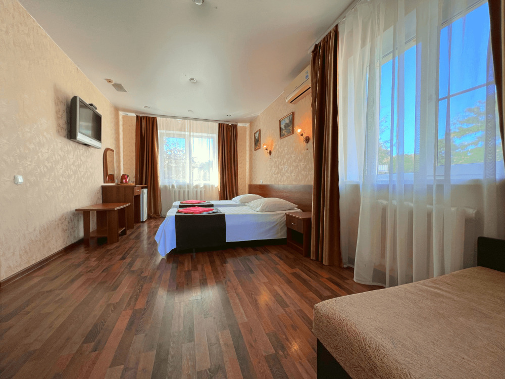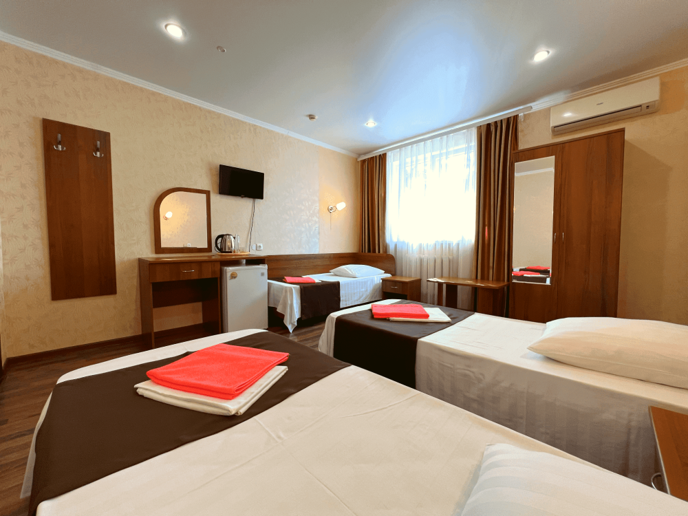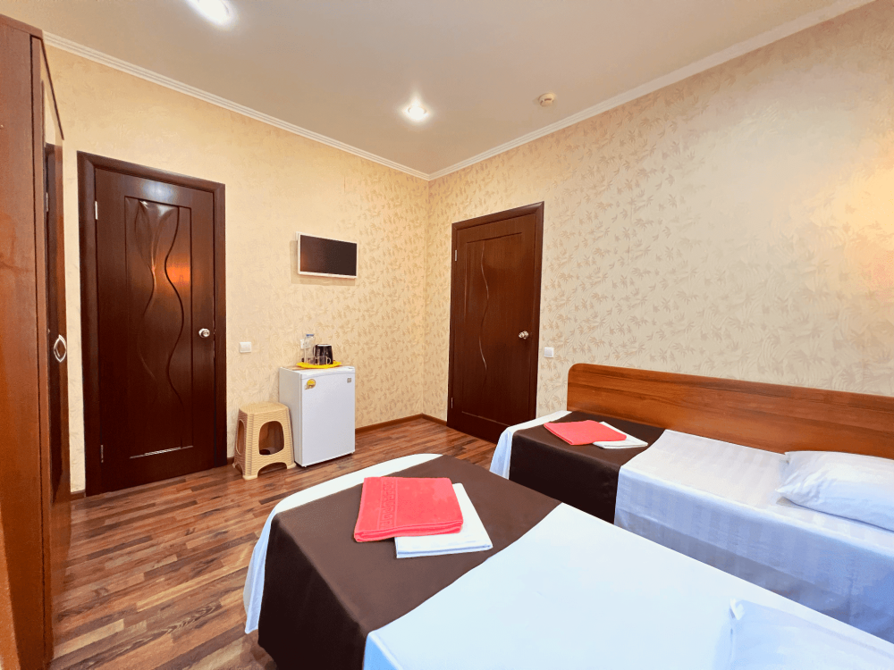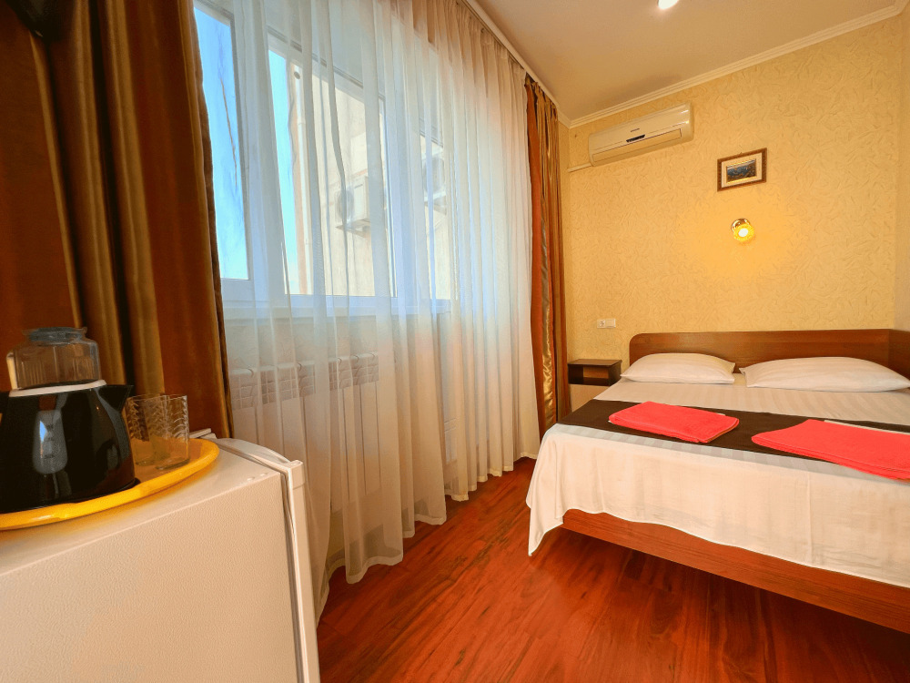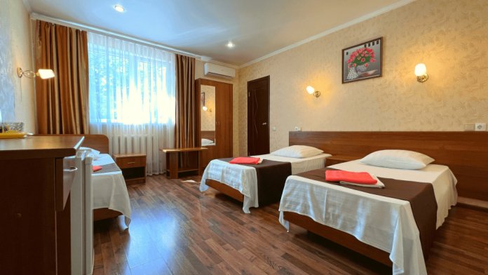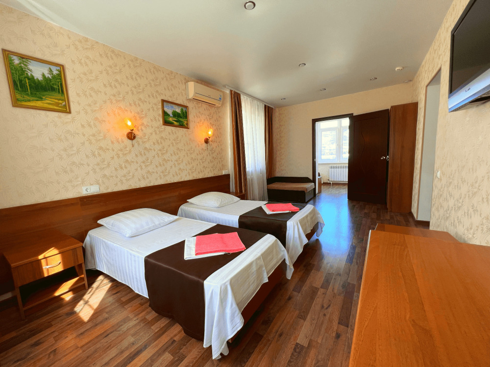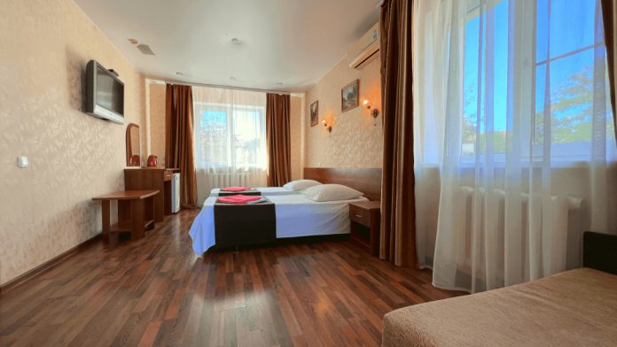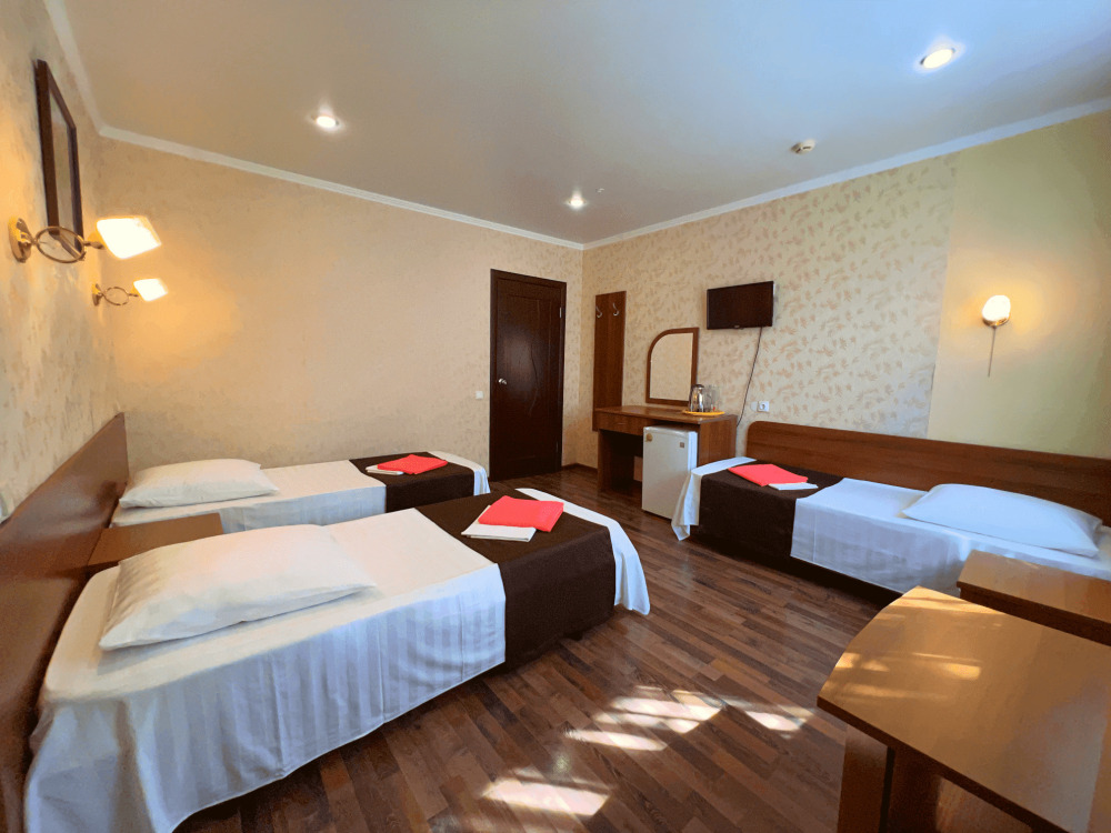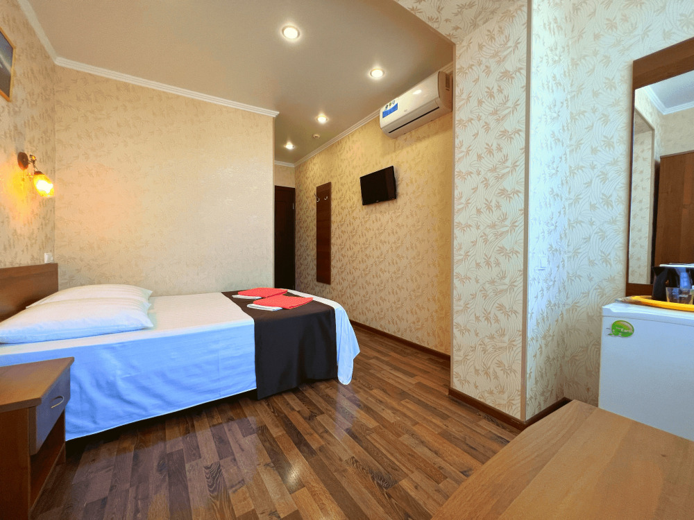 Все номера оборудованы кондиционерами, телевизорами, собственными санузлами с душем.