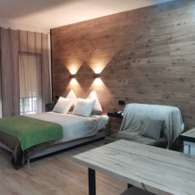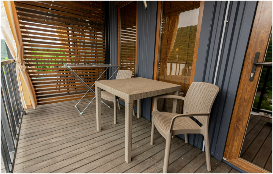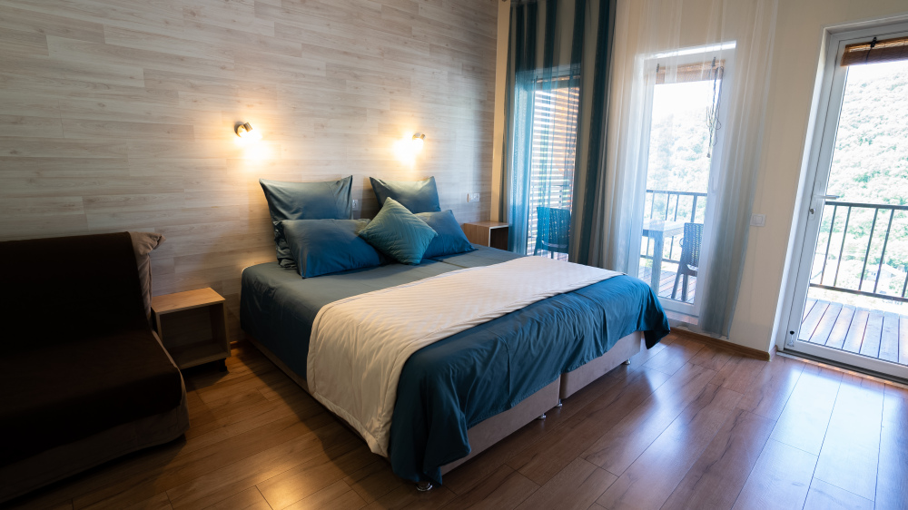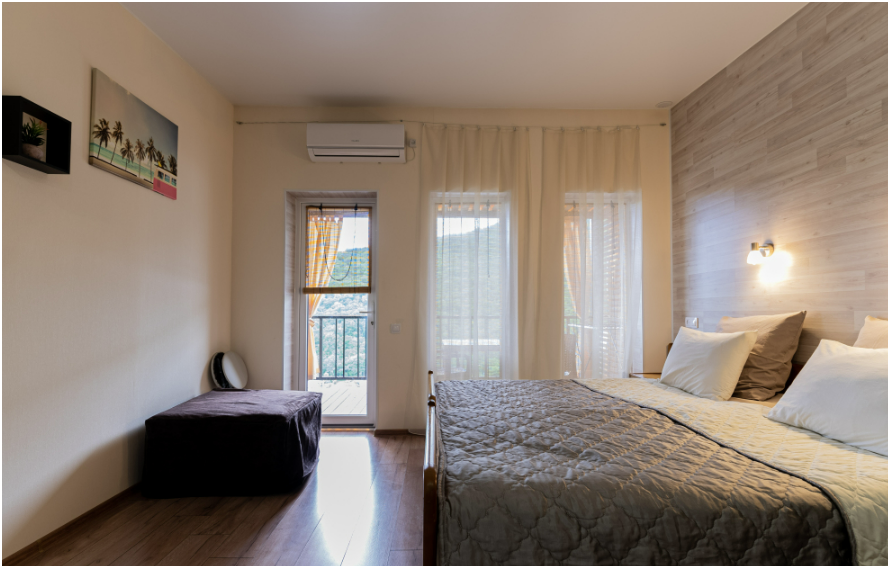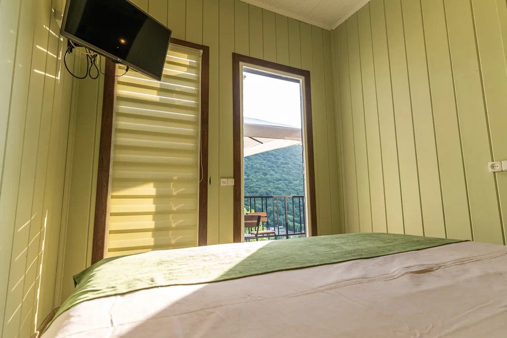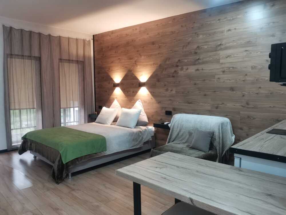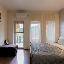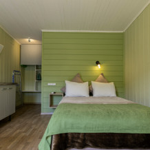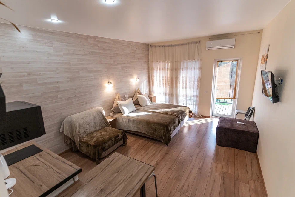 Квартира-студия подходит для 2 или 4 взрослых гостей. Дети допускаются по согласованию с Администрацией. В номере: двуспальная кровать с тумбочками, шкаф, телевизор, гладильная доска, утюг, ванная с душем, санузлом, умывальником, феном и полотенцами. Кухня оборудована варочной поверхностью, холодильником и посудой. Для большего числа гостей предусмотрены 2 кресло-кровати. Из апартаментов открывается вид на горы.
