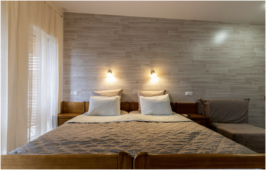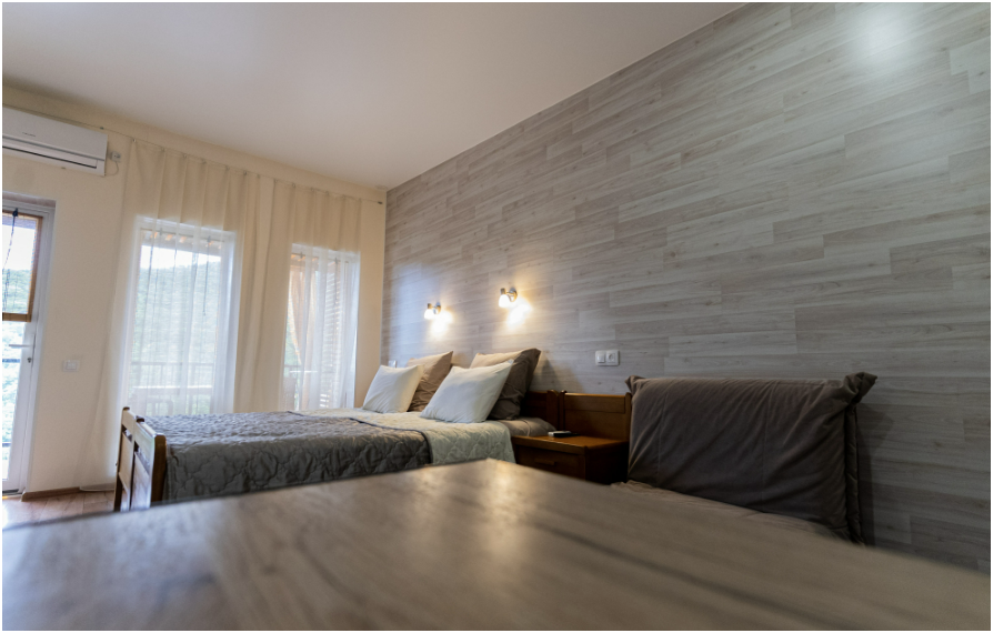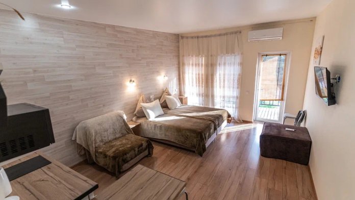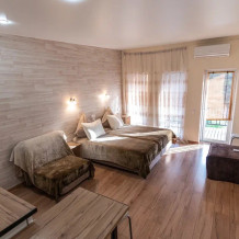 Номера идеально подходят для размещения как 2, так и 4 гостей (с маленькими детьми, только по запросу). Удобные односпальные кровати с прикроватными тумбочками. Ванная комната оснащена всем необходимым (душем, санузлом, раковиной с зеркалом, феном, туалетными принадлежностями). В номере расположена кухня (варочная поверхность на две конфорки, холодильник, раковина и полный комплект посуды). В Номере есть все, что нужно для комфортного проживания. Для проживания более двух человек имеется кресло-кровать и комфортная раскладная кровать.