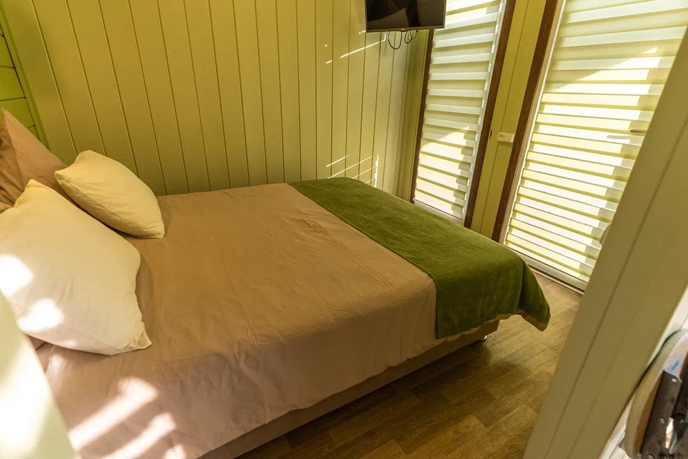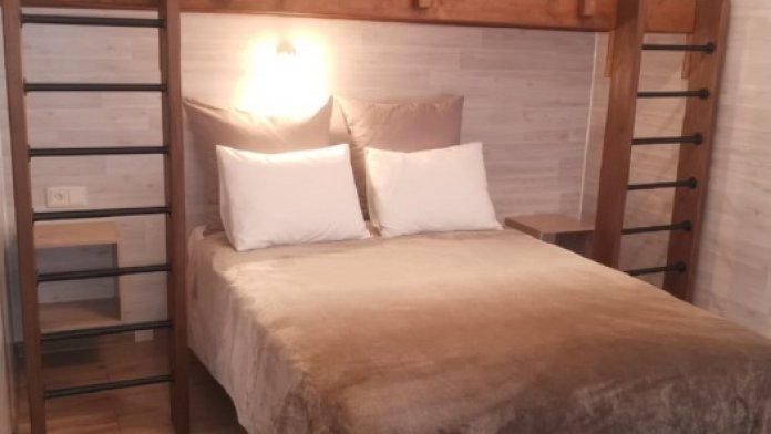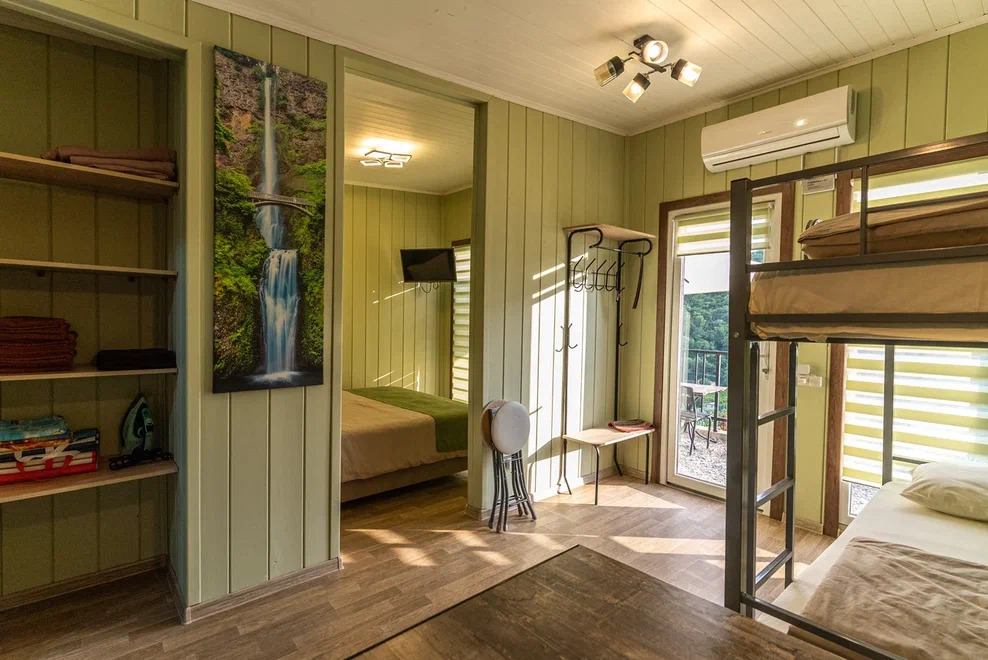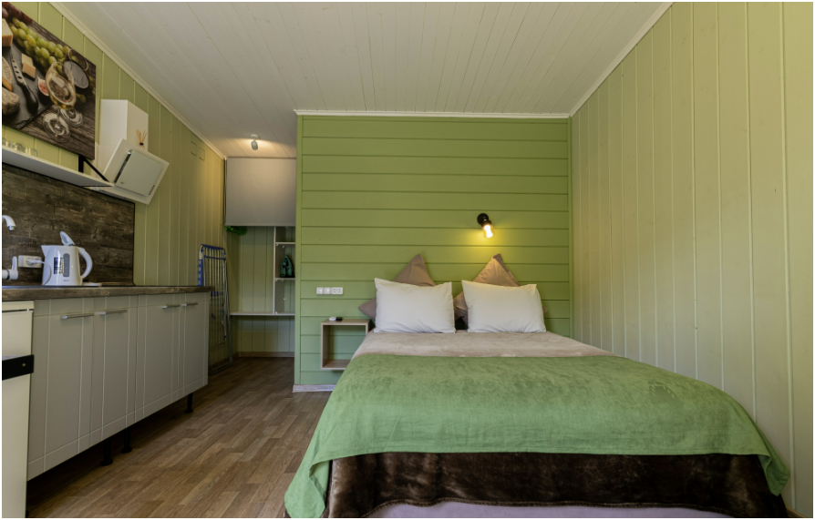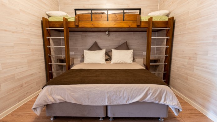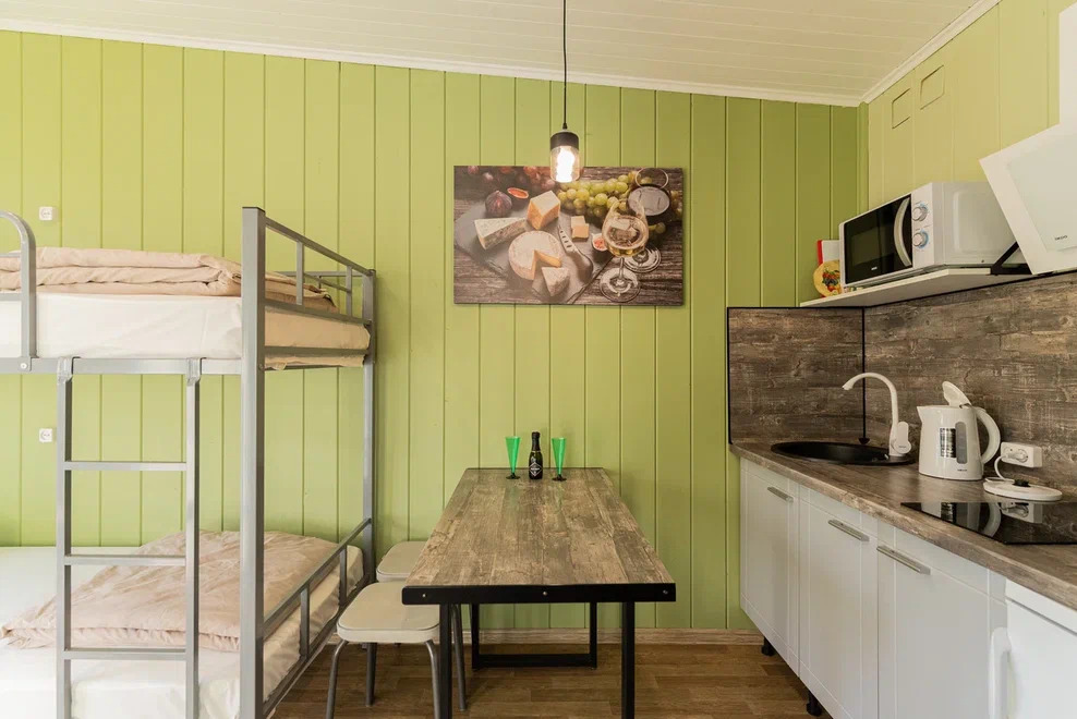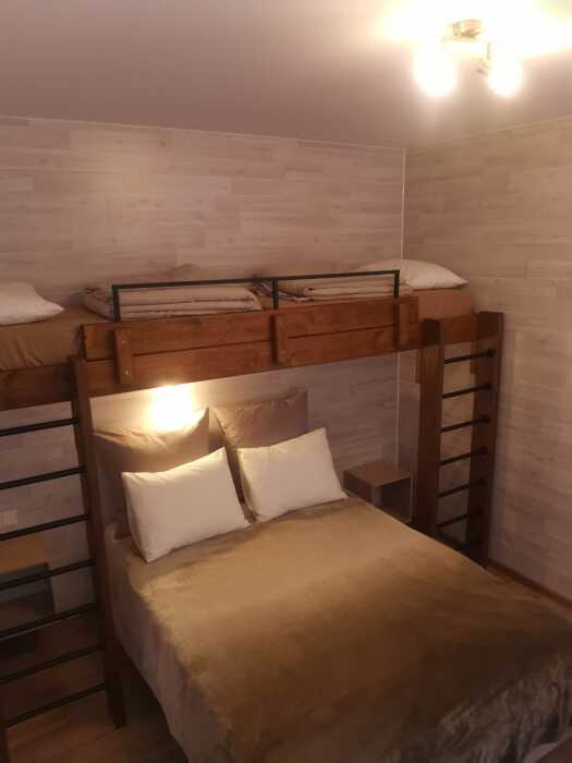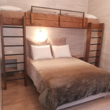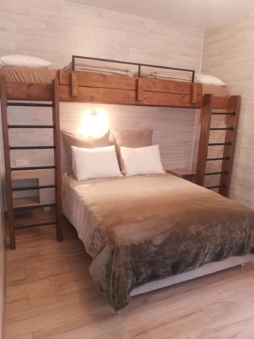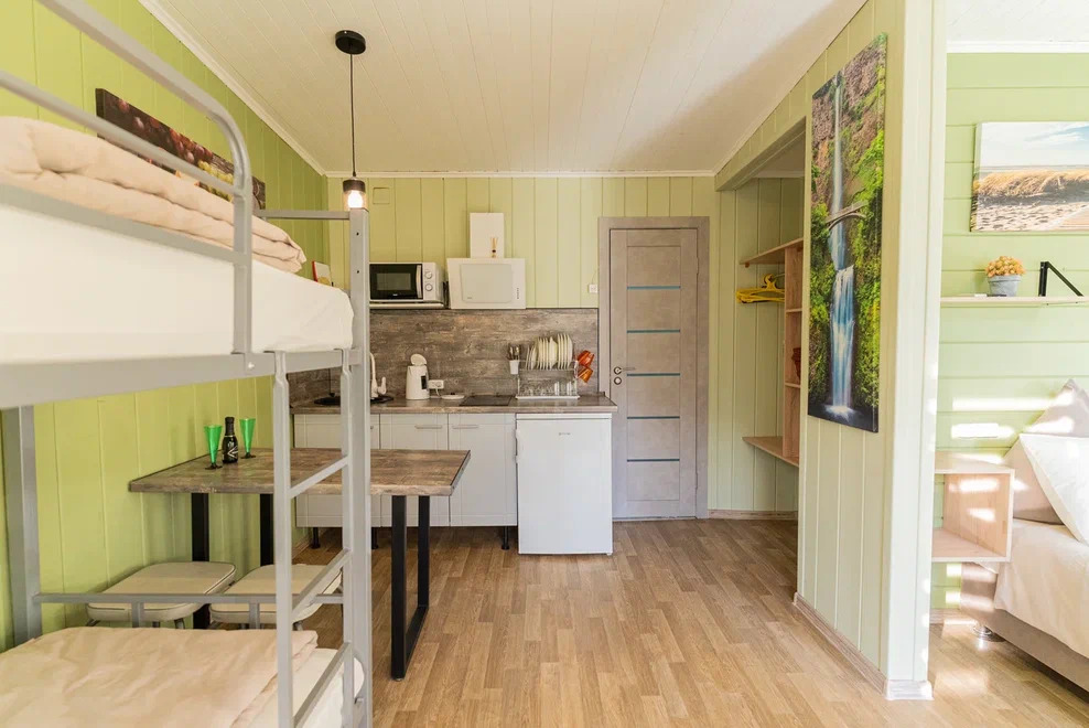 Номера идеально подходят для размещения 4 гостей. Удобная двуспальная кровать с прикроватной тумбочкой, телевизором. Двух ярусная кровать подходит как для взрослых, так и для детей. Ванная комната оснащена всем необходимым (душем. Санузлом, раковиной с зеркалом, феном, туалетными принадлежностями). В номере расположена кухня (варочная поверхность на две конфорки, холодильник, раковина и полный комплект посуды).