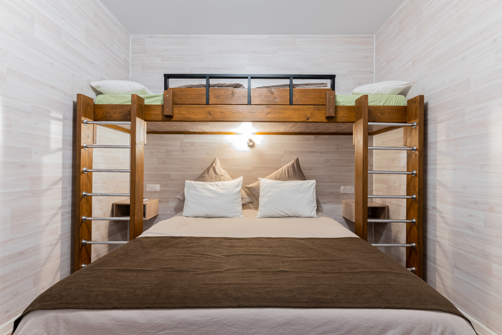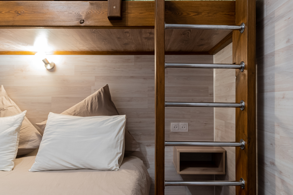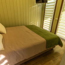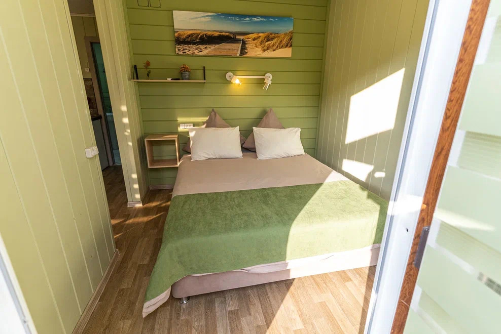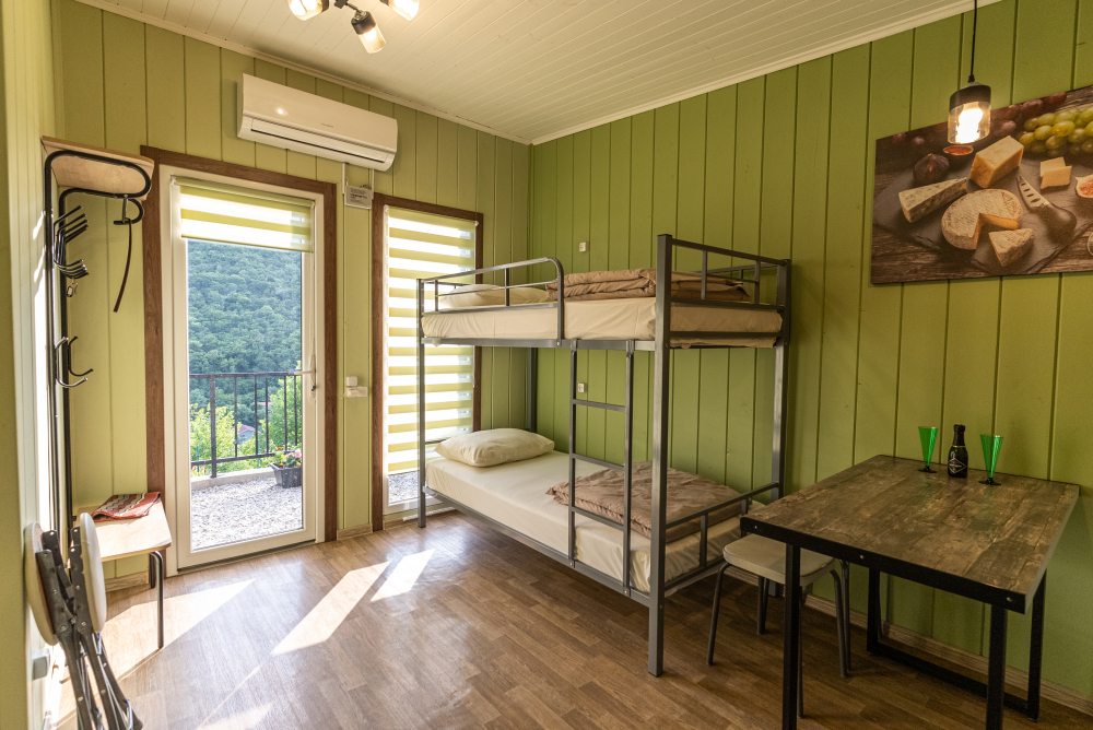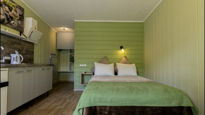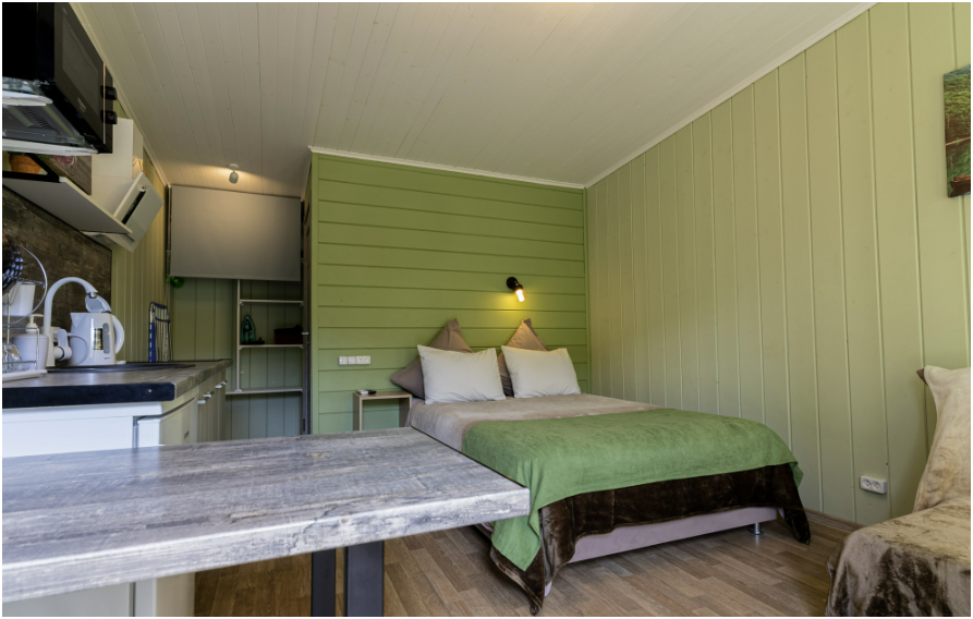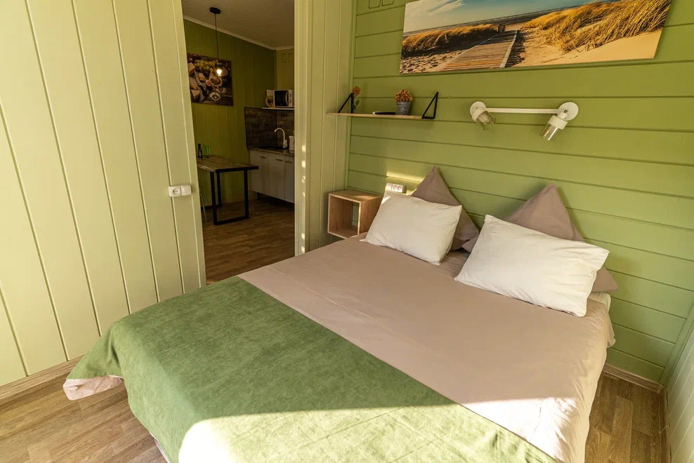 Номера идеально подходят для размещения 4 гостей. Удобная двуспальная кровать с прикроватной тумбочкой, телевизором. Двух ярусная кровать подходит как для взрослых, так и для детей. Ванная комната оснащена всем необходимым (душем. Санузлом, раковиной с зеркалом, феном, туалетными принадлежностями). В номере расположена кухня (варочная поверхность на две конфорки, холодильник, раковина и полный комплект посуды).