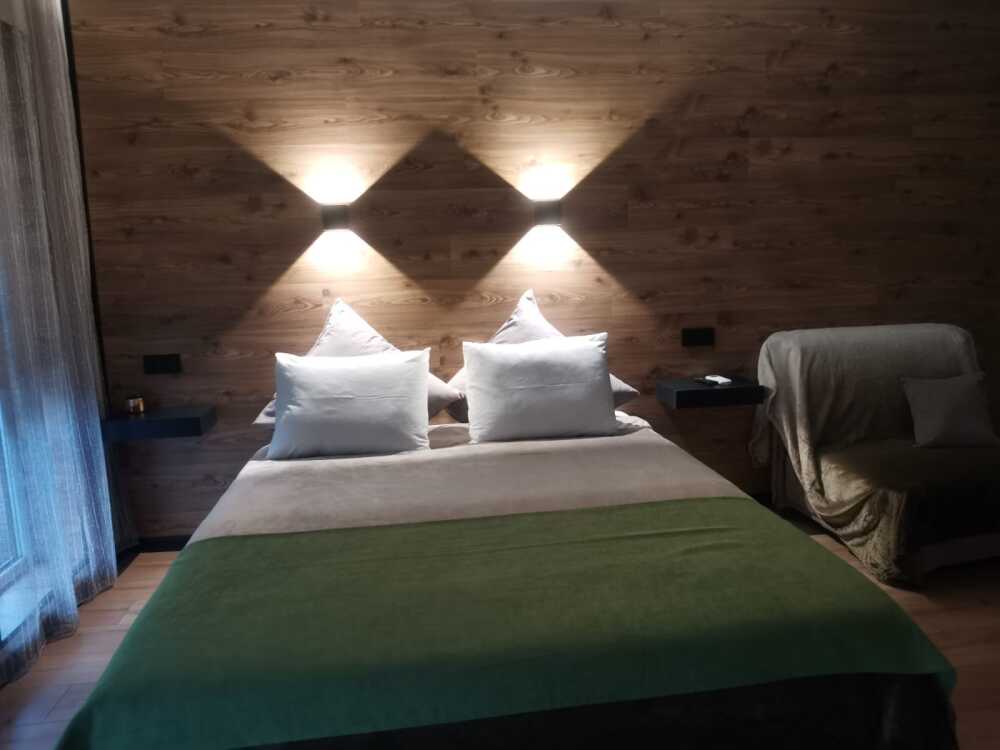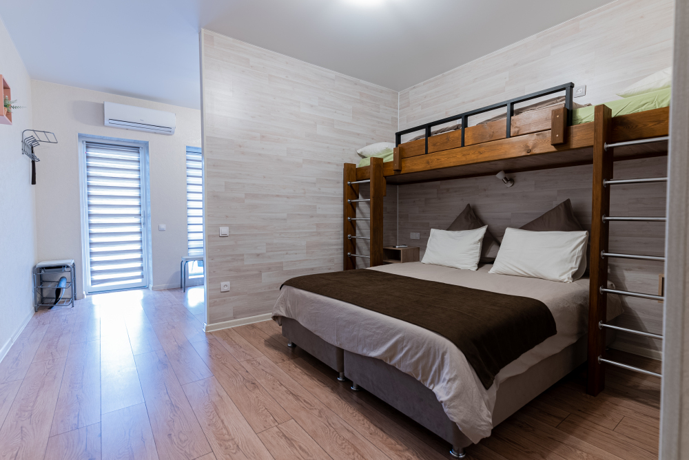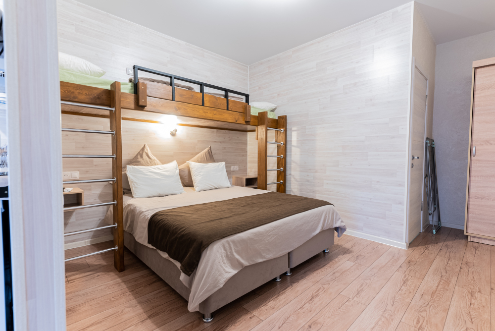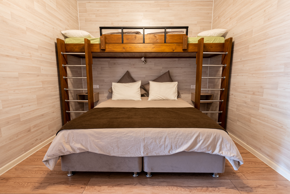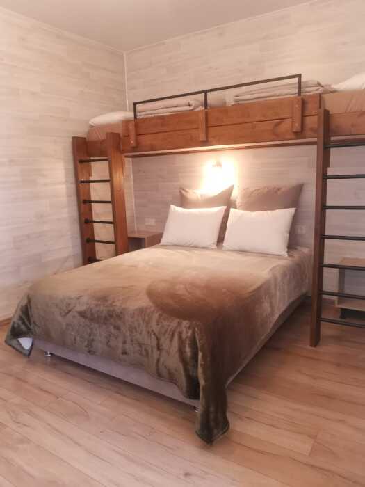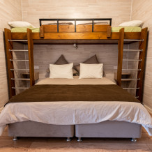 Номер идеально подходят для размещения 2 взрослых и двух детей старшего возраста, и 1-го ребенка младшего возраста. Удобная двуспальная кровать с прикроватными тумбочками, двухспальная кровать-чердак только для детей!, комфортная еврораскладушка и детская кроватка. В Номере есть все, что нужно для комфортного проживания.