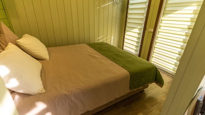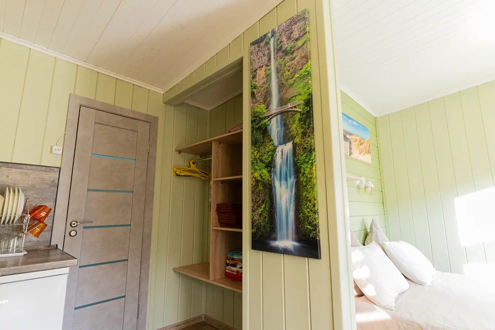Удобная двуспальная кровать с прикроватными тумбочками, двухспальная кровать-чердак только для детей!, комфортная еврораскладушка и детская кроватка. Ванная комната оснащена всем необходимым (душем. Санузлом, раковиной с зеркалом, феном, туалетными принадлежностями). В номере расположена кухня (варочная поверхность на две конфорки, холодильник, раковина и полный комплект посуды). В Номере есть все, что нужно для комфортного проживания.