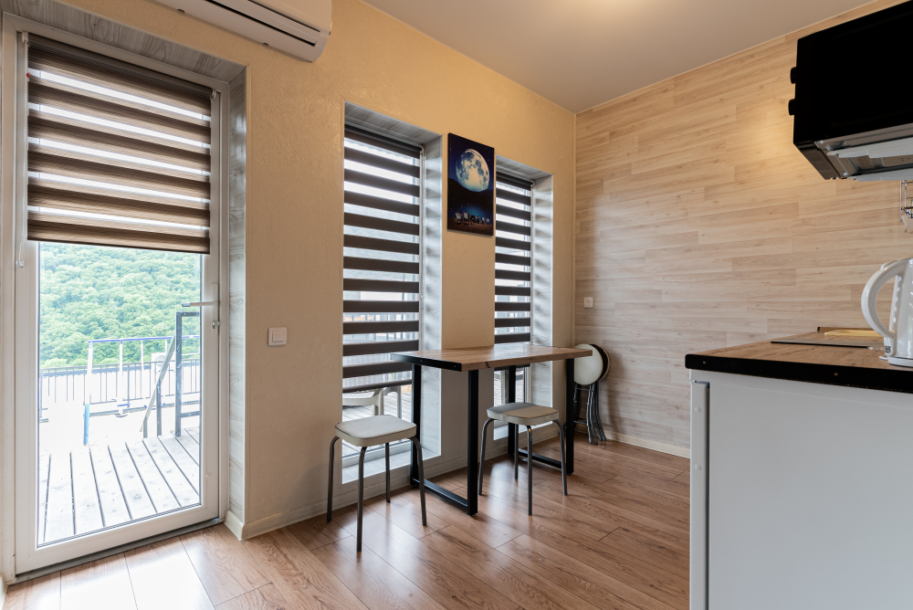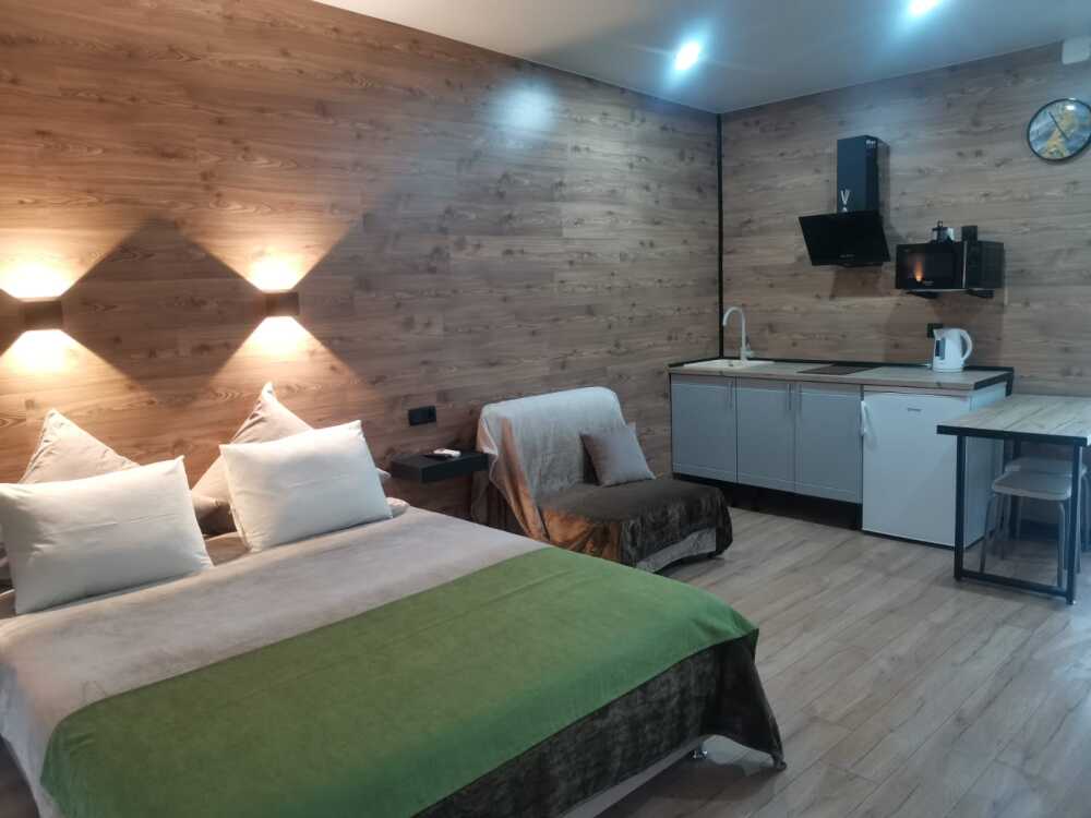 Квартира-студия подходит для 2 или 3 взрослых гостей. Дети допускаются по согласованию с Администрацией. В номере: двуспальная кровать с тумбочками, шкаф, телевизор, гладильная доска, утюг, ванная с душем, санузлом, умывальником, феном и полотенцами. Кухня оборудована варочной поверхностью, холодильником и посудой. Для большего числа гостей предусмотрены 1 кресло-кровать. Из апартаментов открывается вид на горы.