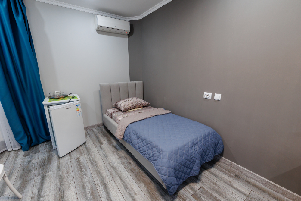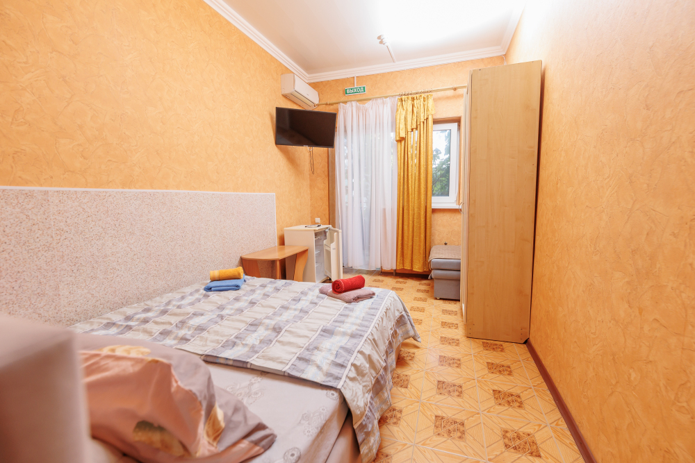 - Техника: Телевизор, кондиционер, холодильник, чайник, бесплатный Wi-Fi.