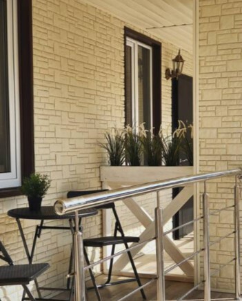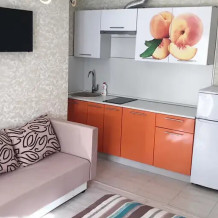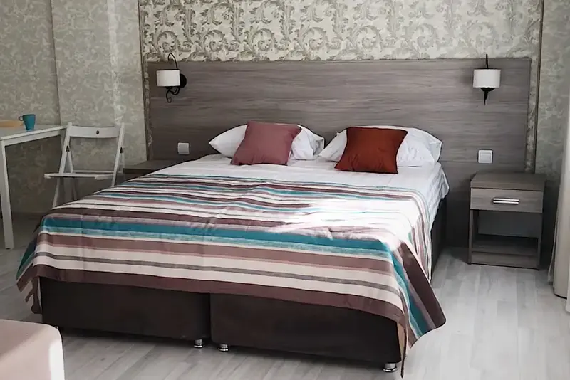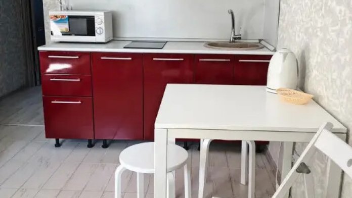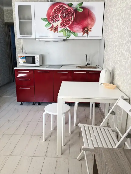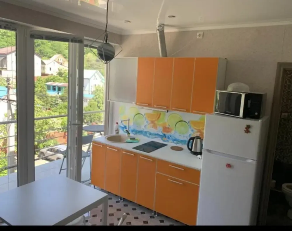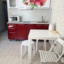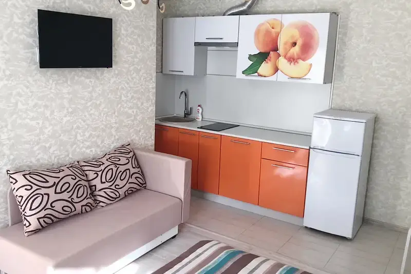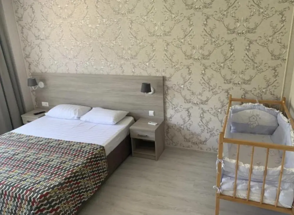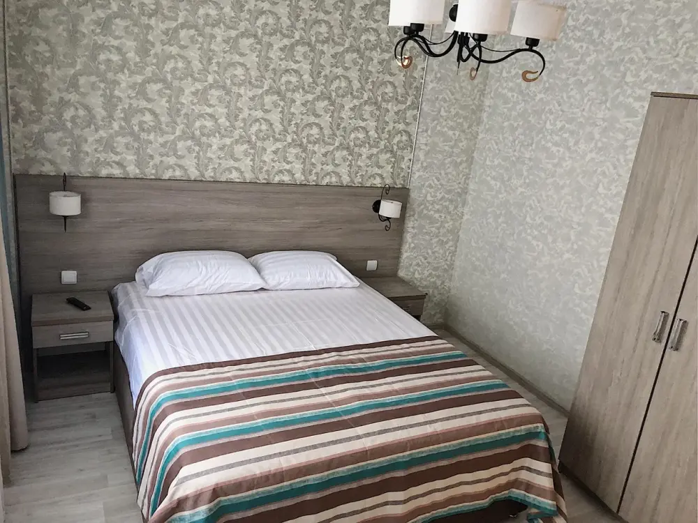 Номера уютно обставлены мебелью, декорированы шторами и картинами. В каждом номере свой кондиционер, телевизор, кухня с комплектом посуды, с современным холодильником, с микроволновой печью, с варочной поверхностью. В номере есть большая кровать с мягким матрасом и уютный диван, который раскладывается на два спальных места. Также, во всех номерах есть своя ванная комната с горячей и холодной водой (индивидуальное автономное отопление всего дома). Постельное белье входит в комплектацию номера. По запросу предоставляем детские кроватки. В каждом номере есть свой балкон. Балкон укомплектован столом и стульями, сушилкой для белья.
