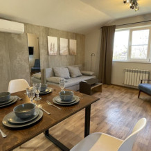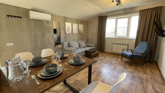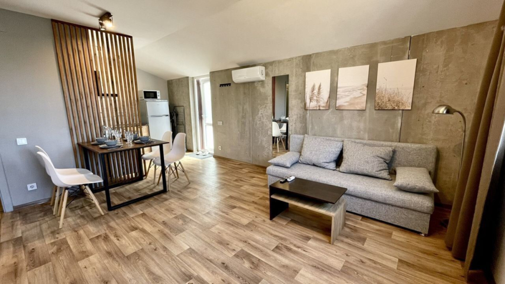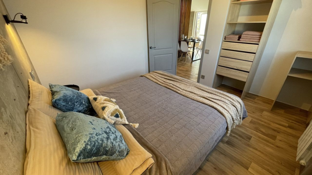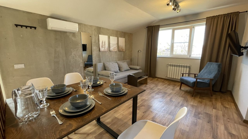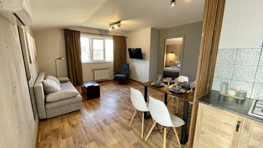 Апартаменты на первом этаже с одной спальней и отдельным входом. В доме всего два этажа.