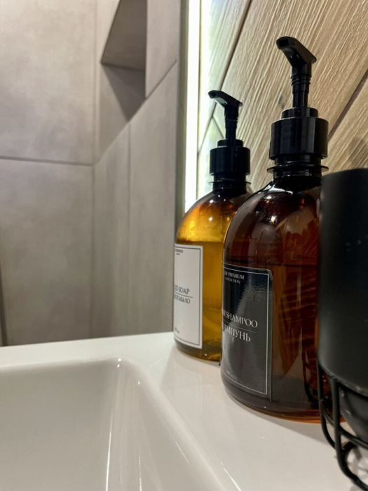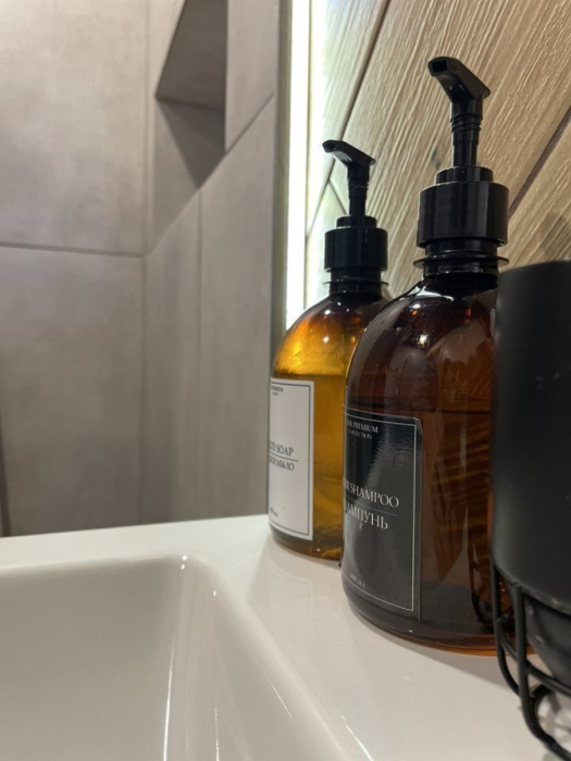 Есть вся посуда, микроволновка, вместительный холодильник, фен, на заезд мыло для рук, для посуды, гель для душа и шампунь.