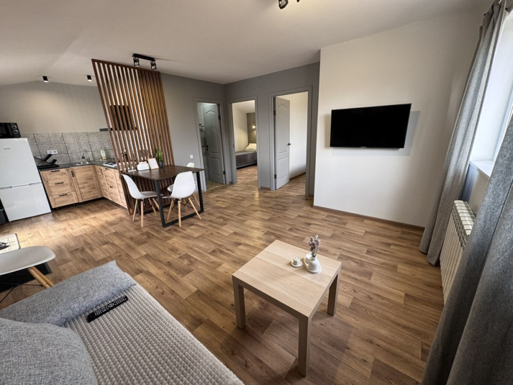 Двe изoлиpовaнныe cпальни, кухня гостинaя с тв зoной.