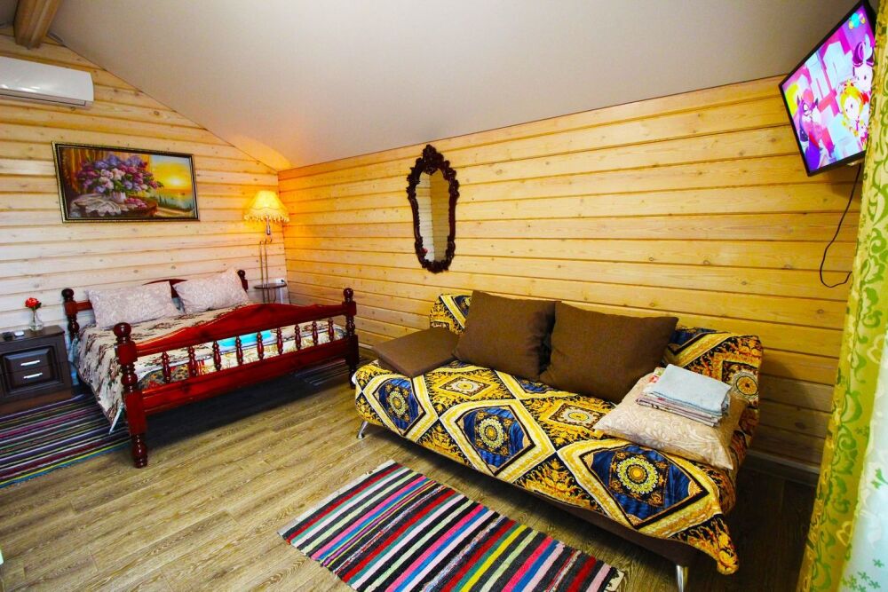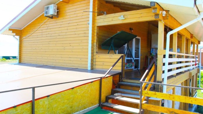 Уютный коттедж из толстого сибирского бруса надежно защитит от летнего зноя, но если захотите еще прохладнее мощный кондиционер моментально охладит пыл. Панорамное французское окно в пол, качественные матрасы, хорошая мебель и белоснежное выглаженное постельное белье, отличная шумоизоляция - все это залог крепкого здорового отдыха. На терассе обеденная группа, качели и кухня. С террасы вид на фруктовый сад и детскую площадку. Изюминка девятого номера в его уединенности. Он крайний, мимо никто не ходит. Возле входа растут персиковые деревья.