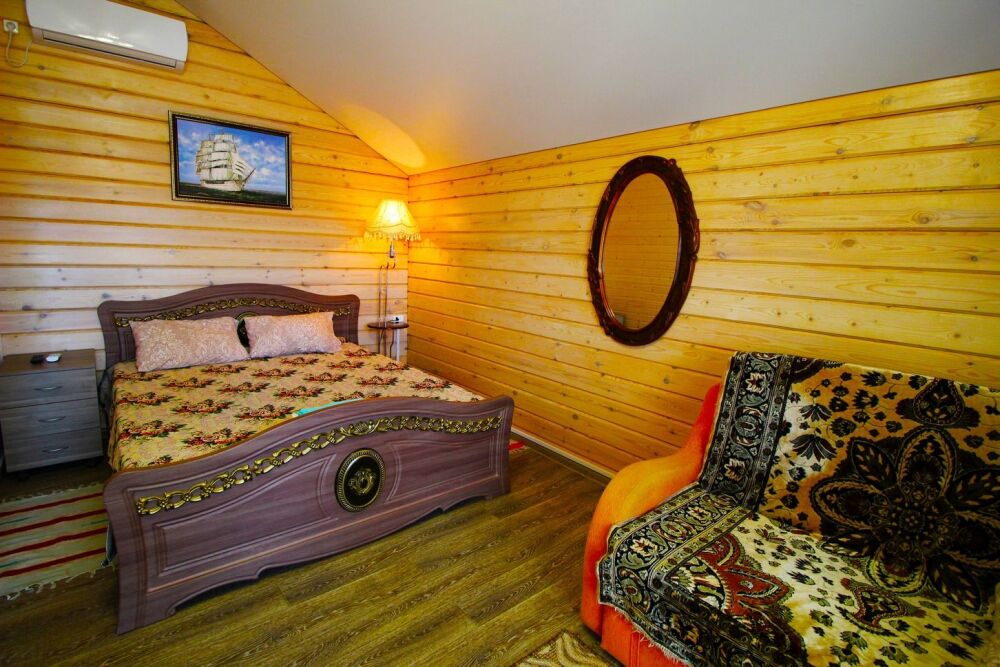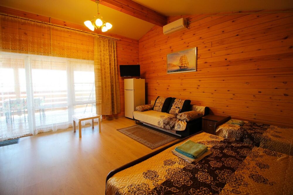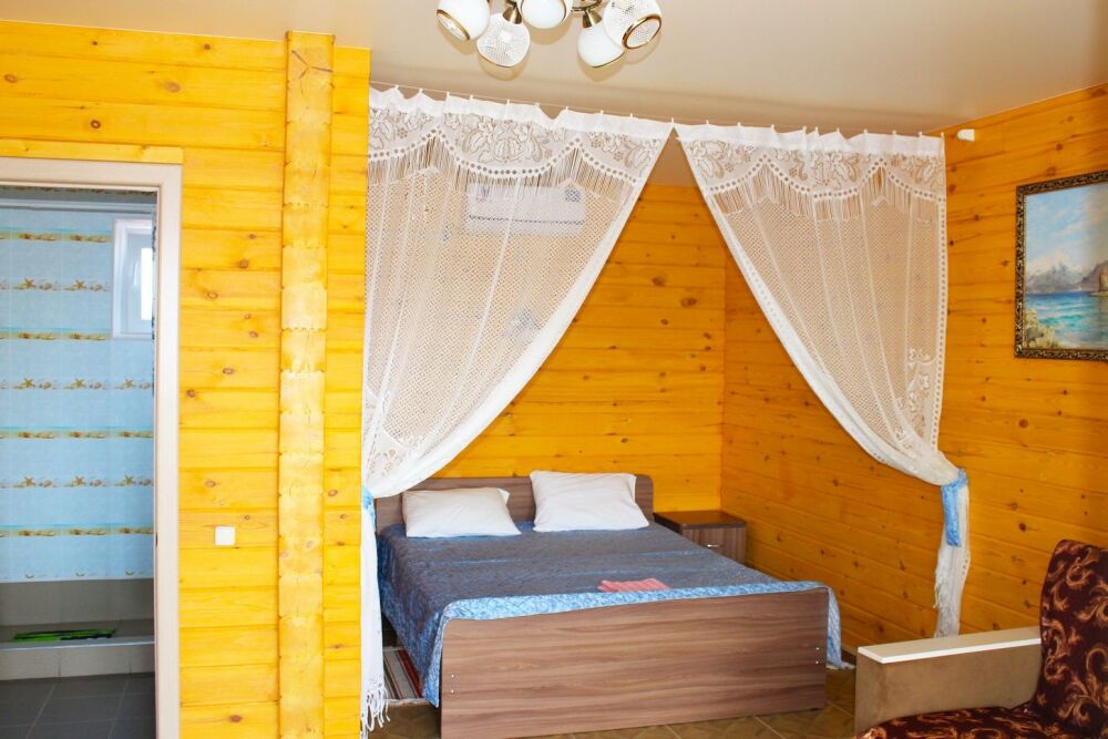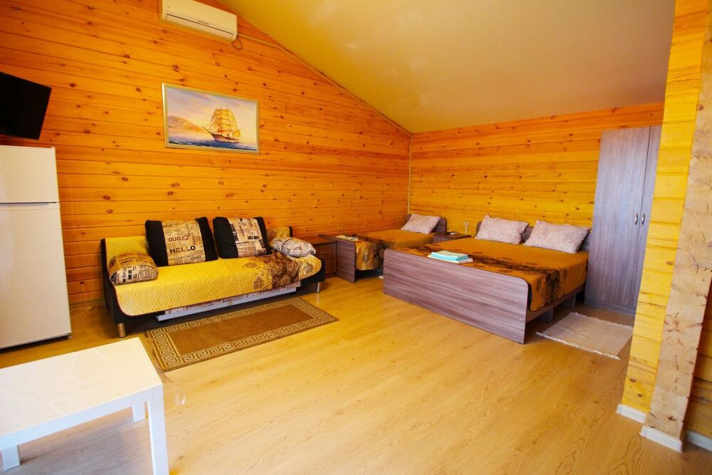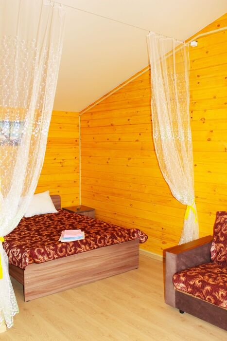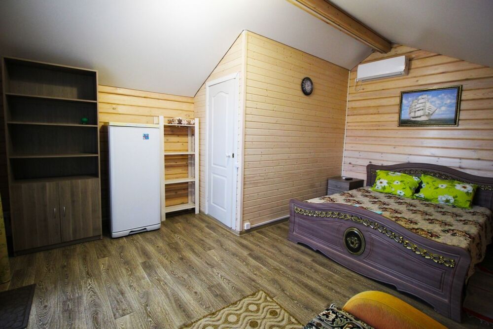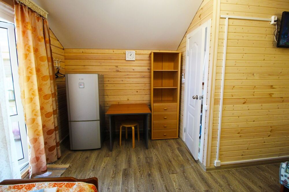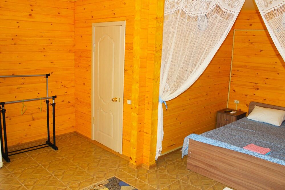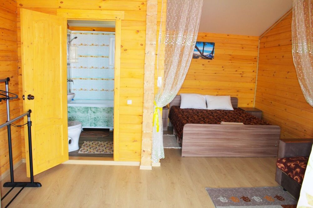 Романтичный просторный номер на втором этаже. Почувствуйте себя в деревянном замке - высота потолков достигает 4 метров. Панорамное французское окно в пол. Натуральный сибирский брус, хорошая мебель, качественные матрасы и белоснежное выглаженное постельное белье - все это залог крепкого здорового отдыха. На террасе обеденная группа, качели и кухня. Посуды достаточно , чтобы приготовить что угодно. Для сохранности продуктов предусмотрен свой большой полноценный холодильник с морозильной камерой. Просторный санузел с ванной. С террасы завораживающий вид на море.
