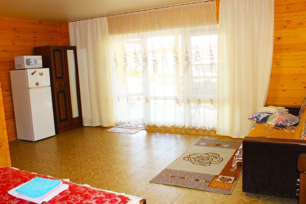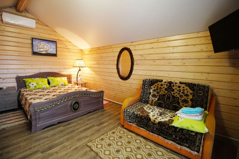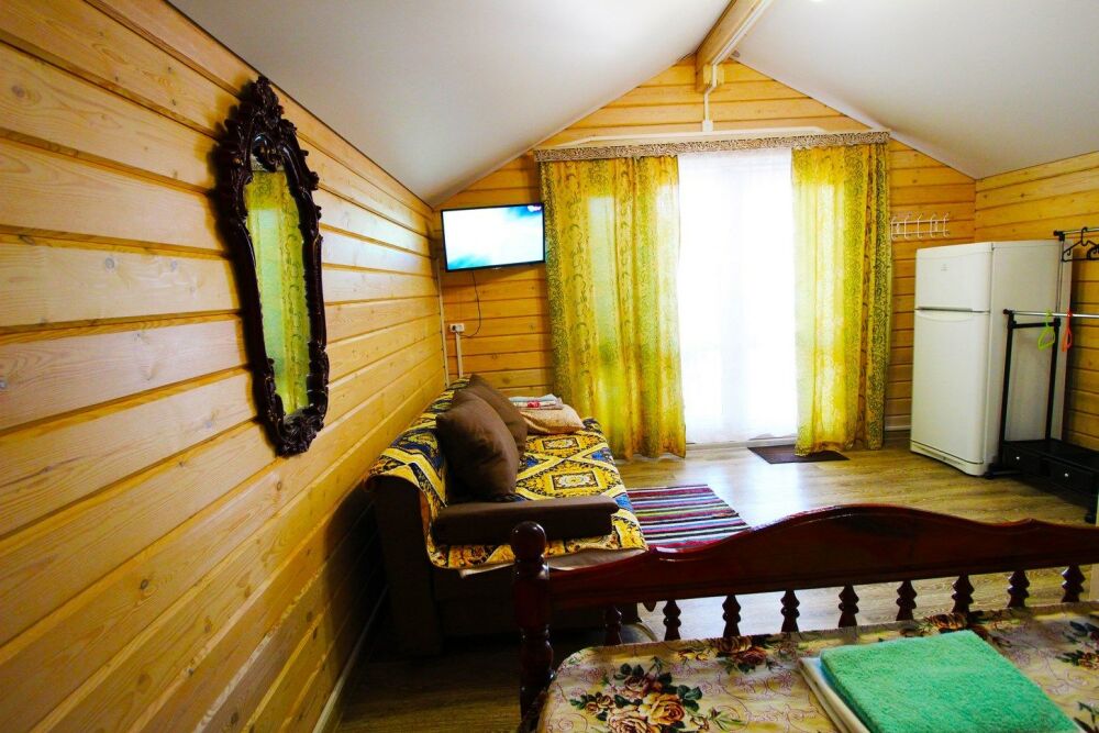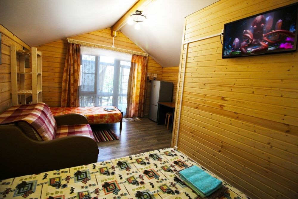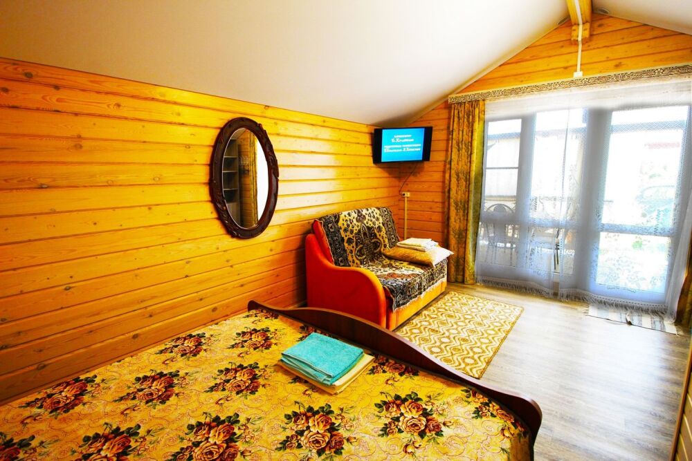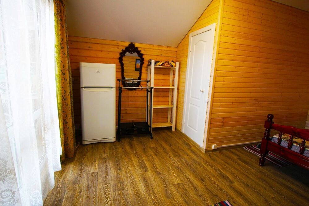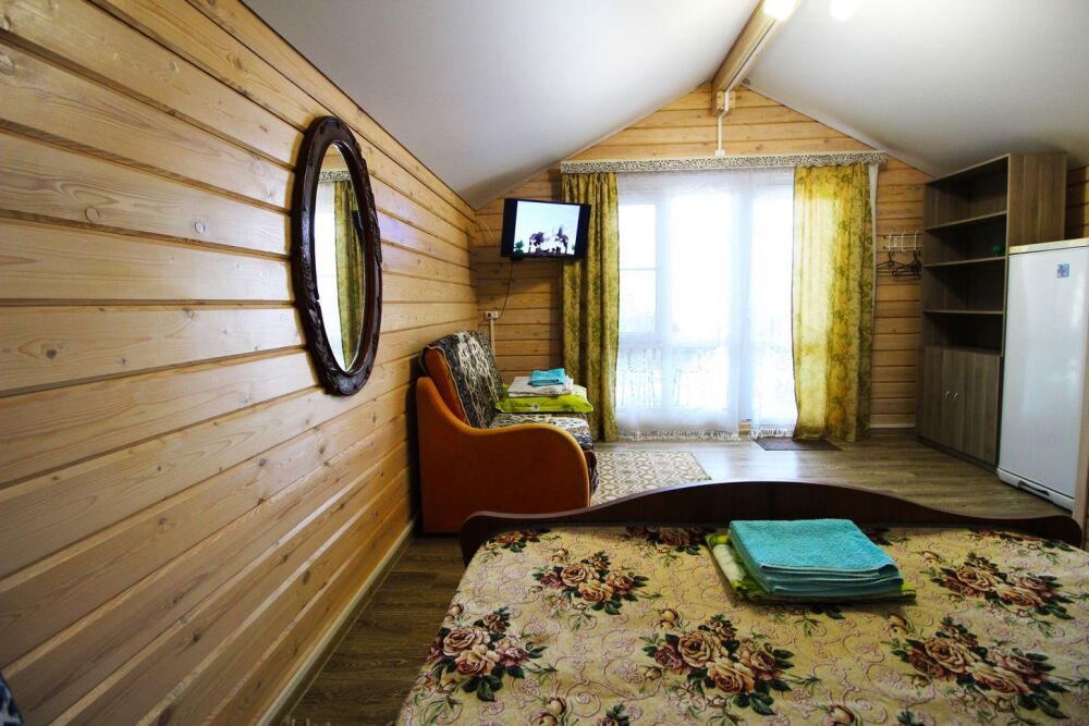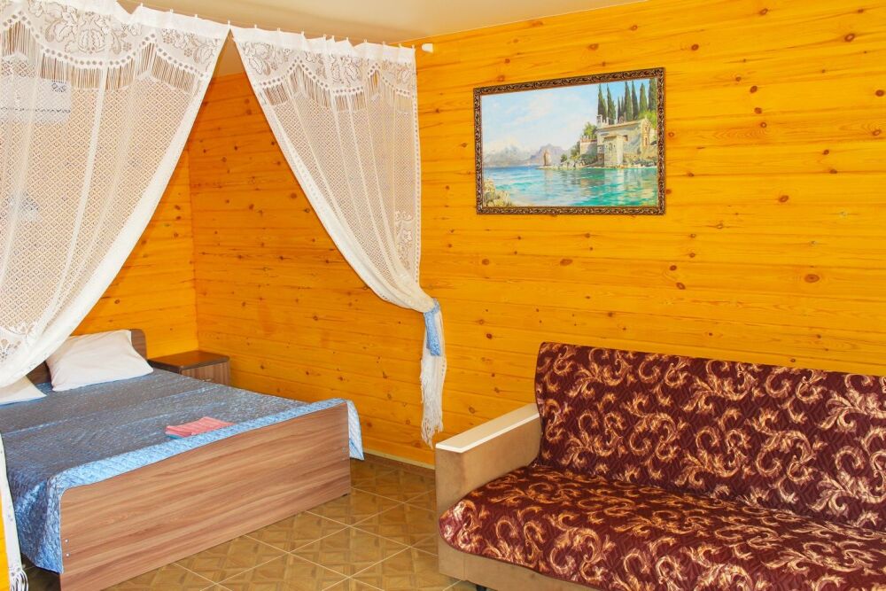 Романтичный просторный номер на втором этаже. Почувствуйте себя в деревянном замке - высота потолков достигает 4 метров. Панорамное французское окно в пол. Натуральный сибирский брус, хорошая мебель, качественные матрасы и белоснежное выглаженное постельное белье - все это залог крепкого здорового отдыха. На террасе обеденная группа, качели и кухня. Посуды достаточно , чтобы приготовить что угодно. Для сохранности продуктов предусмотрен свой большой полноценный холодильник с морозильной камерой. Просторный санузел с ванной. С террасы завораживающий вид на море.