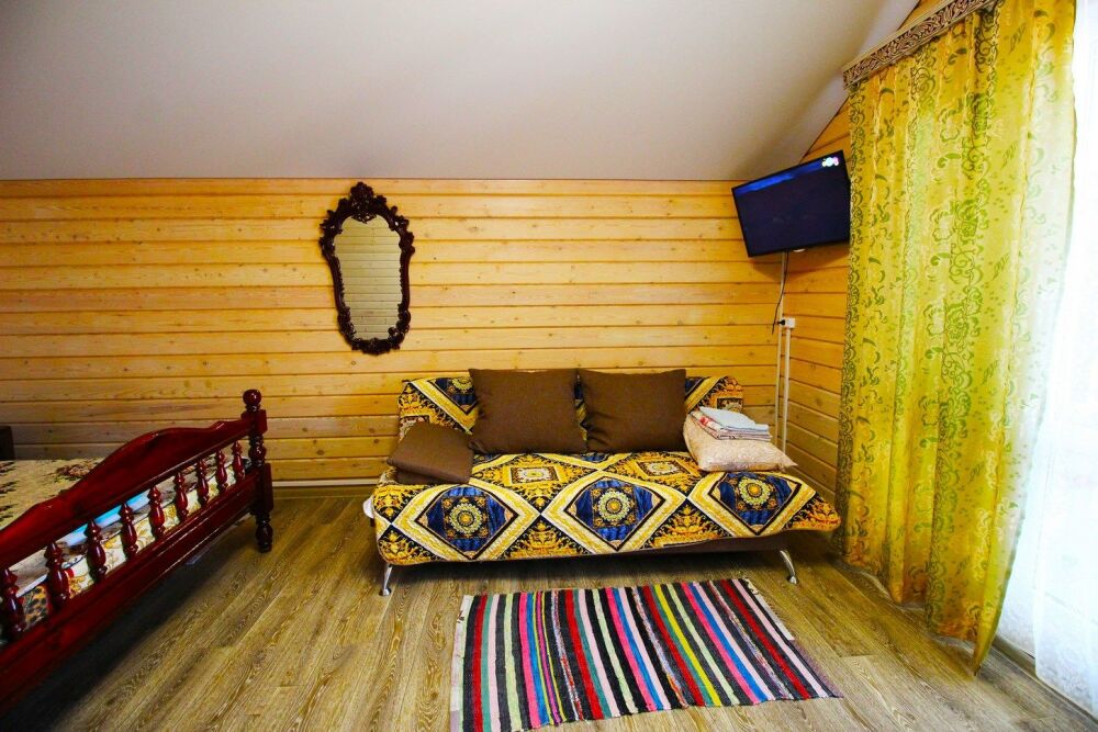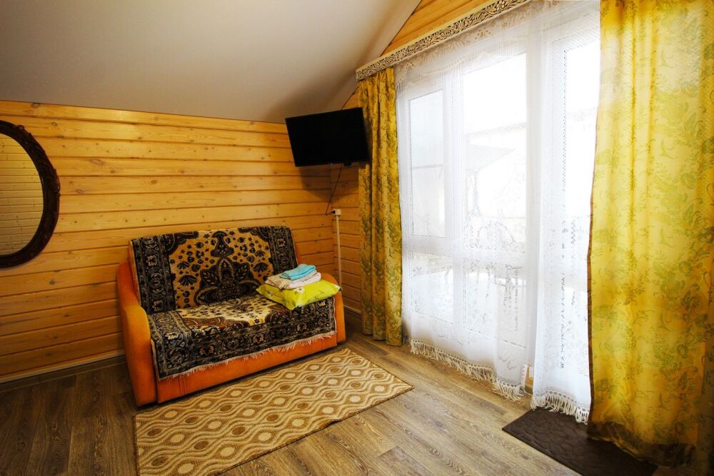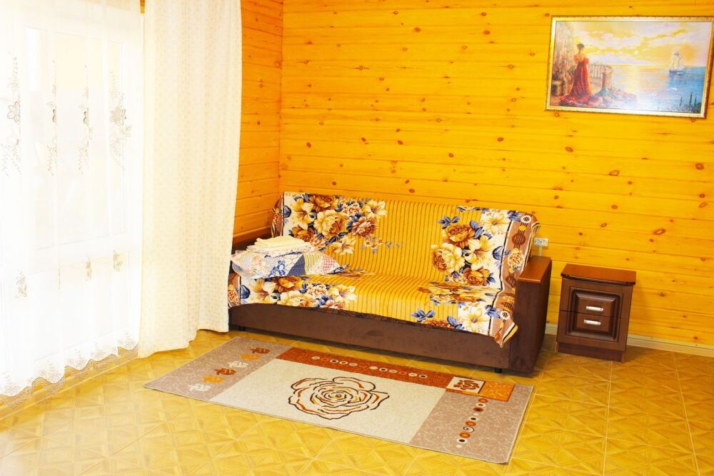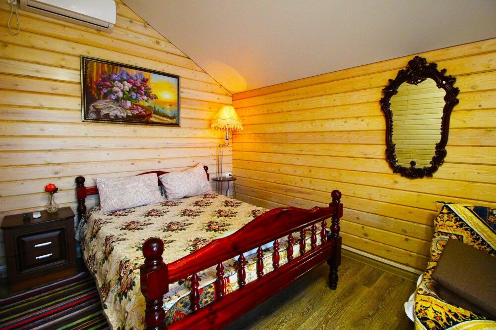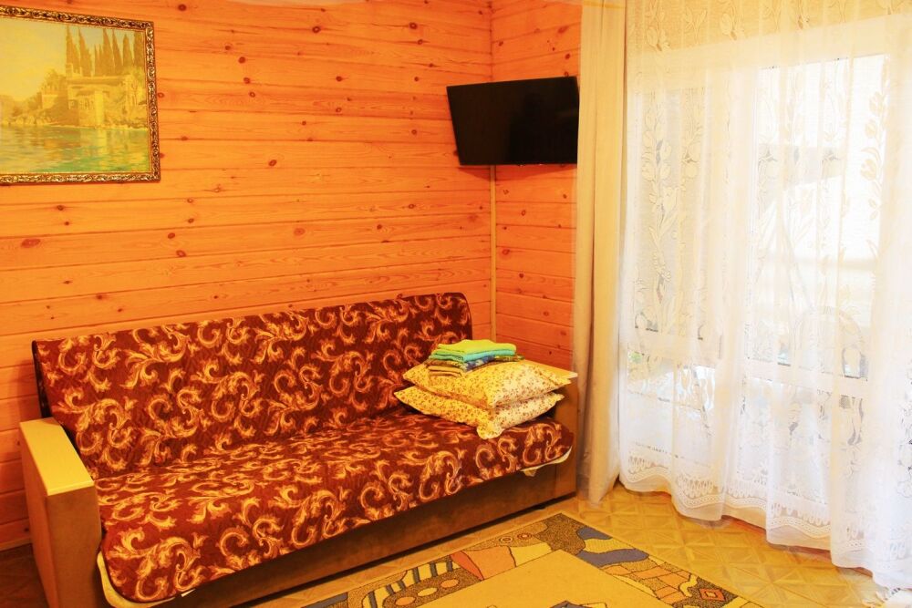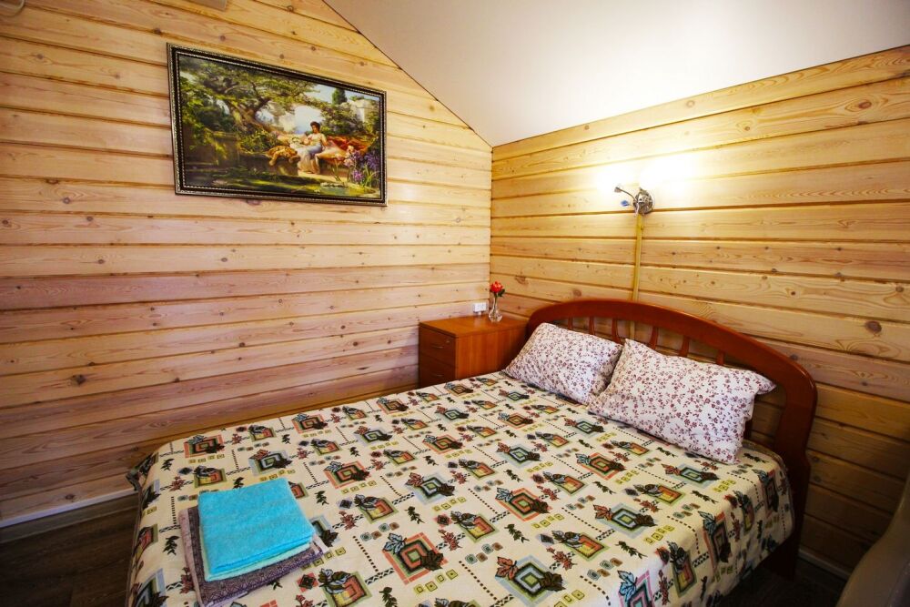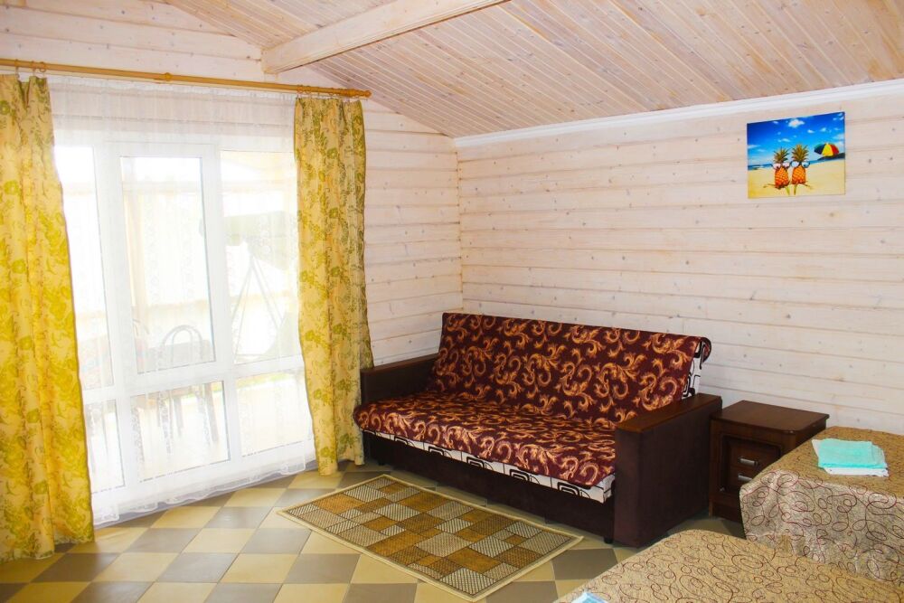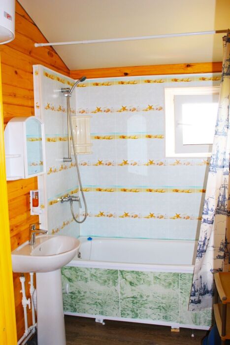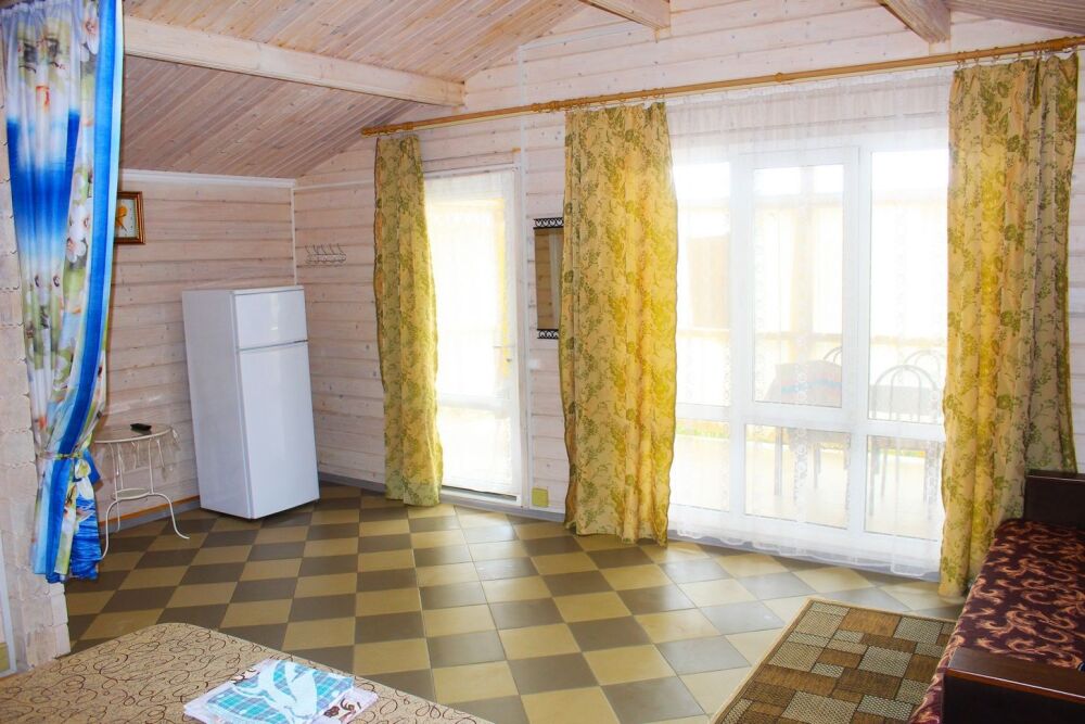 Романтичный просторный номер на втором этаже. Почувствуйте себя в деревянном замке - высота потолков достигает 4 метров. Панорамное французское окно в пол. Натуральный сибирский брус, хорошая мебель, качественные матрасы и белоснежное выглаженное постельное белье - все это залог крепкого здорового отдыха. На террасе обеденная группа, качели и кухня. Посуды достаточно , чтобы приготовить что угодно. Для сохранности продуктов предусмотрен свой большой полноценный холодильник с морозильной камерой. Просторный санузел с ванной. С террасы завораживающий вид на море.