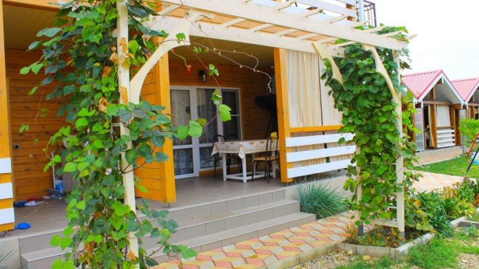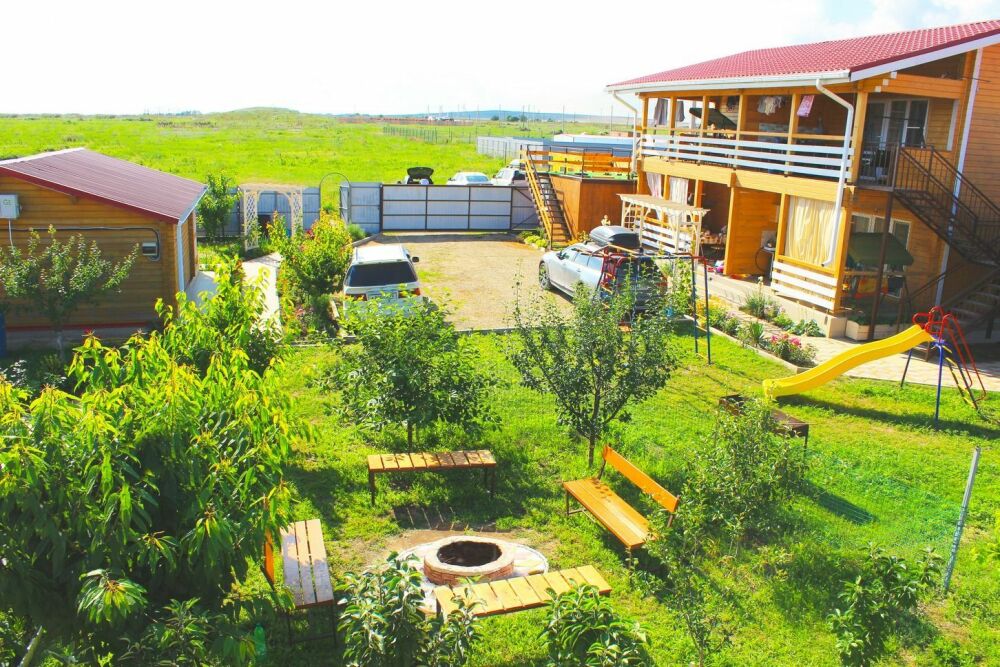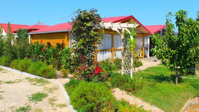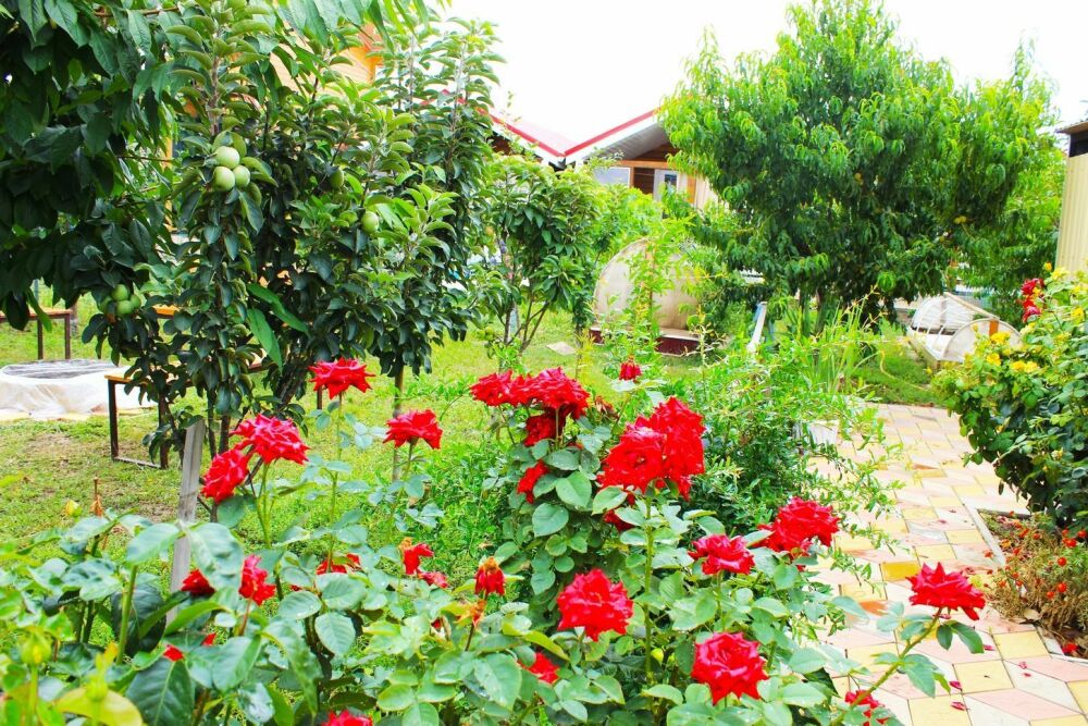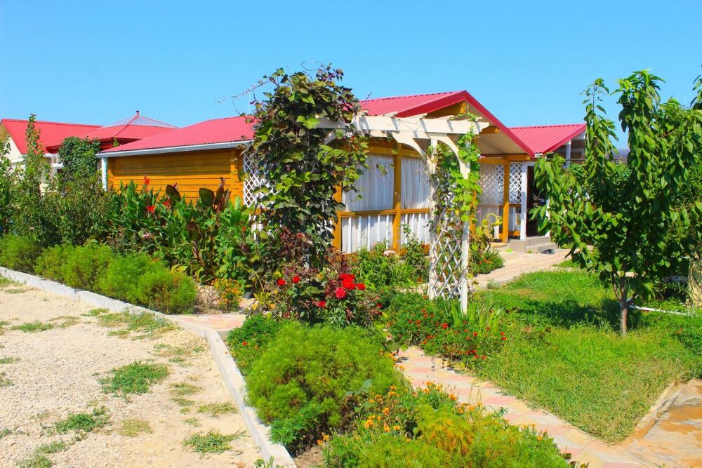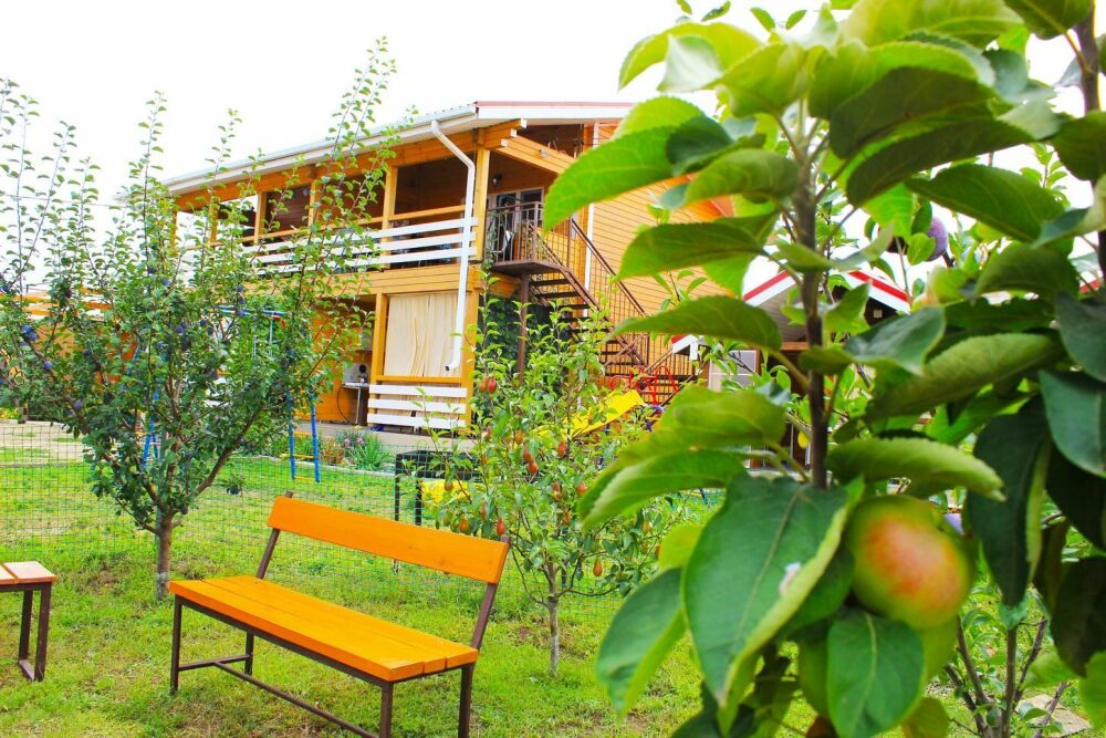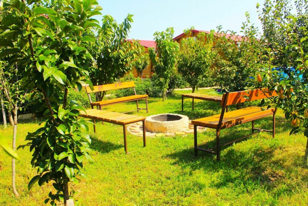Также имеется романтическая беседка-шатер с подсветкой, где можно расслабиться вечером с бокалом любимого напитка. Отличной альтернативой послужит очаг с лавочками среди фруктовых деревьев, где можно собраться большой компанией у костра, также можно просто отдыхать на качелях на террасе, которые имеются в каждом домике.