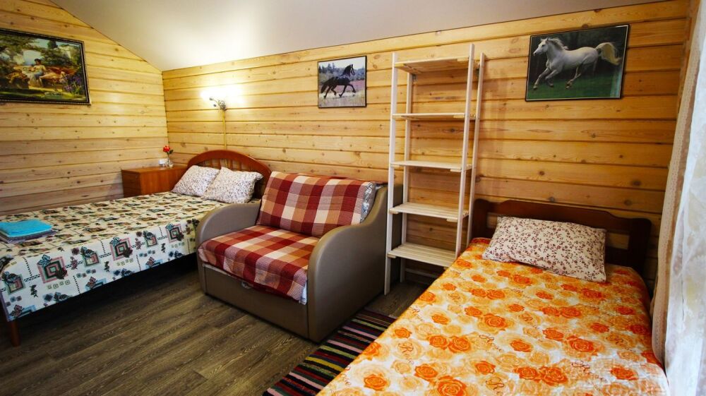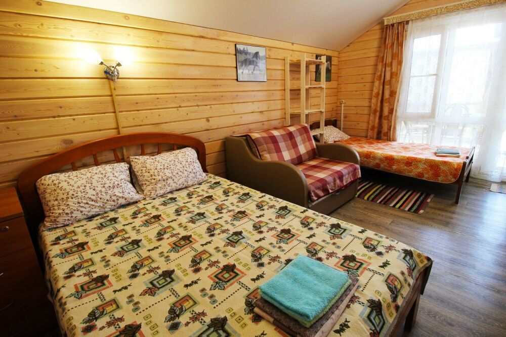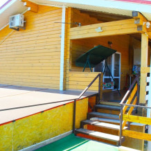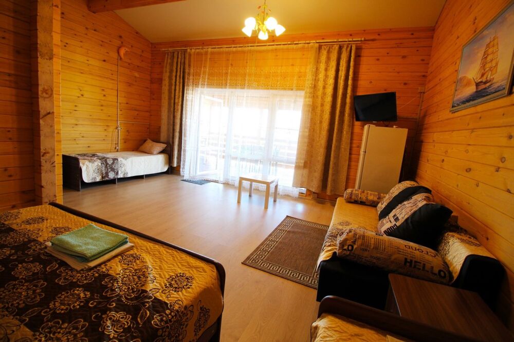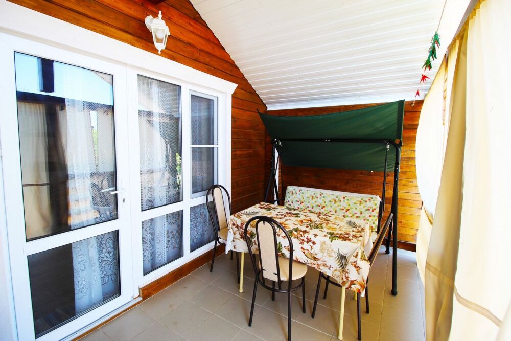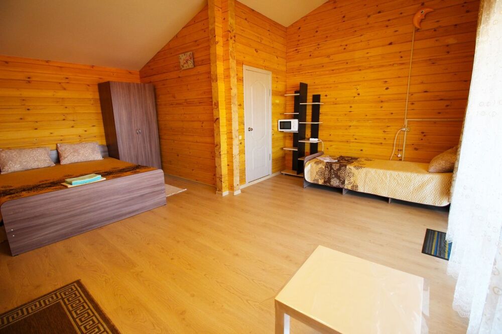 Самый большой и просторный номер на втором этаже. Почувствуйте себя в деревянном замке - высота потолков достигает 4 метров. Панорамное французское окно в пол. Натуральный сибирский брус, хорошая мебель, качественные матрасы и белоснежное выглаженное постельное белье - все это залог крепкого здорового отдыха. На террасе обеденная группа, качели и кухня. Посуды достаточно, чтобы приготовить что угодно, а если чего то не хватит - мы Вам предоставим. Для сохранности продуктов предусмотрен свой большой полноценный холодильник с морозильной камерой. С террасы открывается завораживающий вид на море.