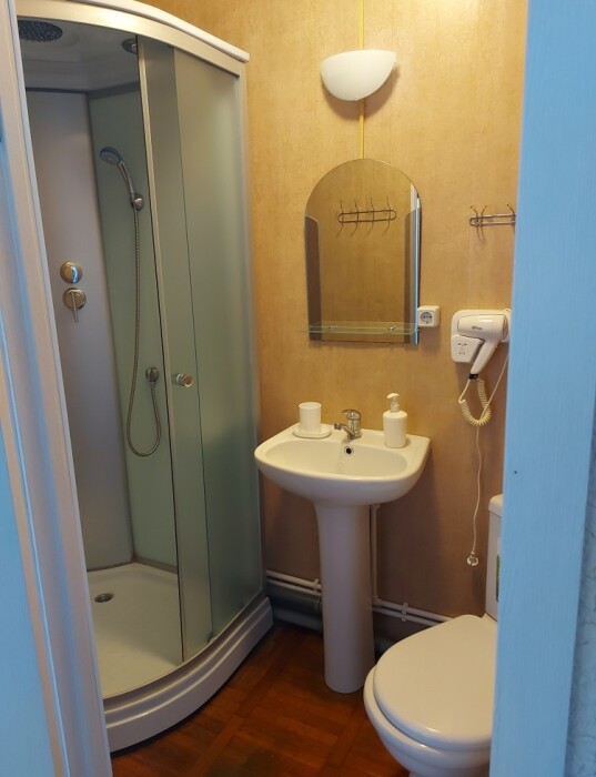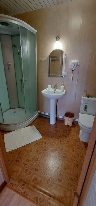 Двухместный, комфортный номер. Оборудован всем необходимым для комфортного отдыха и проживания. Возможно установка доп.места (платно +500руб/ночь). Двухместные номера находится как на первом, так и на втором этаже (уточняйте при бронировании). Номер укомплектован кондиционером, смарт TV 43», цифровое тв, Wi-Fi, холодильник, эл.чайник, посуда, фен, сейф. Санузел с душевой кабиной. На входе перед номером столик с креслами. Курение в номере строго запрещено.
