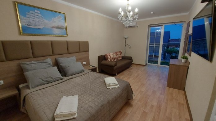 Номер находится как на первом, так и на втором этаже. Номер укомплектован кондиционером, два смарт TV 43», цифровое тв, Wi-Fi, холодильник, эл.чайник, посуда, фен, сейф. Санузел с душевой кабиной.
