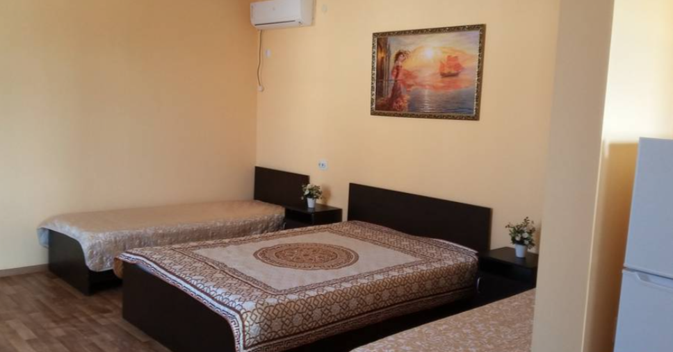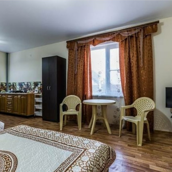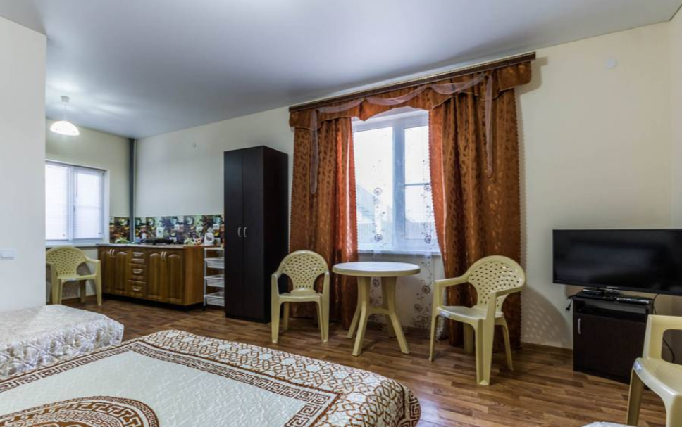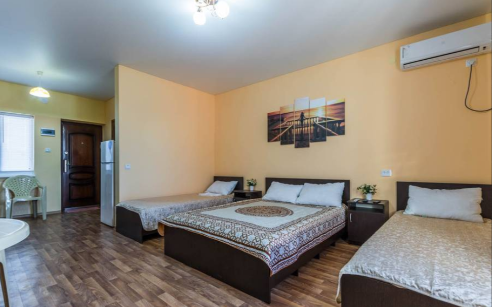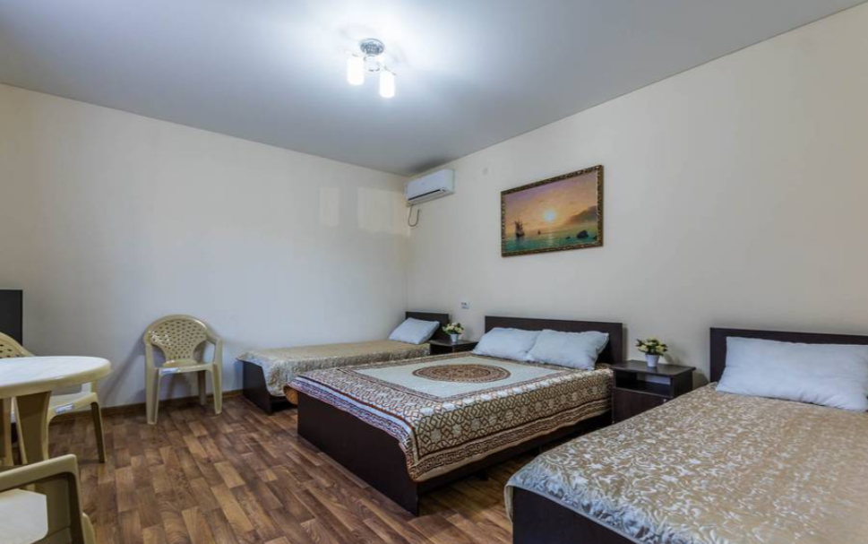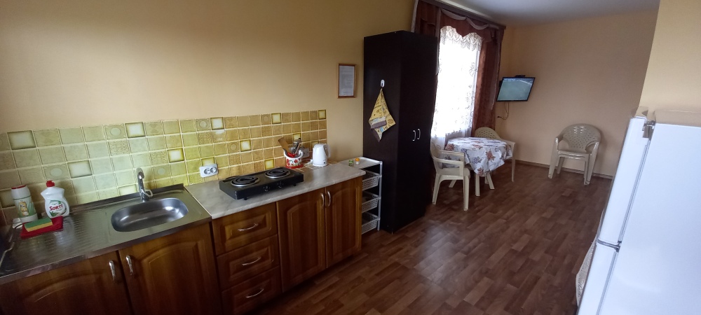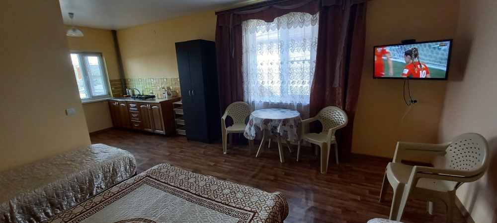 Мы рады предложить Вам просторные светлые номера, общая площадь номера 30 кв. метров. В каждом номере двуспальная и две односпальные кровати, санузел, большой ЖК телевизор, сплит-система, шкаф, кухня со всеми принадлежностями, двухкамерный холодильник, широкий балкон, возможность поставить столик на балконе. Во дворе мангал, WI-FI. Предоставляются постельное бельё и полотенца.