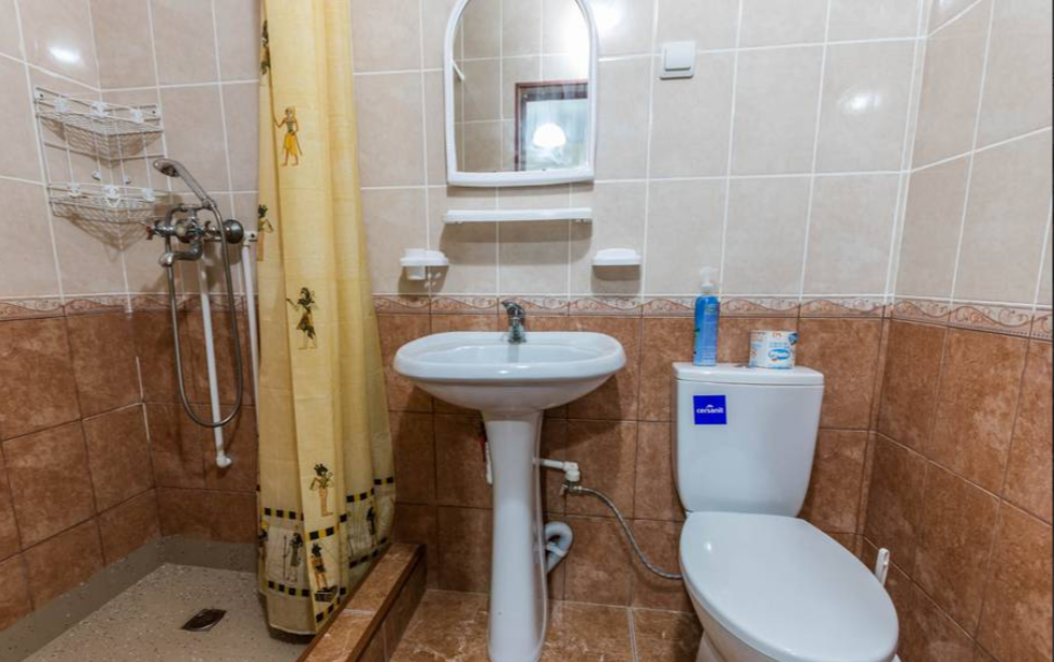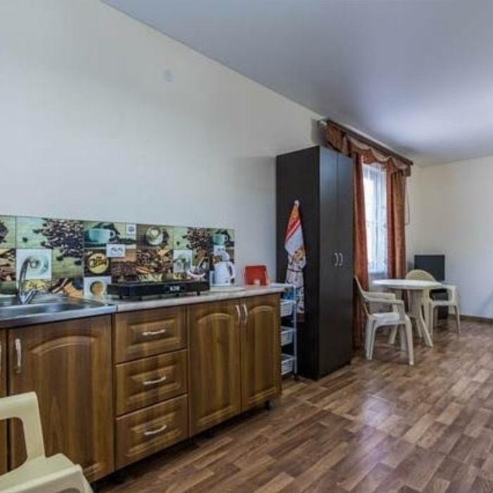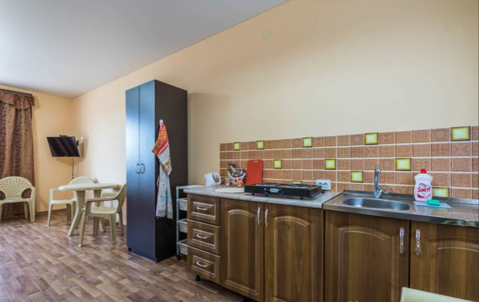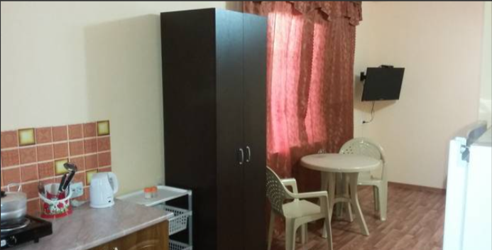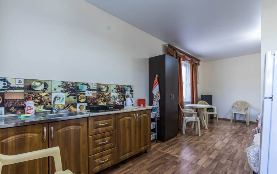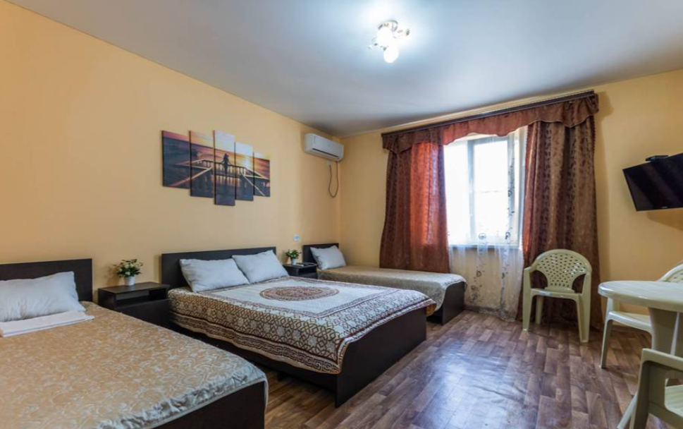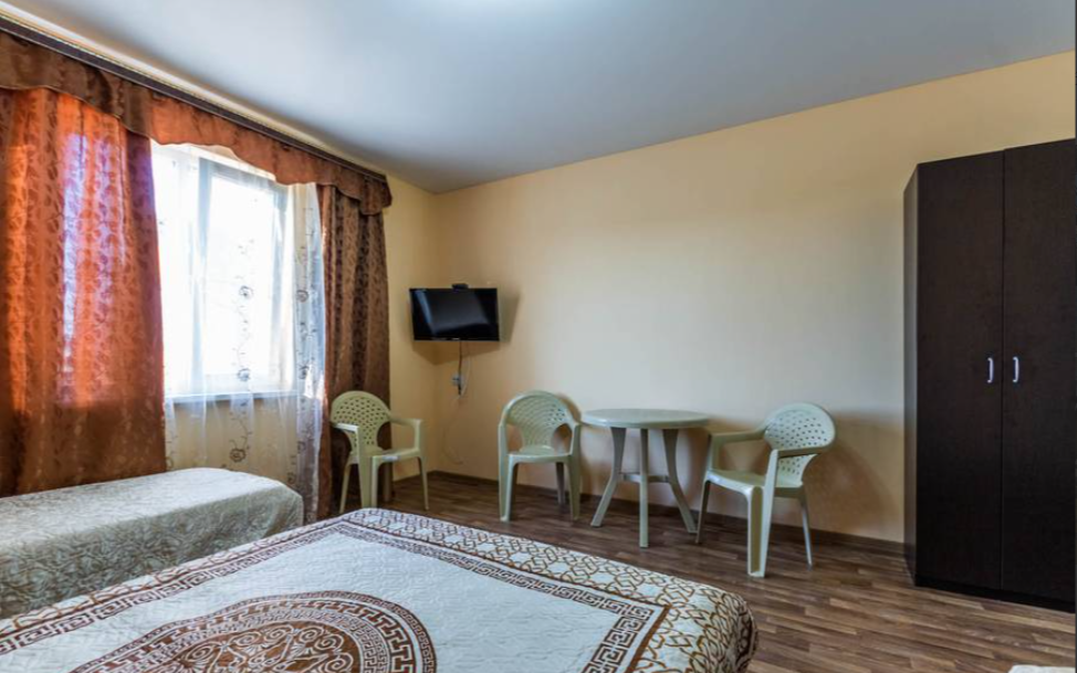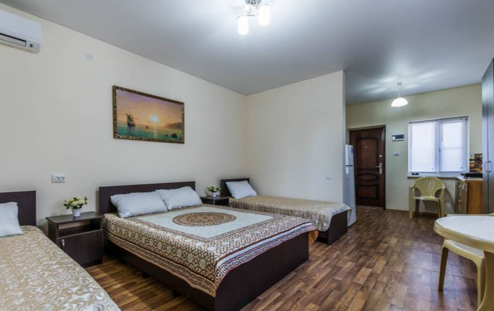 Мы рады предложить Вам просторные светлые номера, общая площадь номера 30 кв. метров. В каждом номере двуспальная и две односпальные кровати, санузел, большой ЖК телевизор, сплит-система, шкаф, кухня со всеми принадлежностями, двухкамерный холодильник, широкий балкон, возможность поставить столик на балконе. Во дворе мангал, WI-FI. Предоставляются постельное бельё и полотенца.