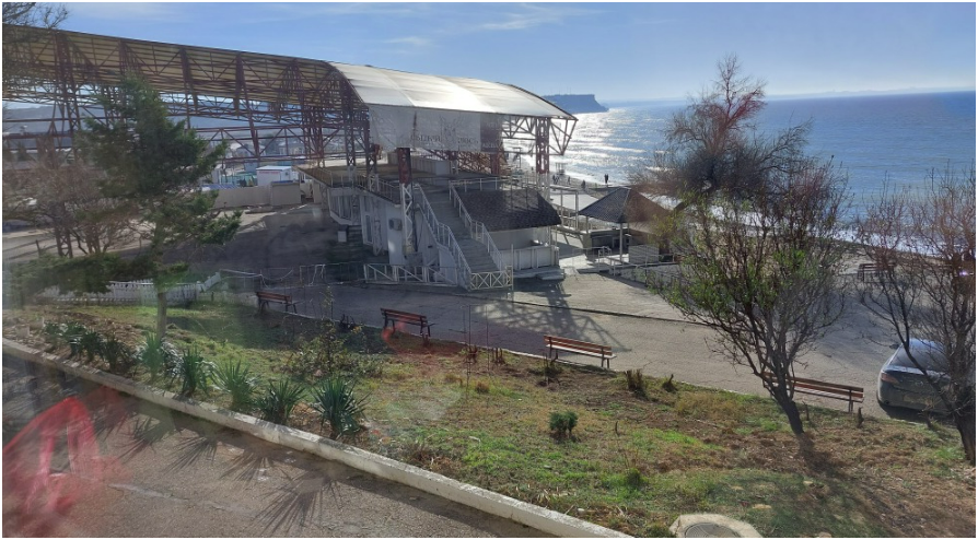 Всего через 20 м благоустроенный песочно-галечный пляж протяженностью 2 км с навесами, шезлонгами, душем, раздевалками, туалетом.