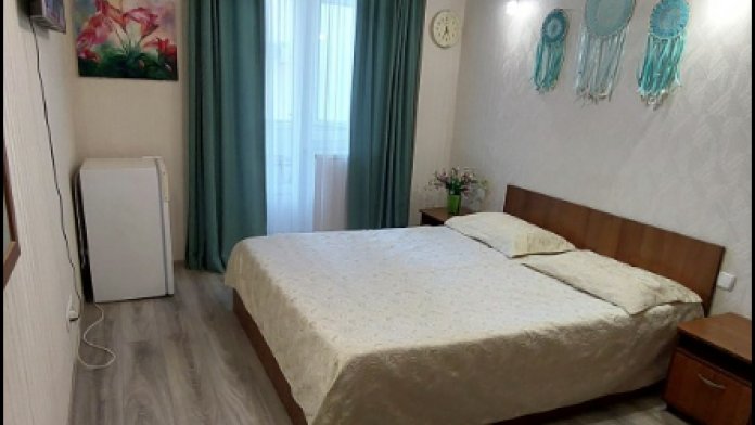 В апартаментах имеется двуспальная кровать с дополнительным топпером, шкаф-купе, 2 тумбочки, телевизор, есть скоростной Wi-fi интернет, кондиционер, вентилятор, на застекленном балконе-оборудованная кухня с микроволновой печью, мультиваркой, электрочайником, посудой, стол для приёма пищи, диван-кровать. В туалете душевая кабина, умывальник, электросушилка, стиральная машина, бойлер.