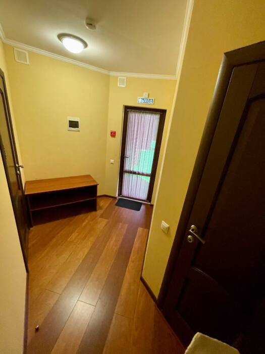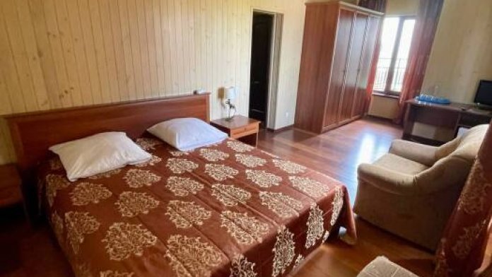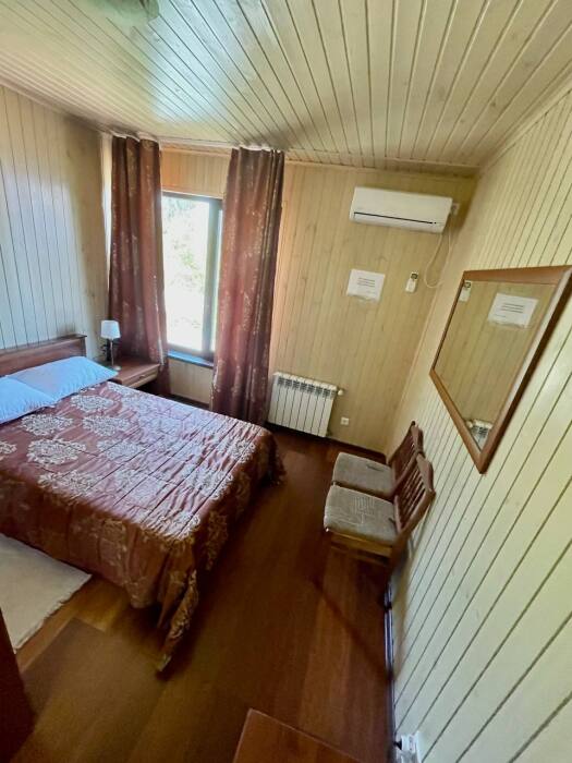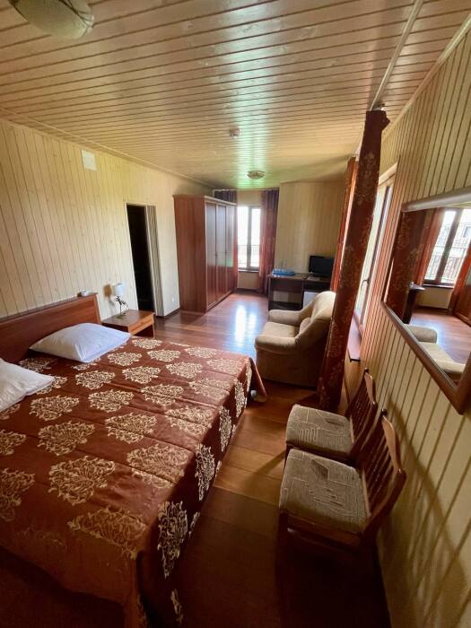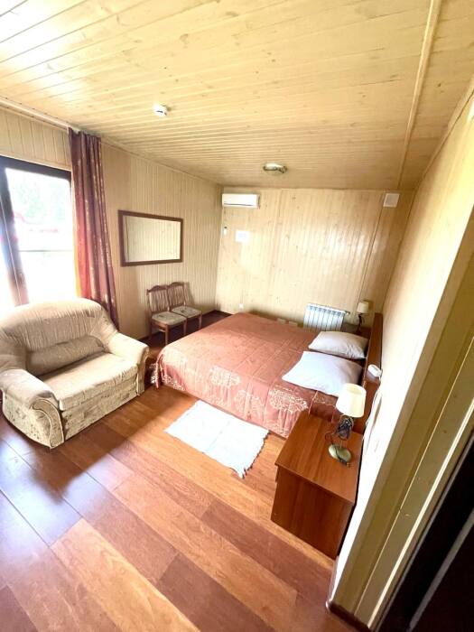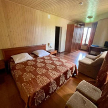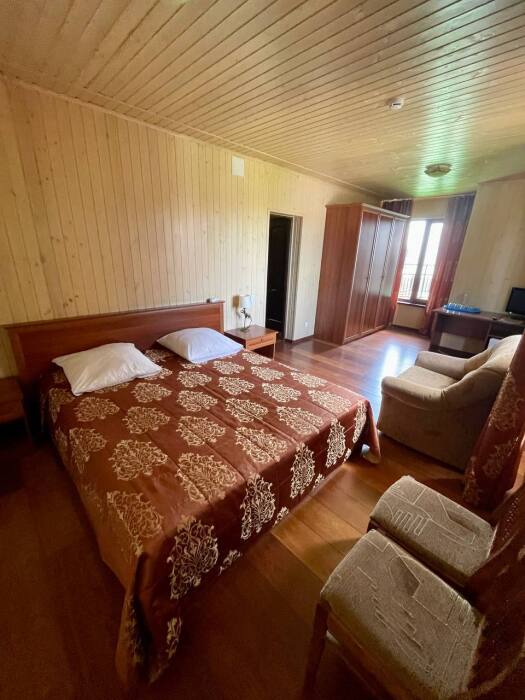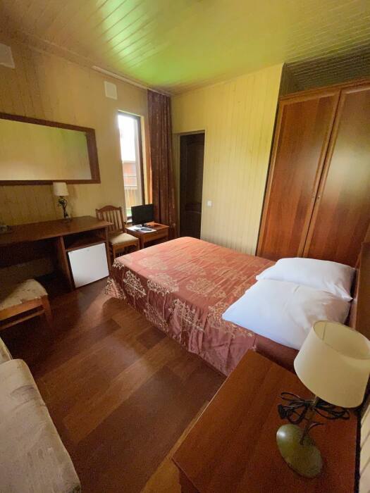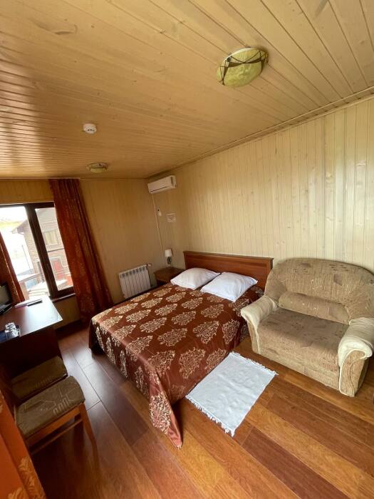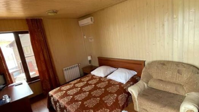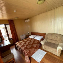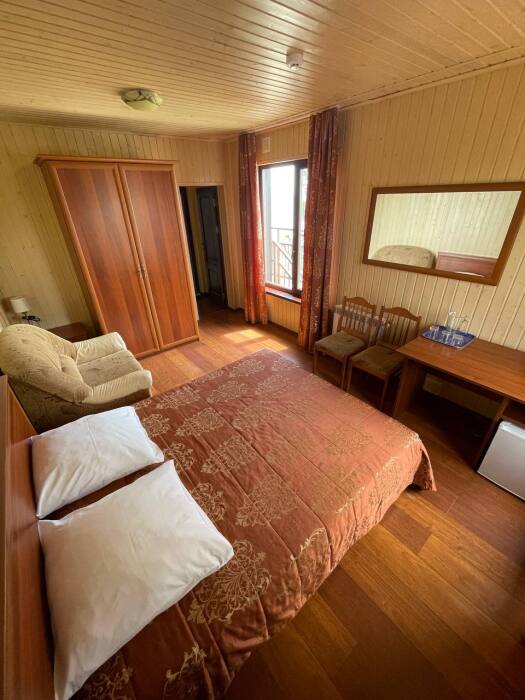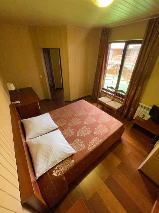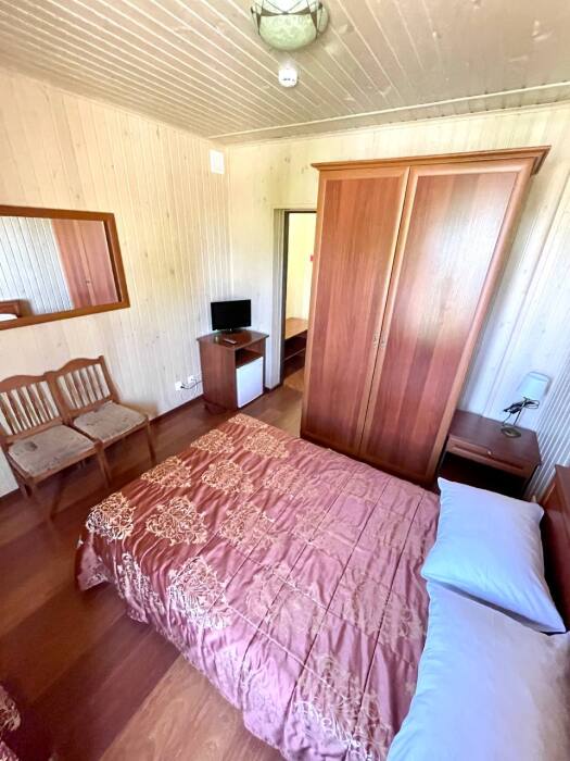 В номере 2-х спальная кровать, кресло-кровать, холодильник, телевизор, сплит-система, шкаф, стол, стулья, тумбочки, душ+туалет, коридор, постельные принадлежности, полотенца.
