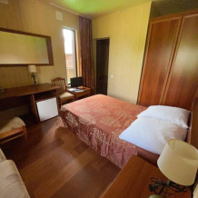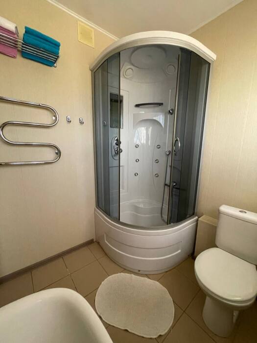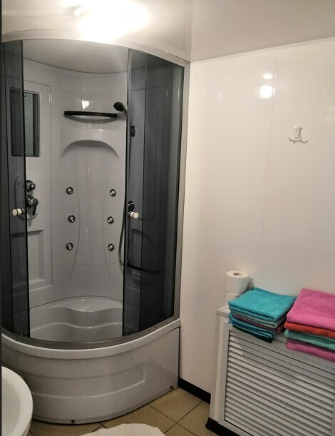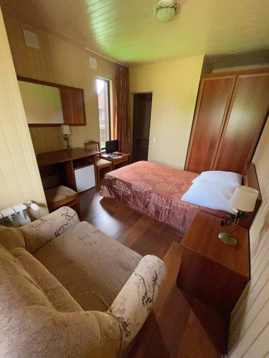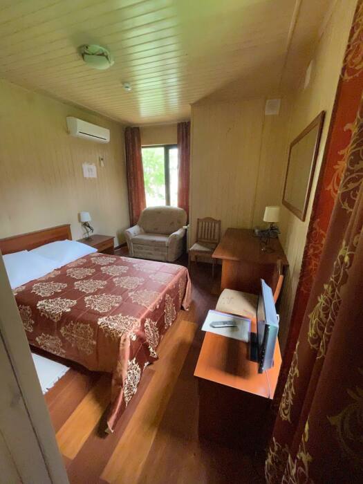 В номере 1,5 спальная кровать, кресло-кровать, холодильник, телевизор, сплит-система, шкаф, стол, стулья, тумбочки, душ+туалет, коридор, постельные принадлежности, полотенца.