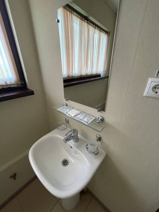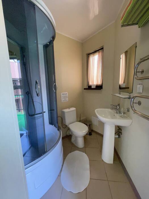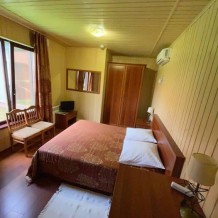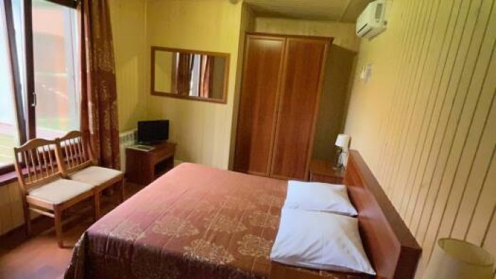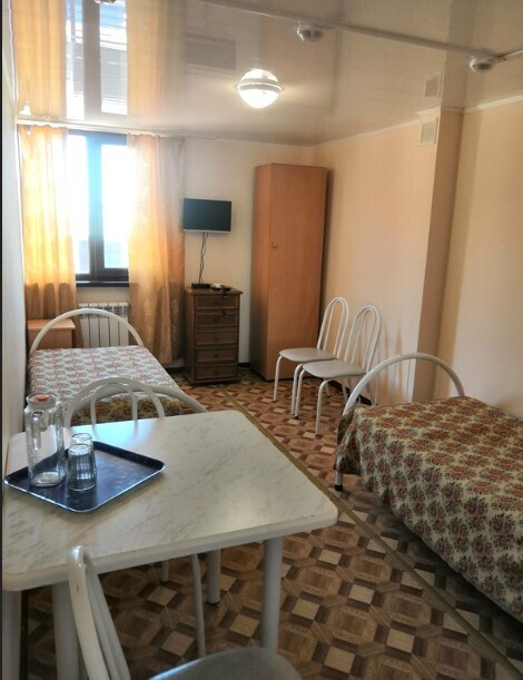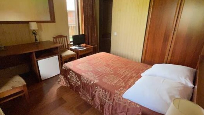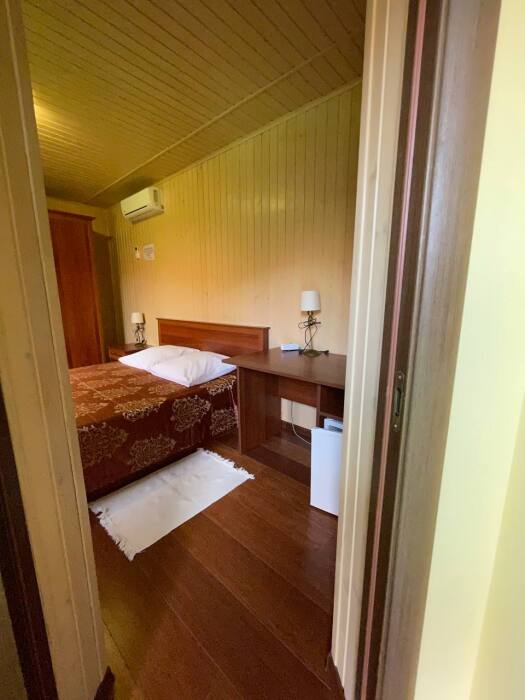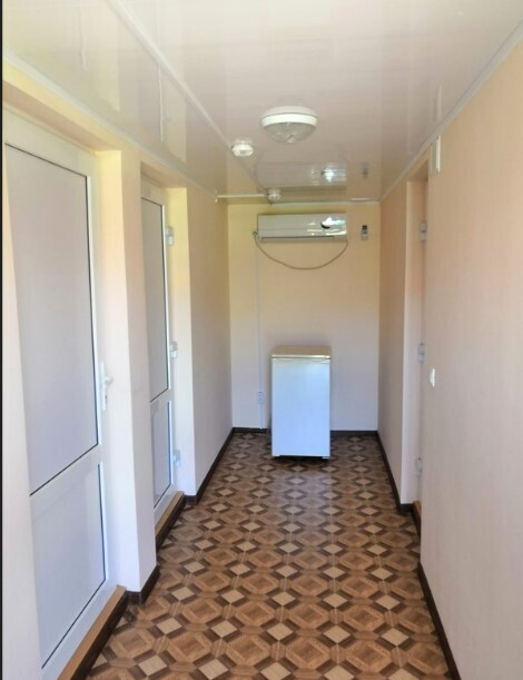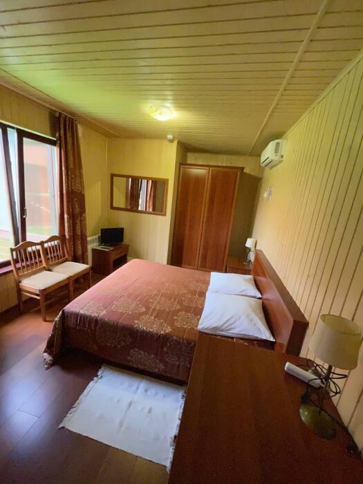 В номере 2-х спальная кровать, холодильник, телевизор, сплит-система, шкаф, стол, стулья, тумбочки, душ+туалет, коридор, постельные принадлежности, полотенца.