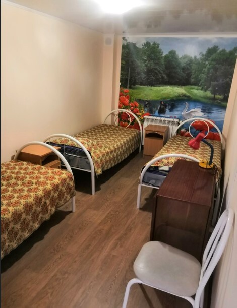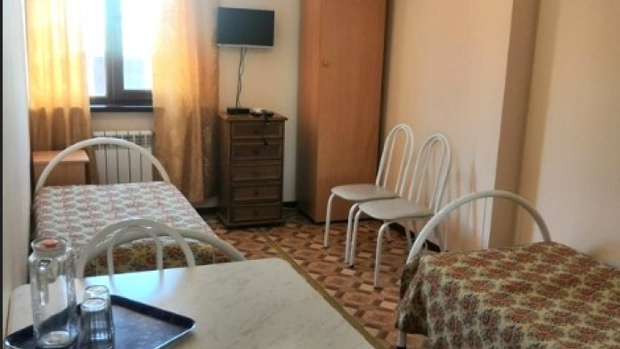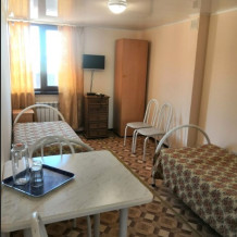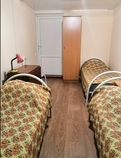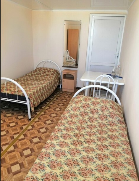 Две комнаты, коридор, пять односпальных кроватей, стол, стулья, тумбочки, шкаф, туалет, умывальник, душевая кабина, постельные принадлежности, полотенца. телевизор, холодильник, сплит-система, балкон(общий) . Во второй комнате нет окна. Расположен в административном корпусе на 2 этаже.