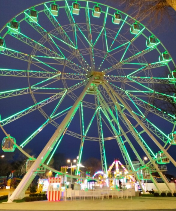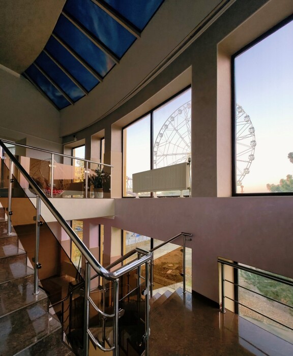 Трехместный номер с панорамными окнами и видом на колесо обозрения.
