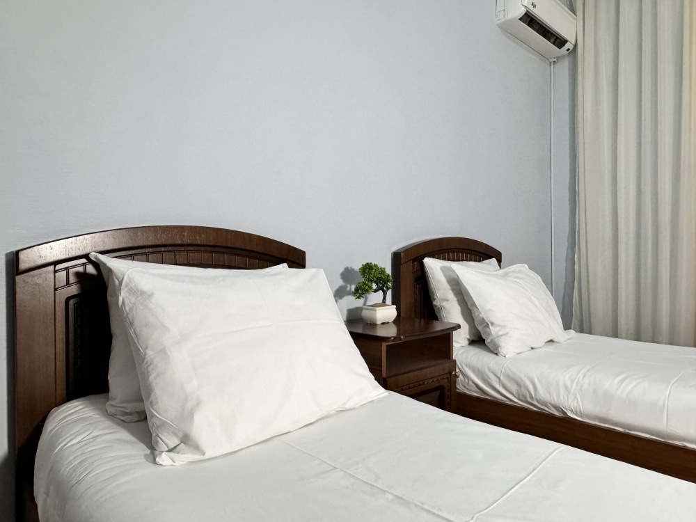 Номер оснащен: двуспальная кровать или две односпальные кровати, кресло-кровать, прикроватные тумбочки, шкаф, стул, журнальный столик, телевизор, мини-холодильник, кондиционер.