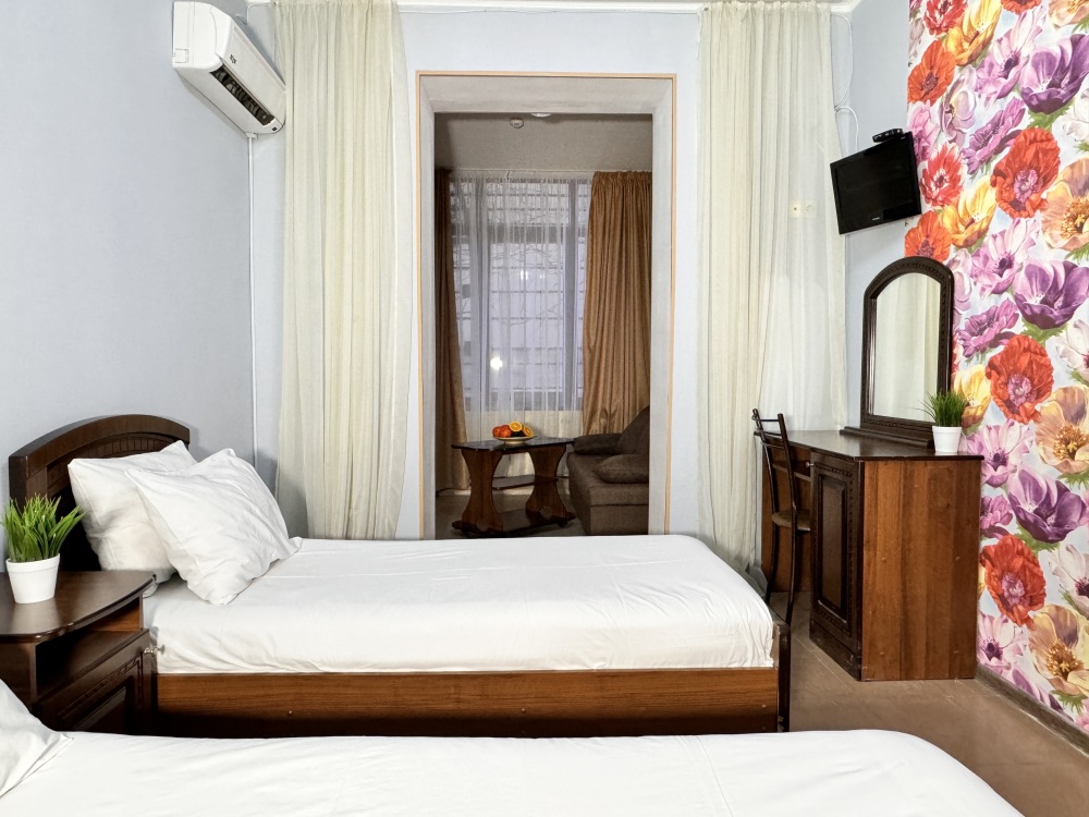 В номере имеется: двуспальная кровать, диван-кровать (140 см), односпальная кровать, прикроватные тумбочки, туалетный столик, зеркало, шкаф, стул, журнальный столик, телевизор, мини-холодильник, кондиционер.