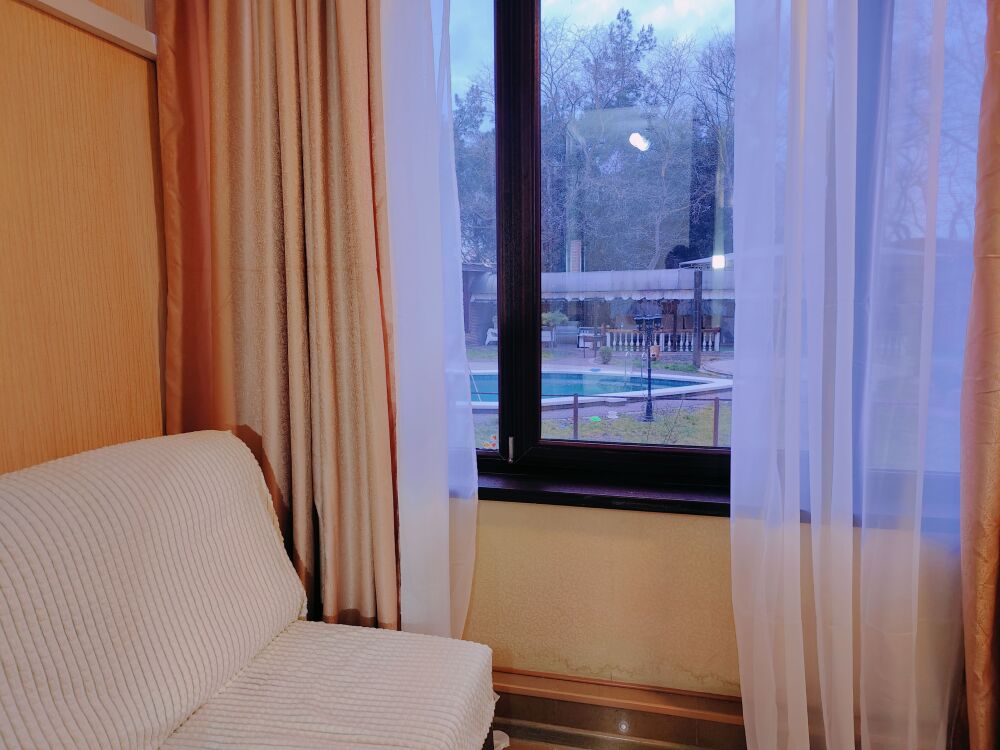 Номер категории «стандарт» находится на цокольном этаже, вид из окна на столовую и территорию отеля