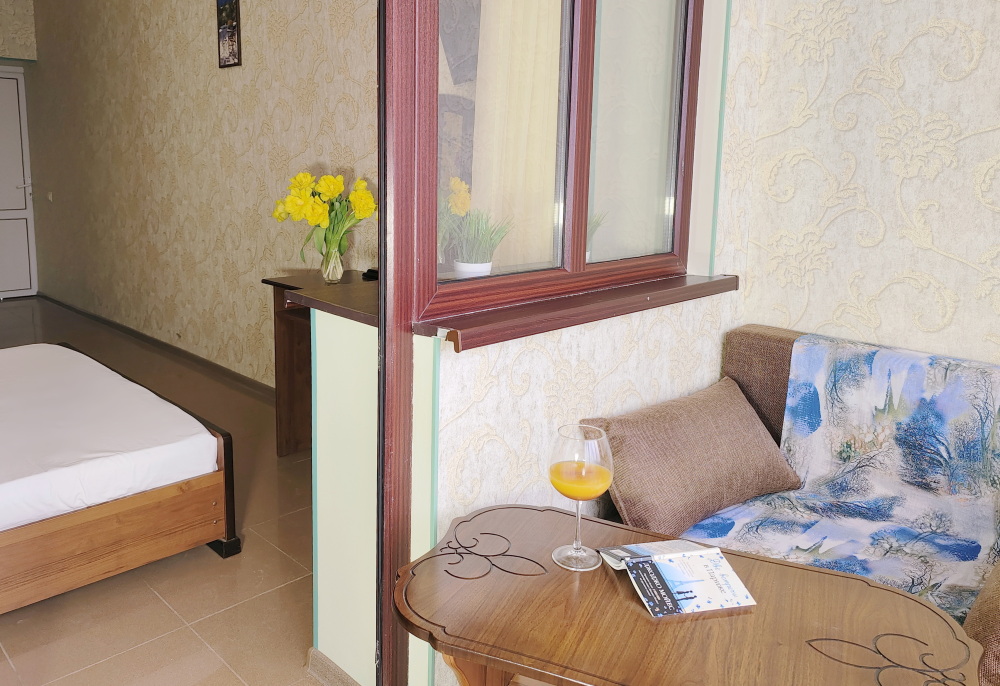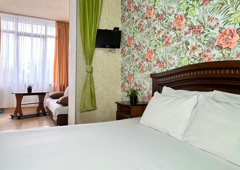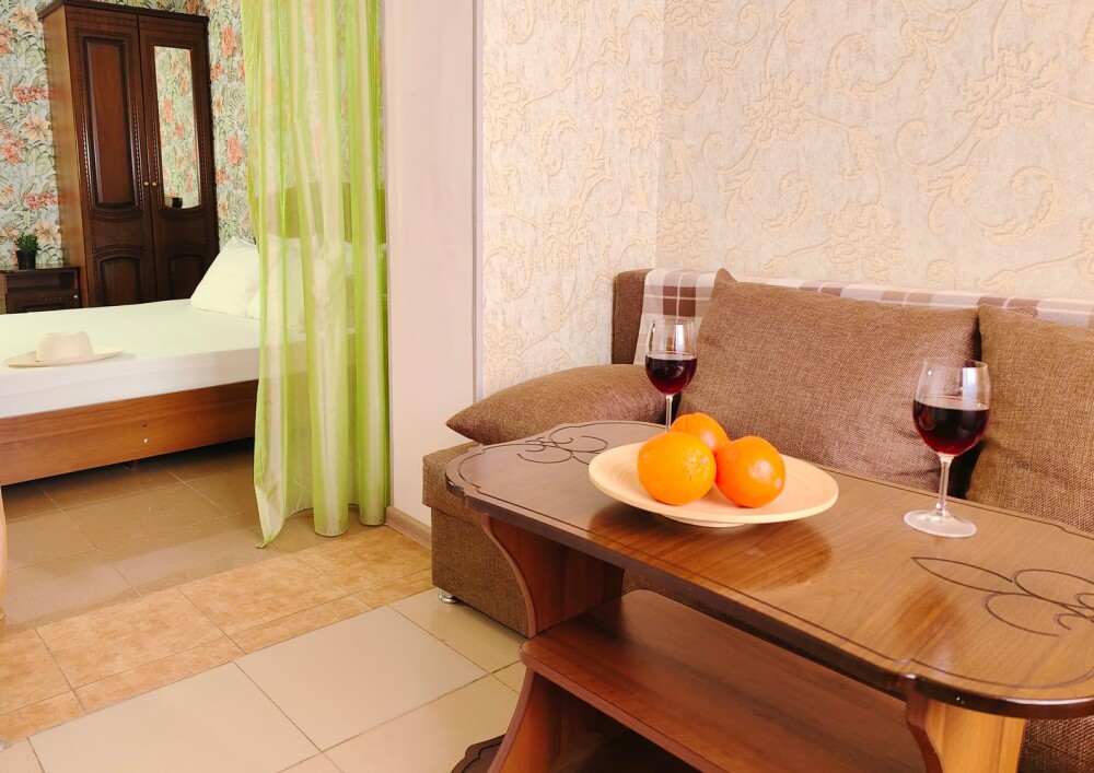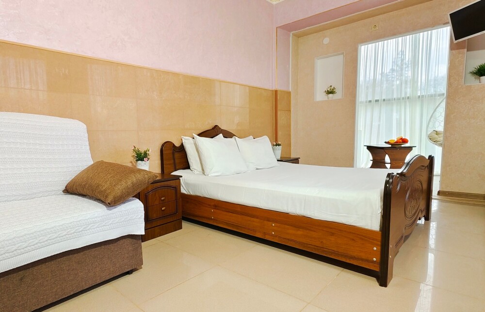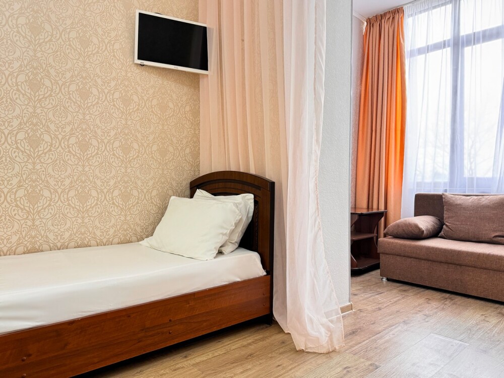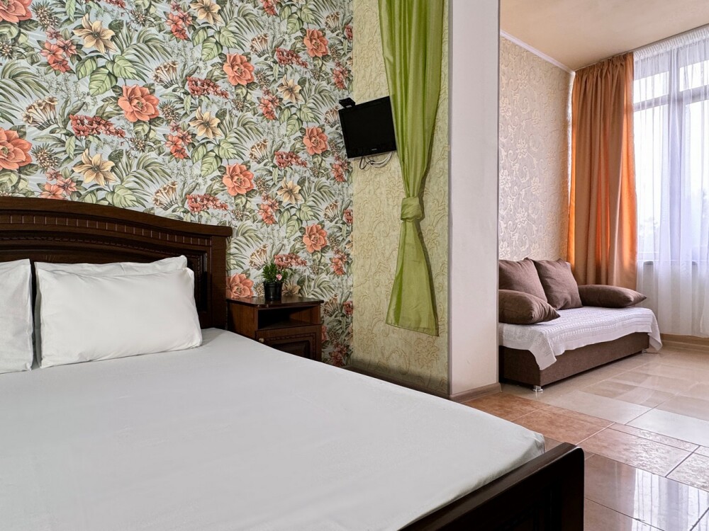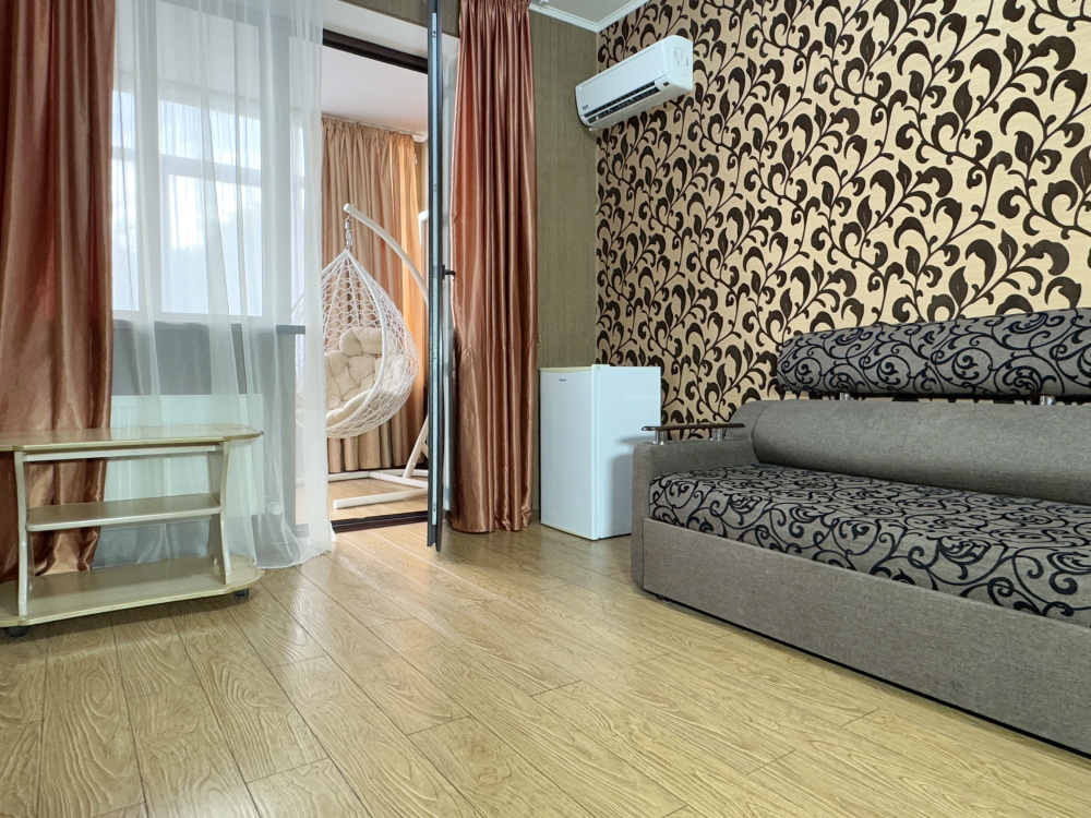 Просторный однокомнатный номер с возможность размещения до 5ти человек. В номере имеется: двуспальная кровать, диван-кровать, кресло-кровать, прикроватные тумбочки, журнальный столик, шкаф, телевизор, мини-холодильник, кондиционер. На лоджии находится кресло-кокон.