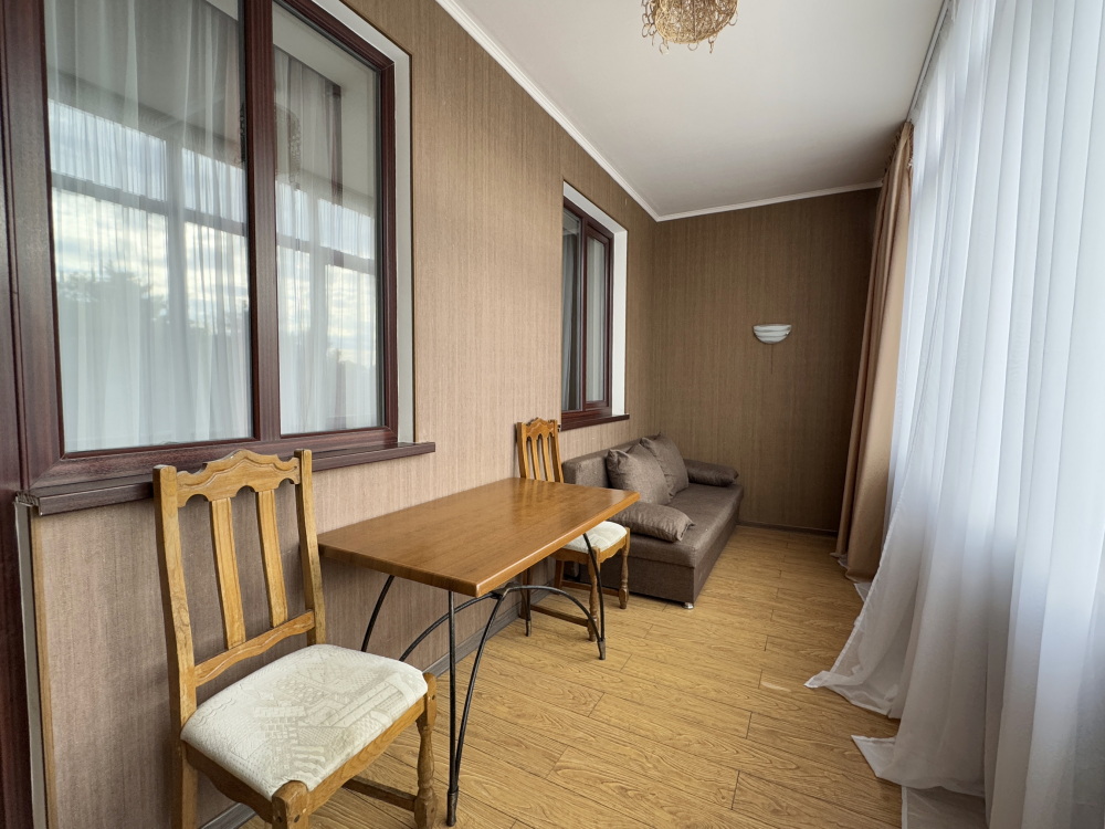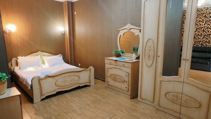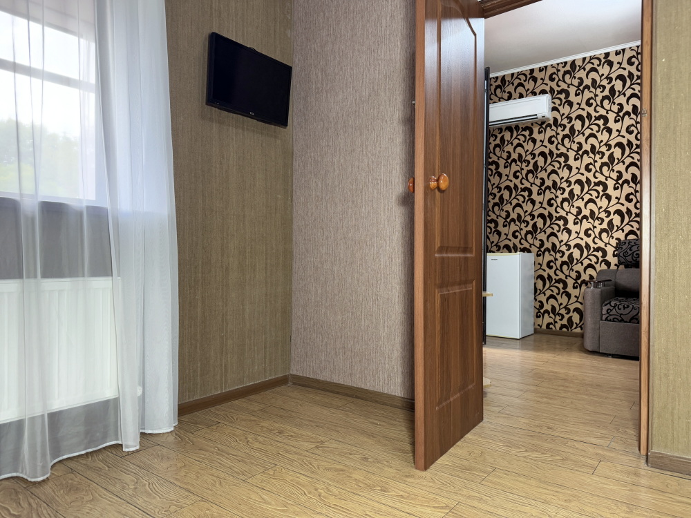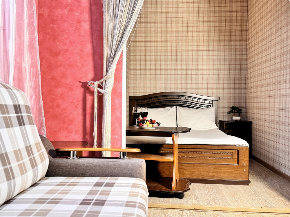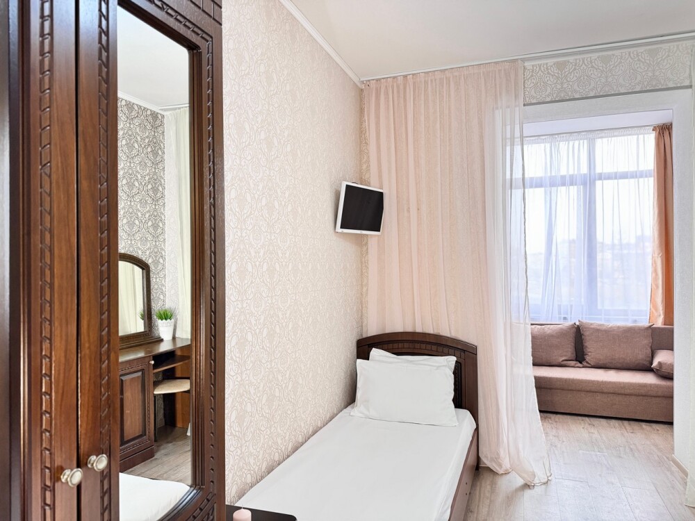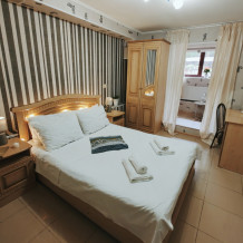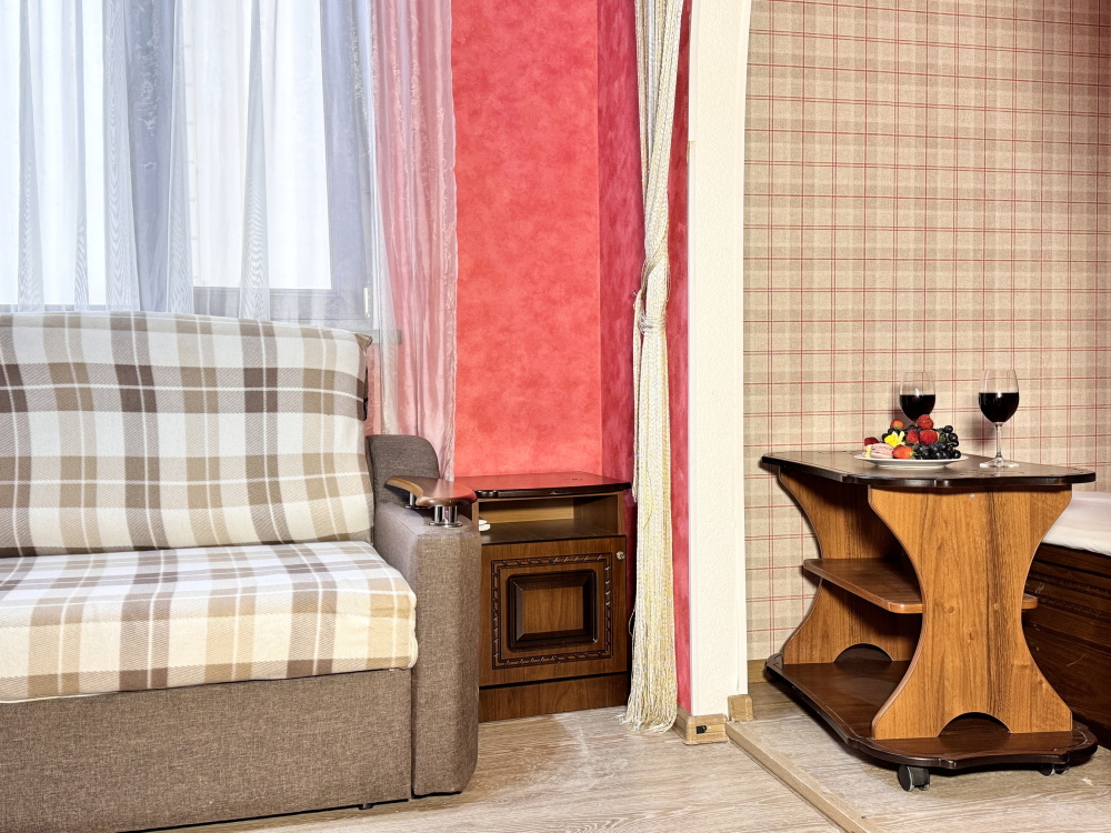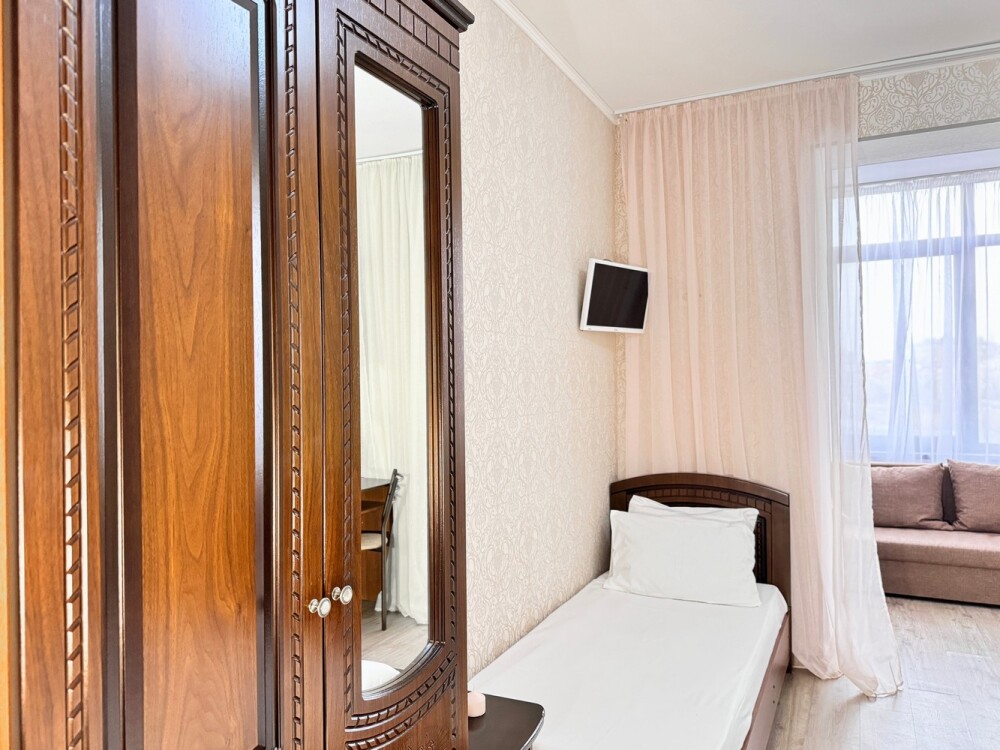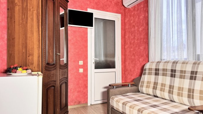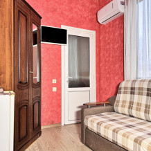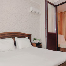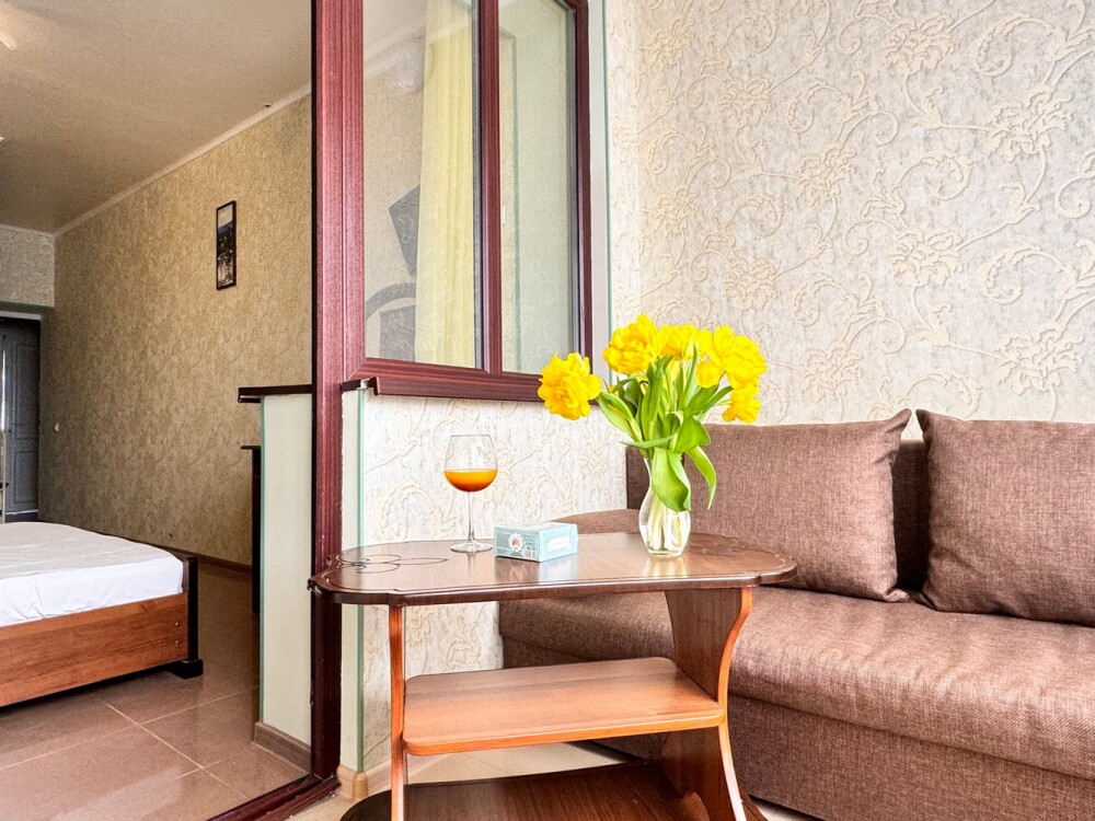Просторный однокомнатный номер с возможность размещения до 5ти человек. В номере имеется: двуспальная кровать, диван-кровать, кресло-кровать, прикроватные тумбочки, журнальный столик, шкаф, телевизор, мини-холодильник, кондиционер. На лоджии находится кресло-кокон.