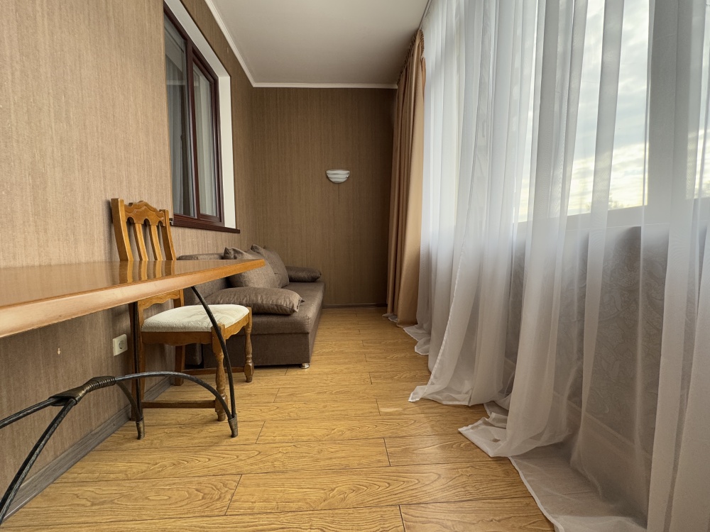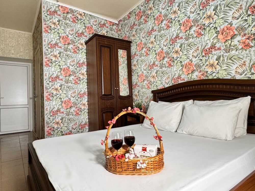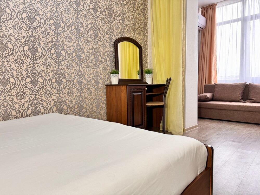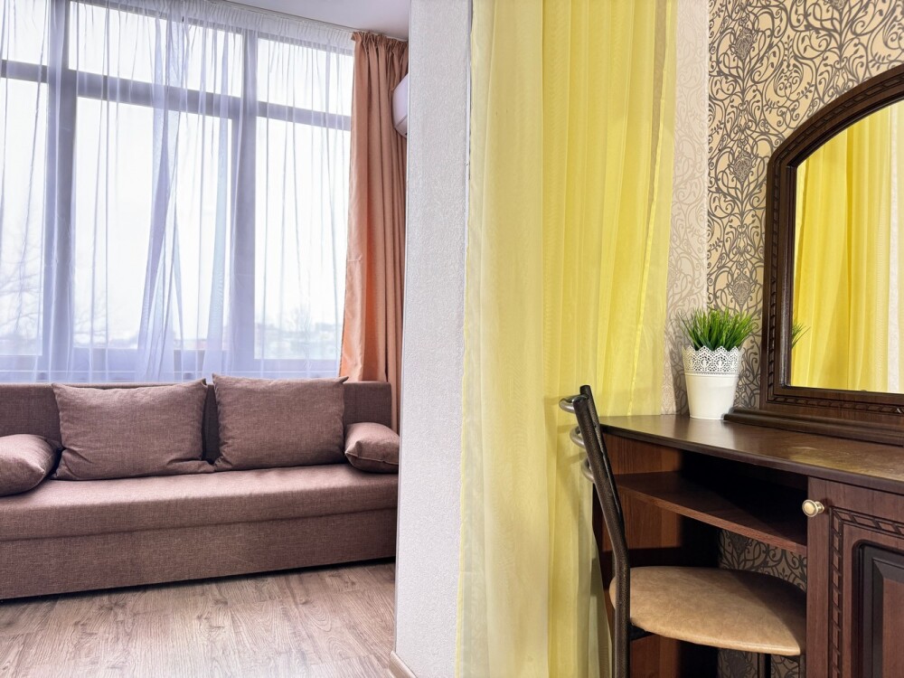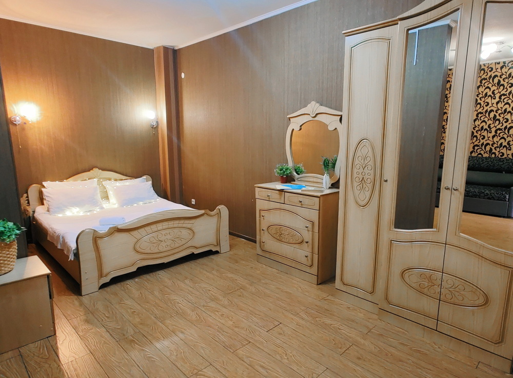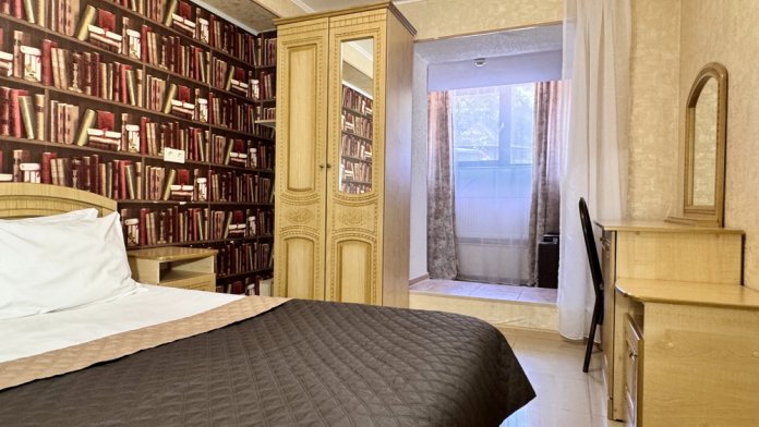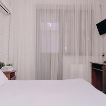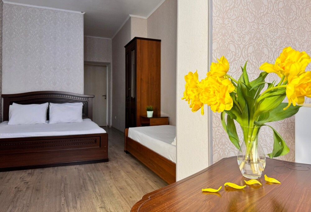 Просторный однокомнатный номер с возможность размещения до 5ти человек. В номере имеется: двуспальная кровать, диван-кровать, кресло-кровать, прикроватные тумбочки, журнальный столик, шкаф, телевизор, мини-холодильник, кондиционер. На лоджии находится кресло-кокон.
