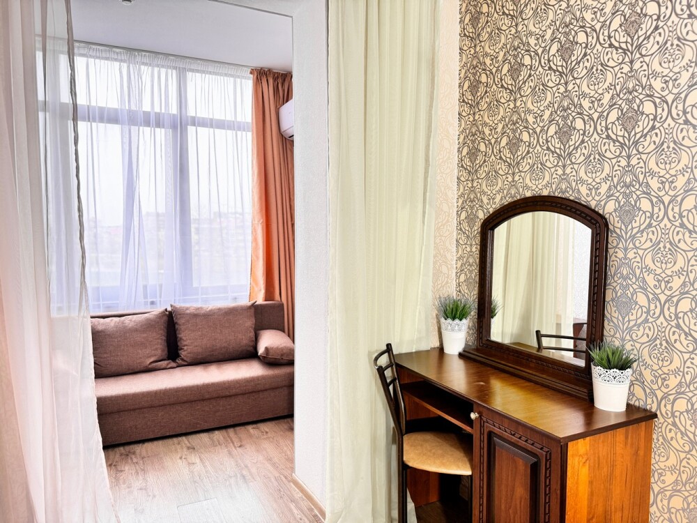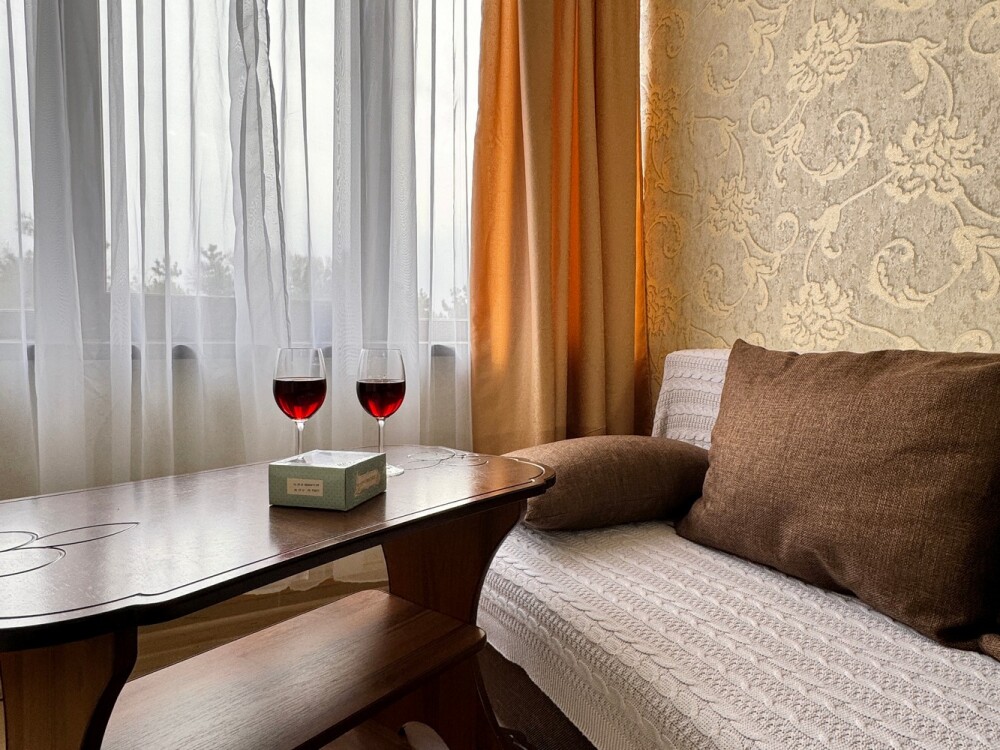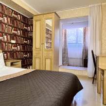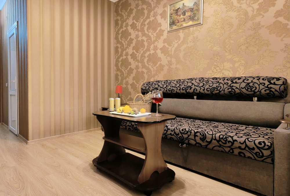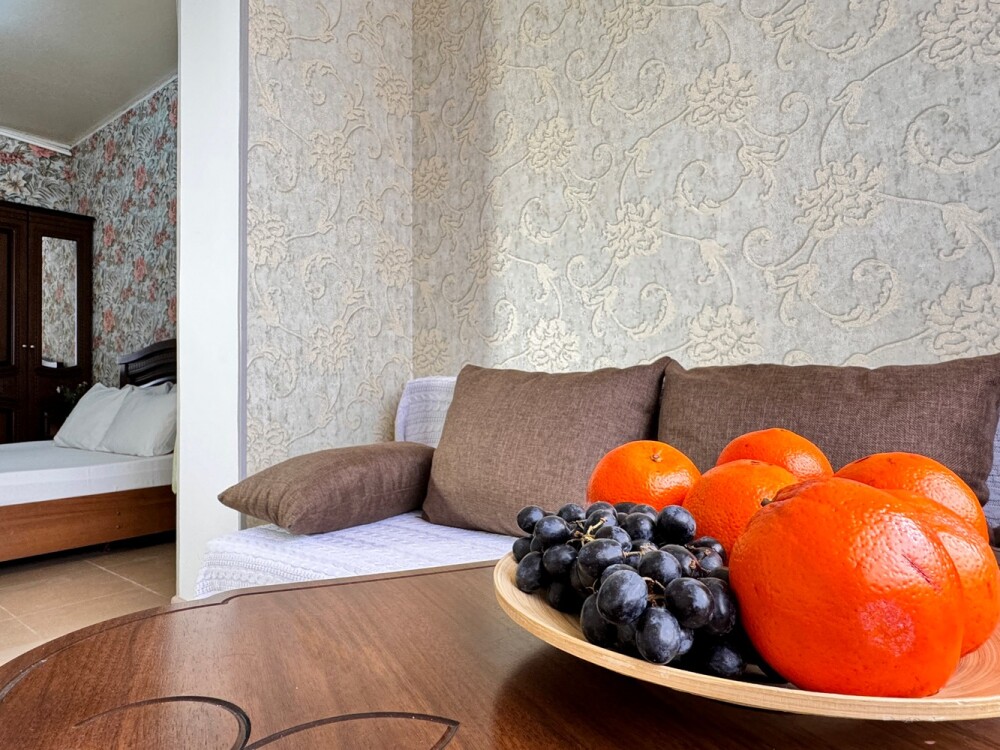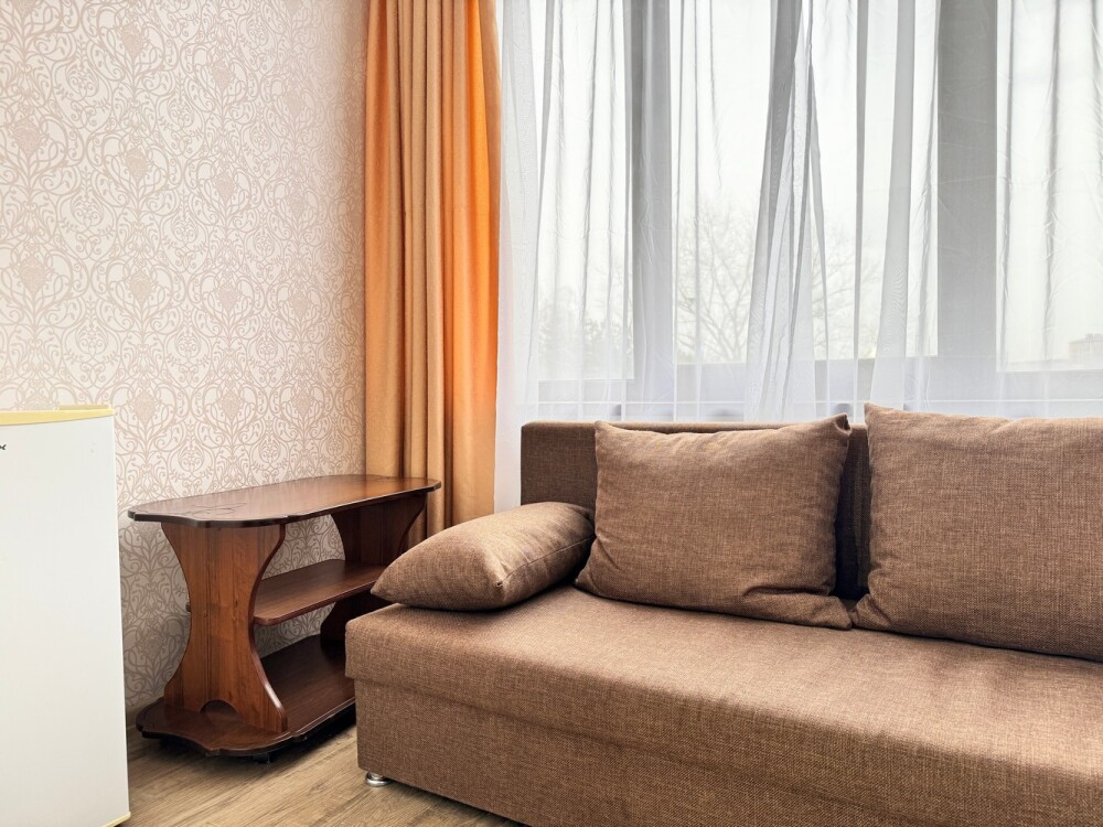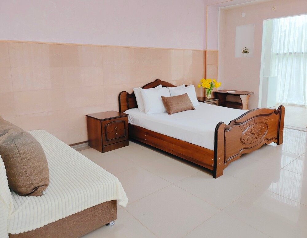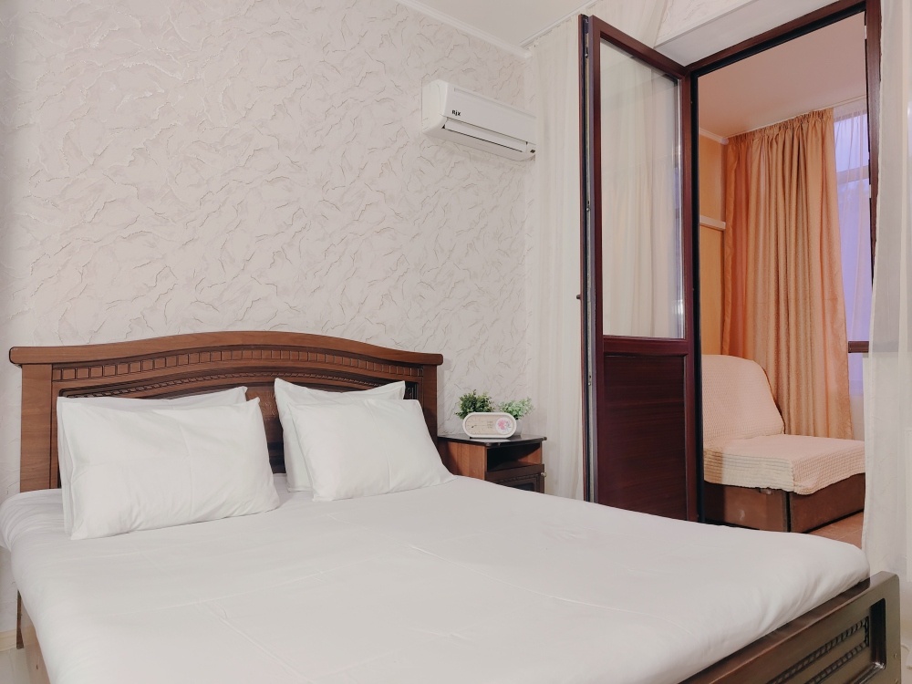 Просторный однокомнатный номер с возможность размещения до 5ти человек. В номере имеется: двуспальная кровать, диван-кровать, кресло-кровать, прикроватные тумбочки, журнальный столик, шкаф, телевизор, мини-холодильник, кондиционер. На лоджии находится кресло-кокон.