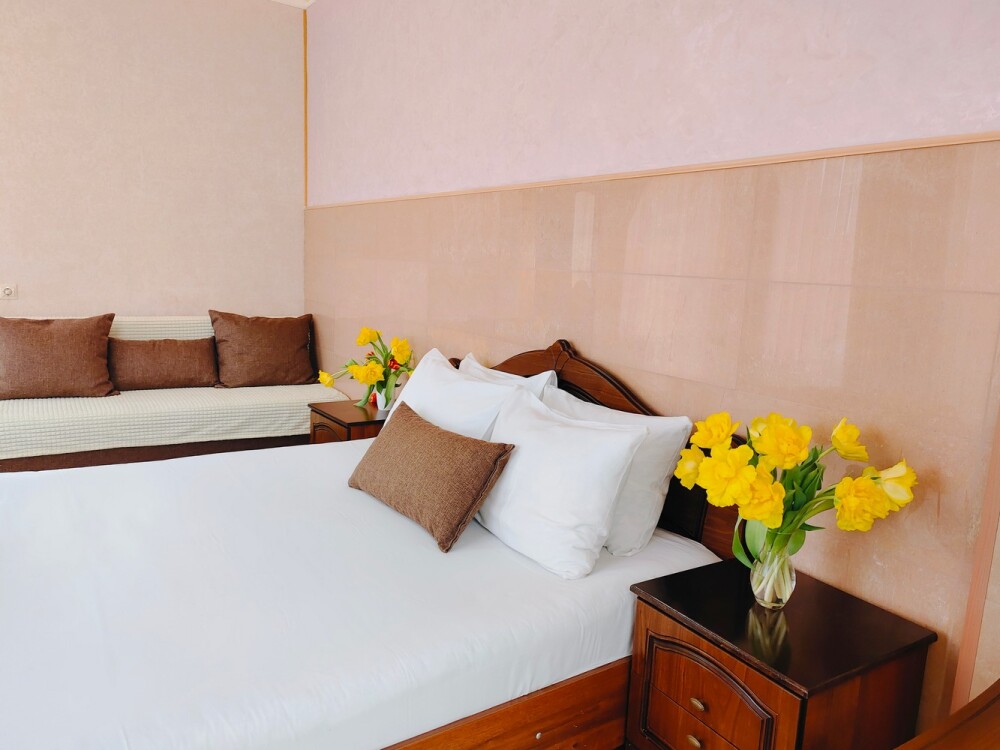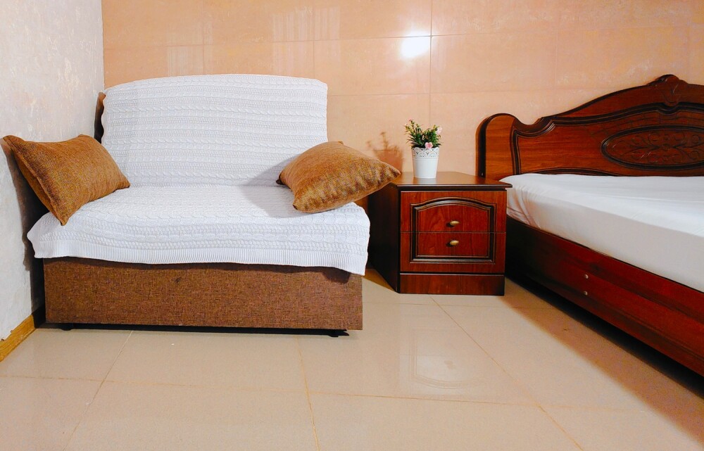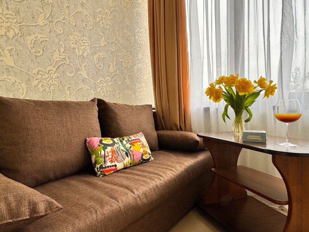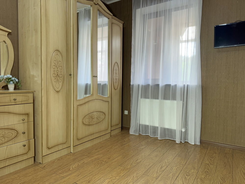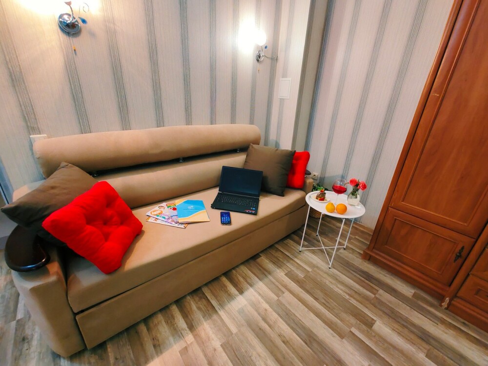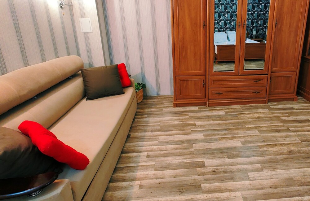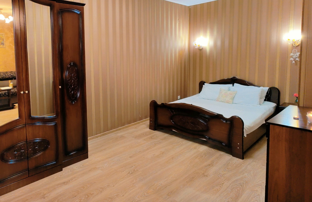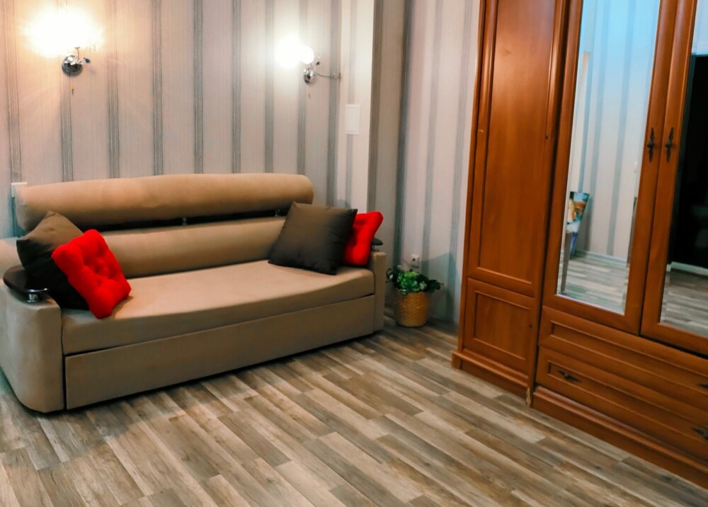 Просторный однокомнатный номер с возможность размещения до 5ти человек. В номере имеется: двуспальная кровать, диван-кровать, кресло-кровать, прикроватные тумбочки, журнальный столик, шкаф, телевизор, мини-холодильник, кондиционер. На лоджии находится кресло-кокон.