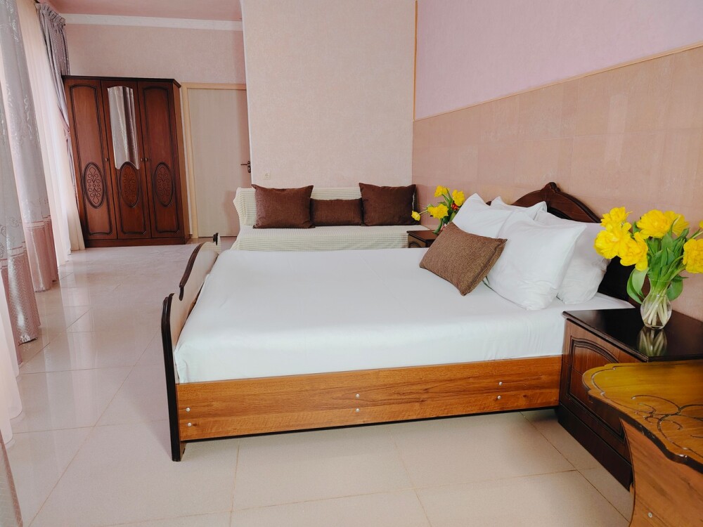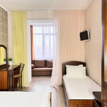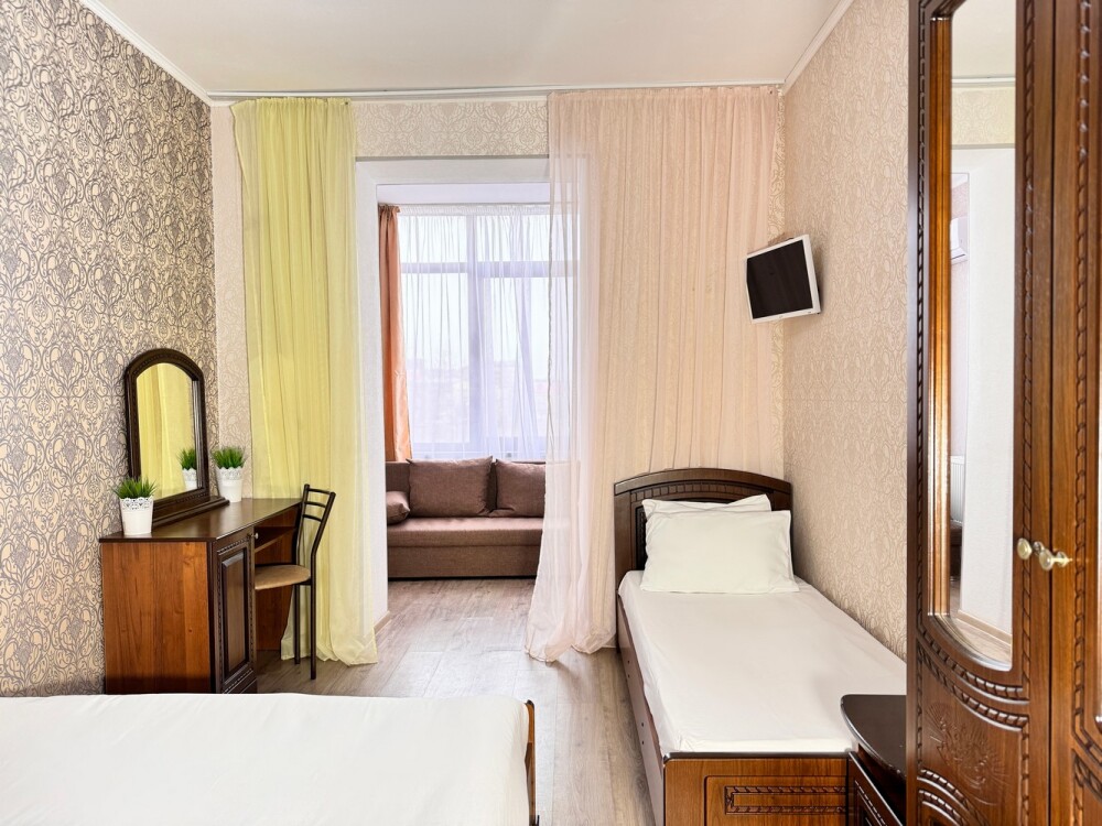 Четырехместный номер комфорт с видом на столовую и территорию отеля. Номер оснащен: двуспальная кровать или две односпальные кровати, диван-кровать (140 см), прикроватные тумбочки, туалетный столик, зеркало, стул, журнальный столик, шкаф, телевизор, мини-холодильник, кондиционер.