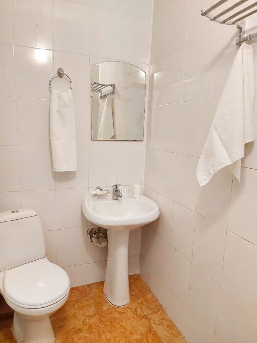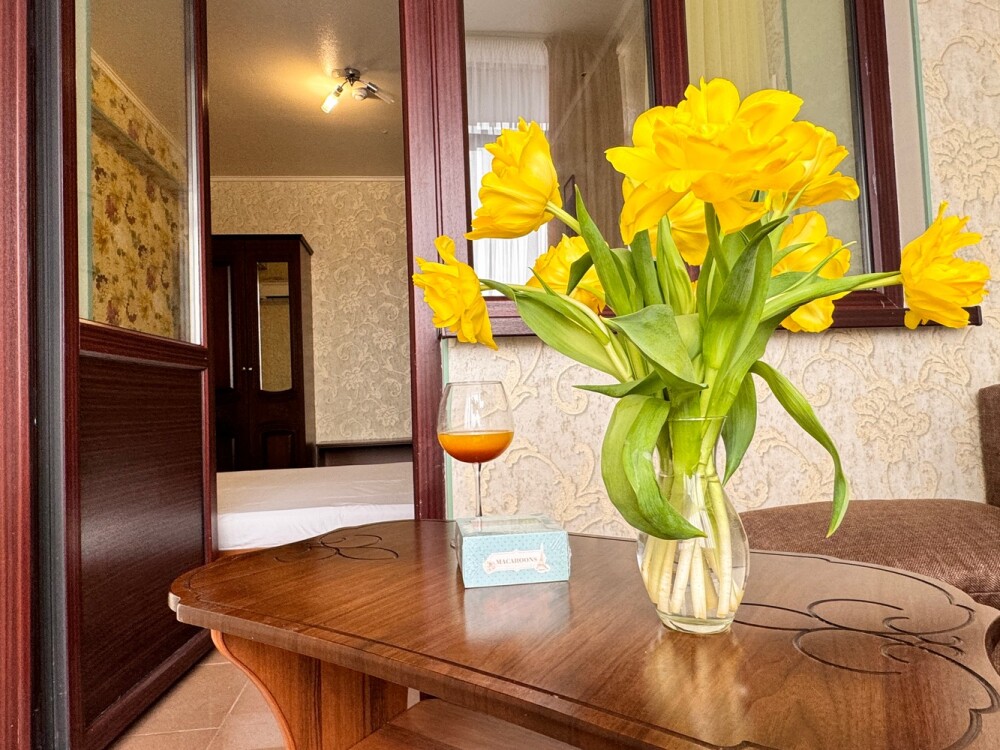 Оснащение номера: двуспальная кровать или две односпальные кровати, кресло-кровать, прикроватные тумбочки, туалетный столик, зеркало, шкаф, журнальный столик, телевизор, мини-холодильник, кондиционер.