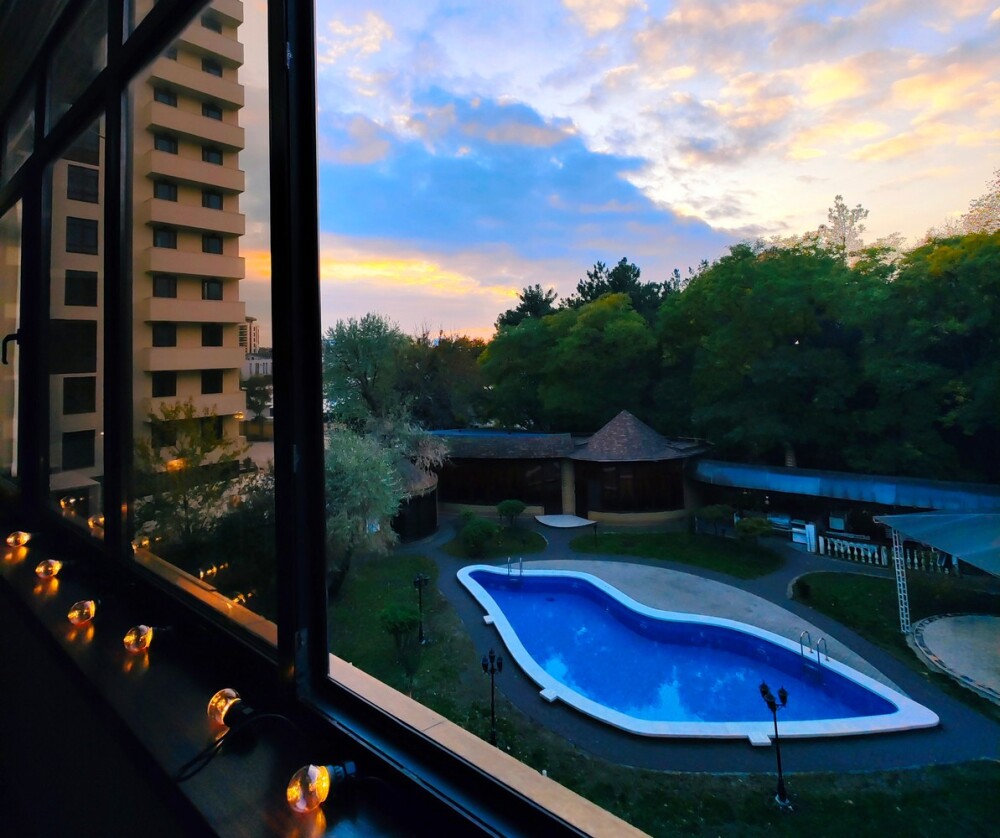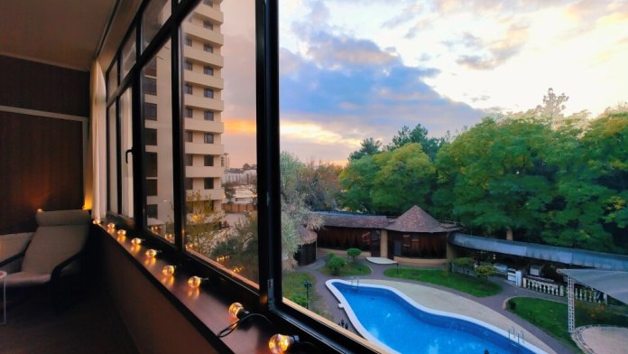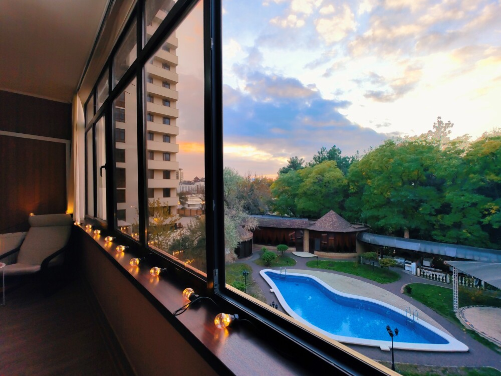 В номере имеется небольшая лоджия с видом на бассейн и двор отеля.