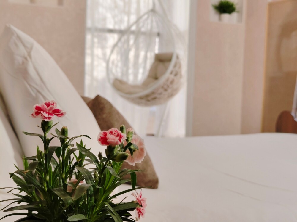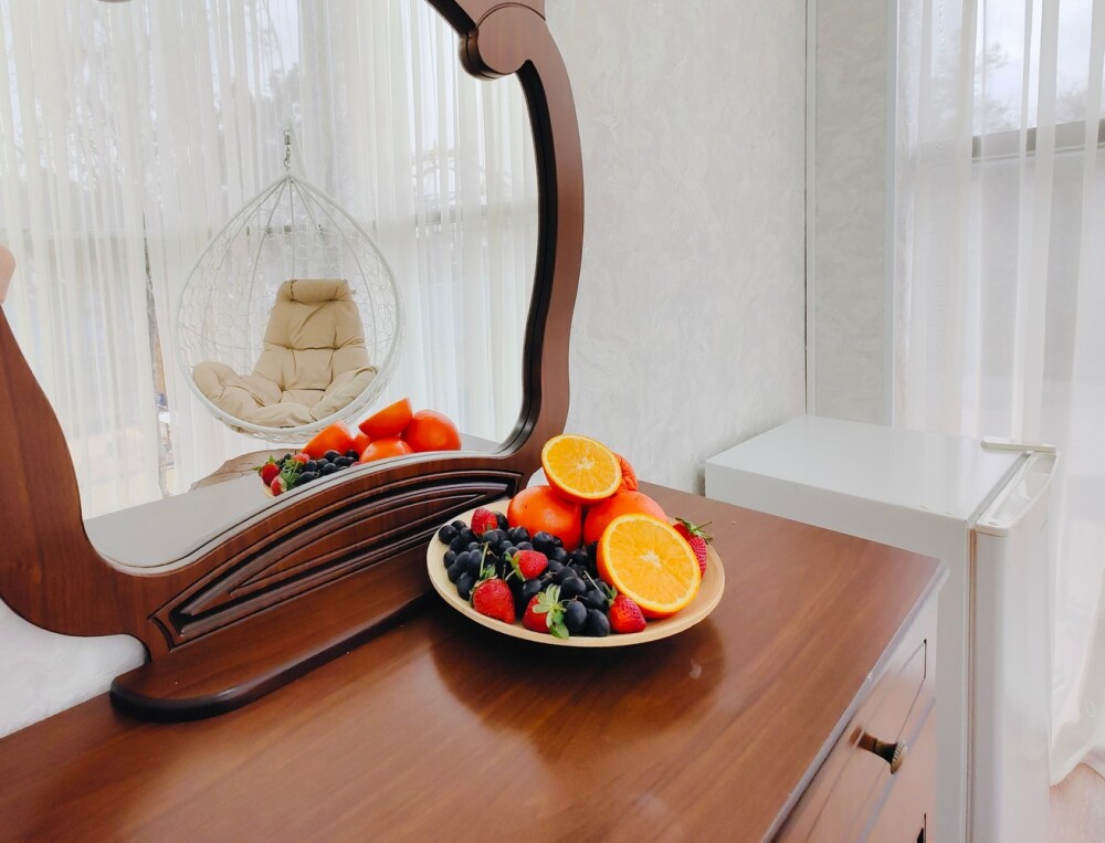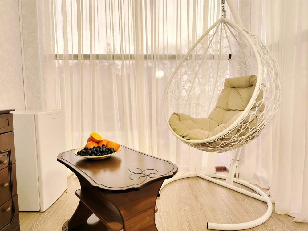 Номер оснащен: двуспальная кровать, кресло-кровать, прикроватные тумбочки, комод, зеркало, шкаф, телевизор, мини-холодильник, кондиционер, кресло-кокон.