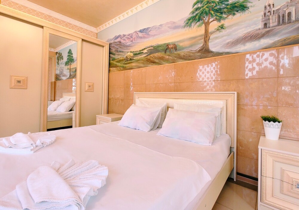 Номер оснащен: двуспальная кровать или две односпальные кровати, кресло-кровать, туалетный столик, зеркало, журнальный столик, прикроватные тумбочки, шкаф, телевизор, мини-холодильник, кондиционер.