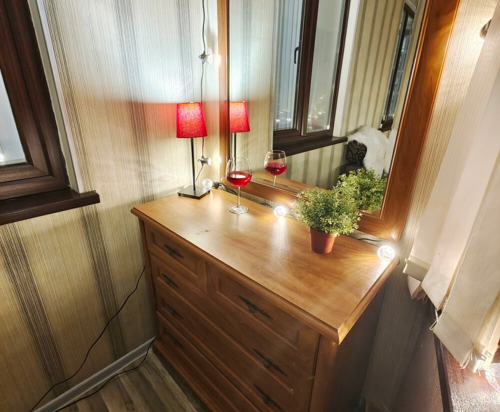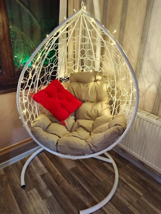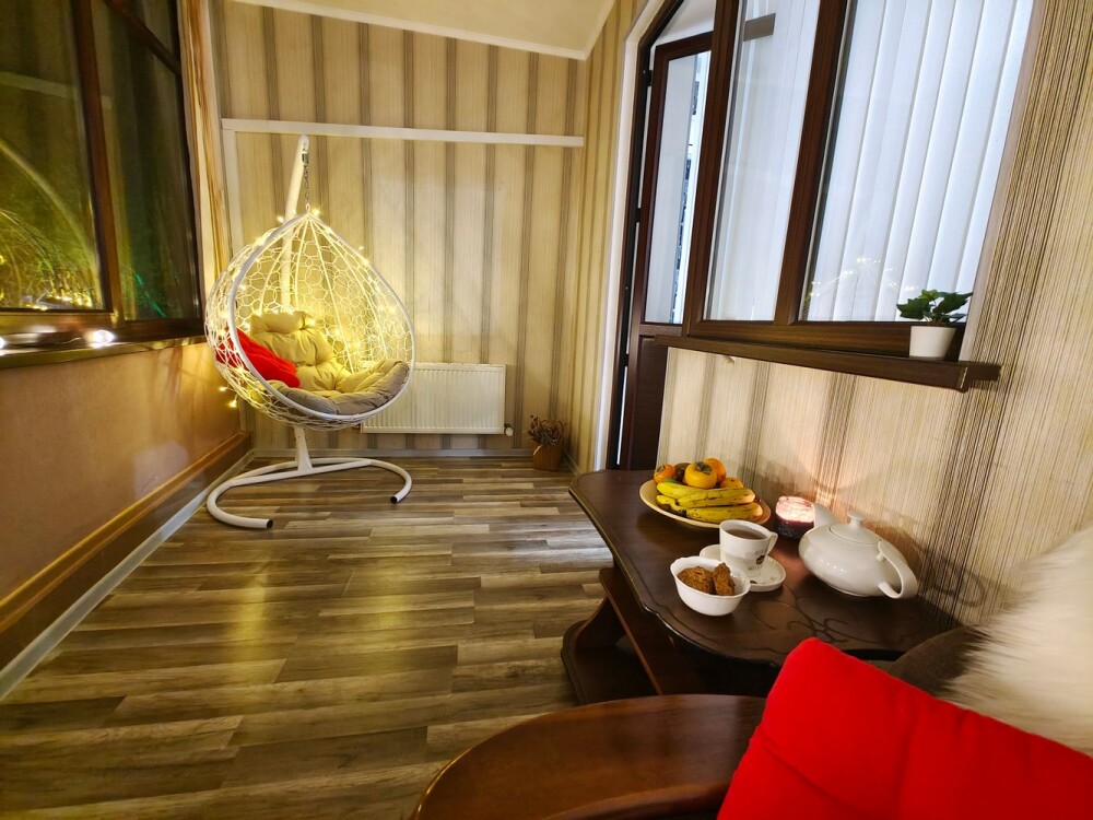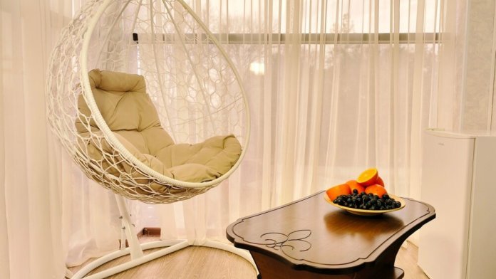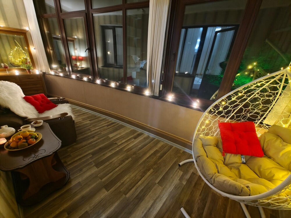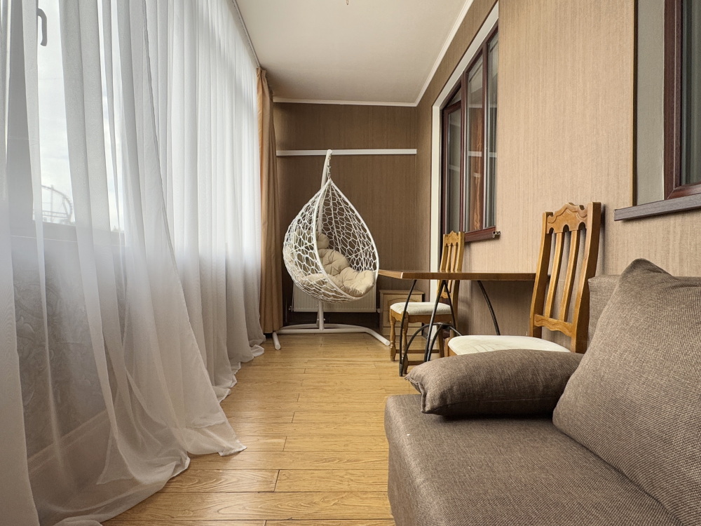 На лоджии находится кресло-кокон, кресло-кровать, журнальный столик.