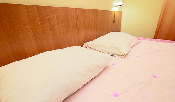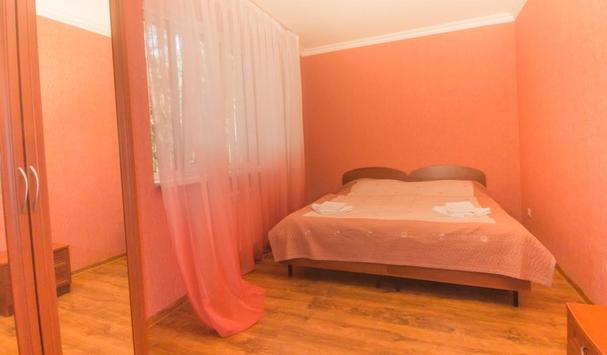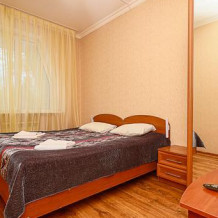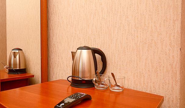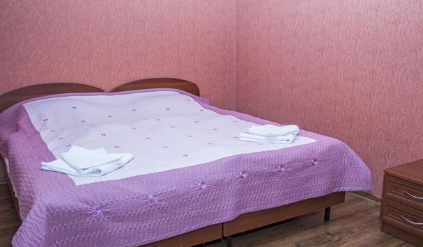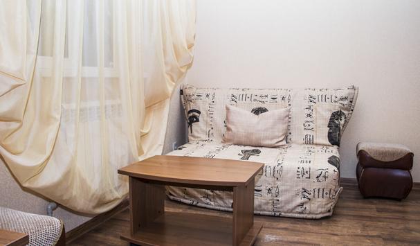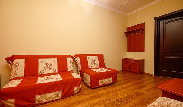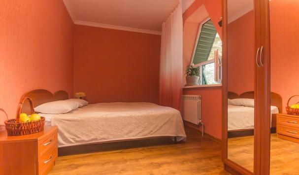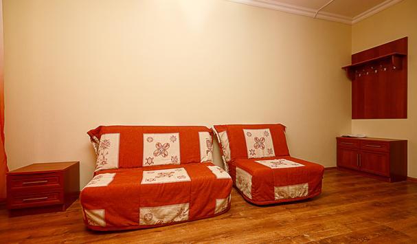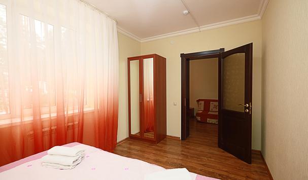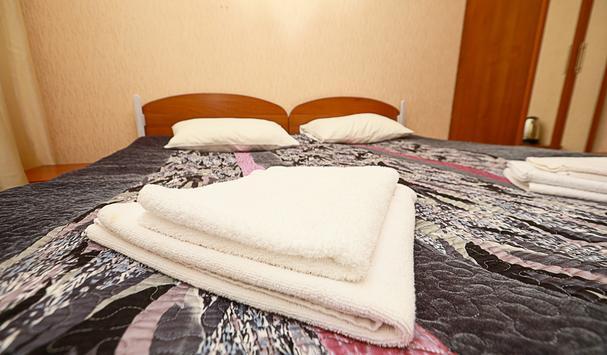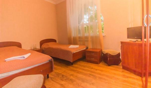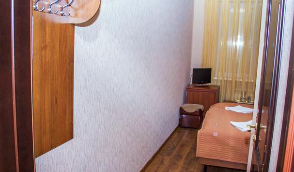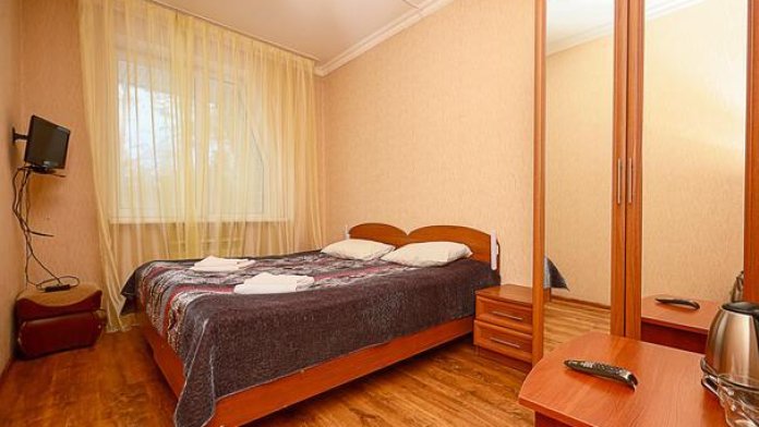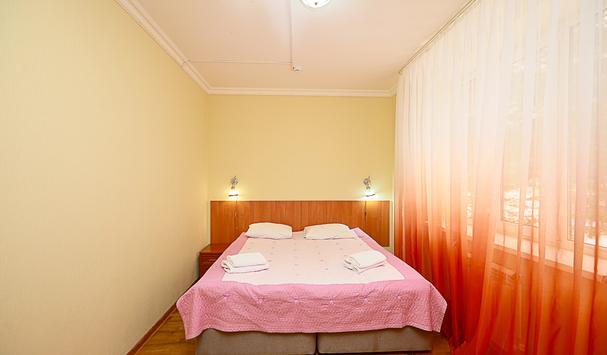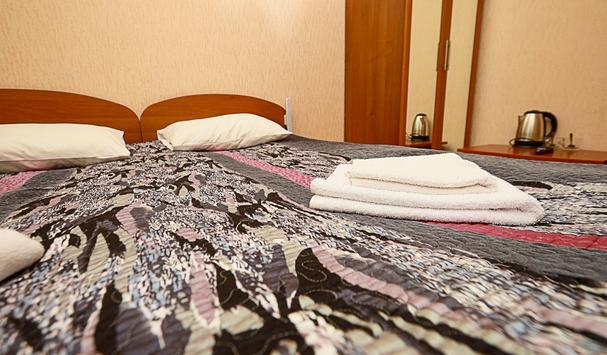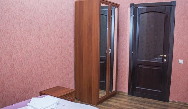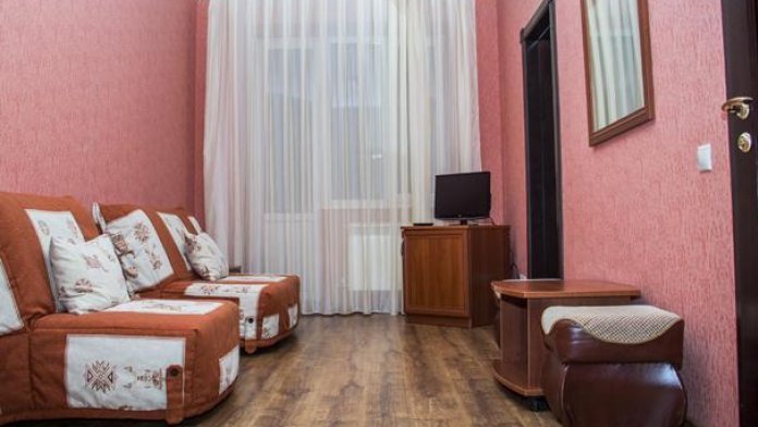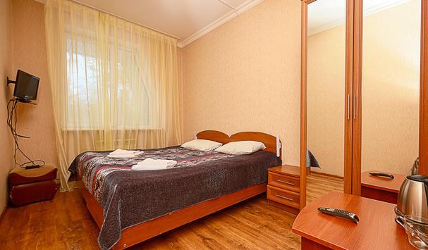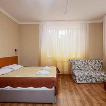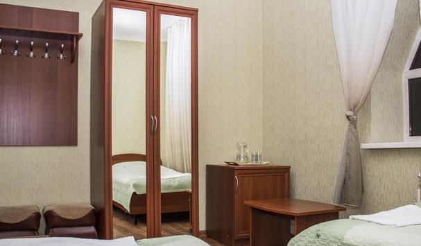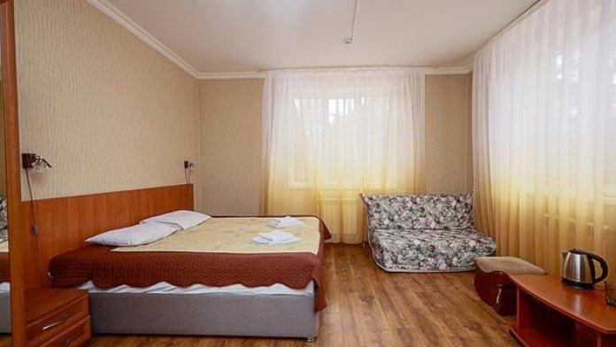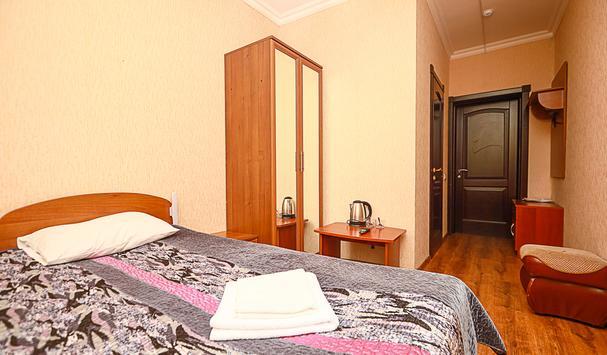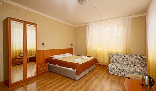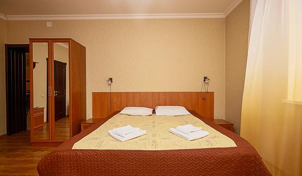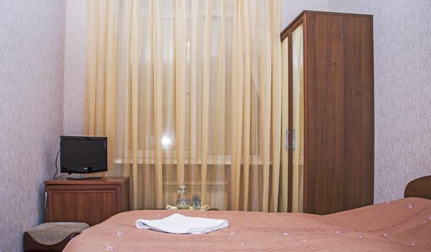 В номере: двухместная кровать (можно поставить отдельно), шкаф, телевизор, тумбочки, журнальный столик, пуфики, в душе туалетные принадлежности.