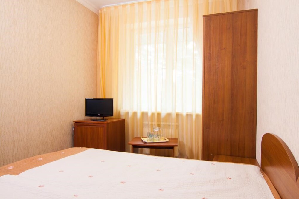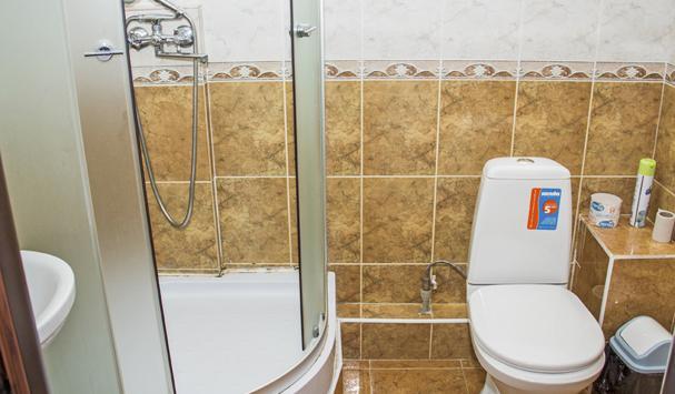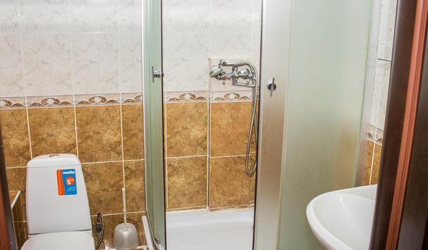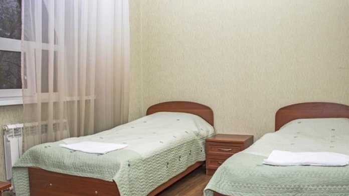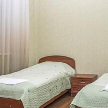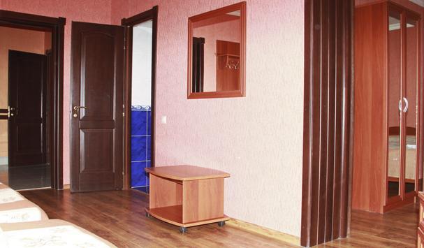 В номере: шкаф, телевизор, 2 кровати, журнальный столик, тумбочки, пуфики, 1 душ и санузел на 2 номера, т. е. на 4 человека.
