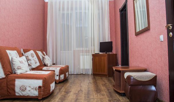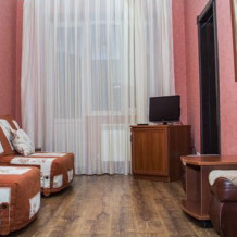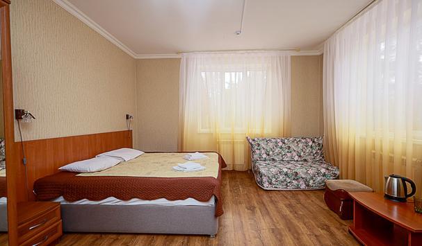 В номере: двухместная кровать, мягкая мебель, телевизор, шкаф, тумбочки, журнальный столик, пуфики. В душевой туалетные принадлежности. Максимально 3 человека.