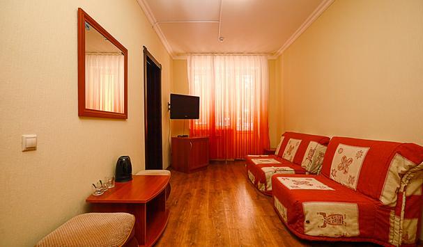 В номере: спальня с двухместной кроватью, шкаф, тумбочки. В гостиной телевизор, мягкая мебель, журнальный столик, пуфики, балкон, душ, туалетные принадлежности, фен. Максимально до 4 человека.