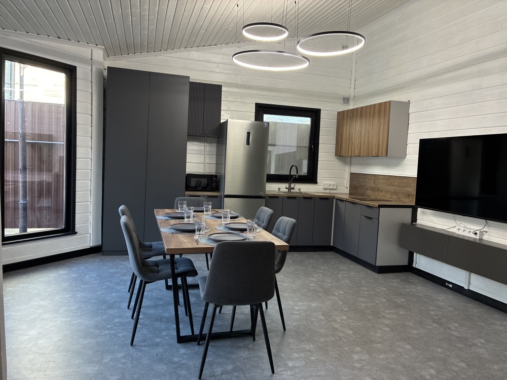 Дом оборудован всем необходимым: автономное водоснабжение , большой обеденный стол, ТЕПЛЫЕ полы во всех комнатах и система климат контроля, бытовая техника и удобные кровати, телевидение и интернет, мангал и терраса на свежем воздухе, игровой уголок для детей.
