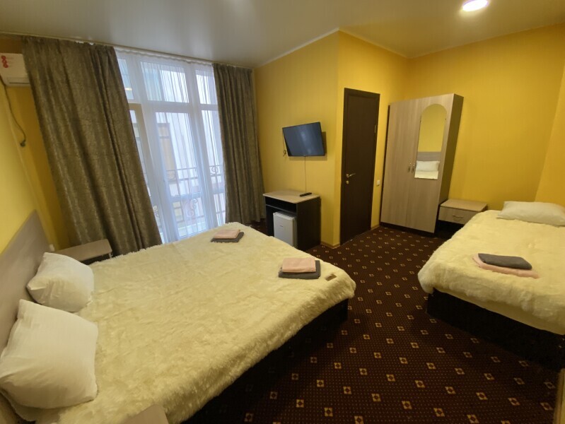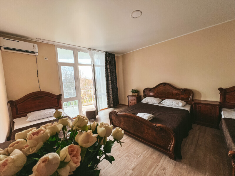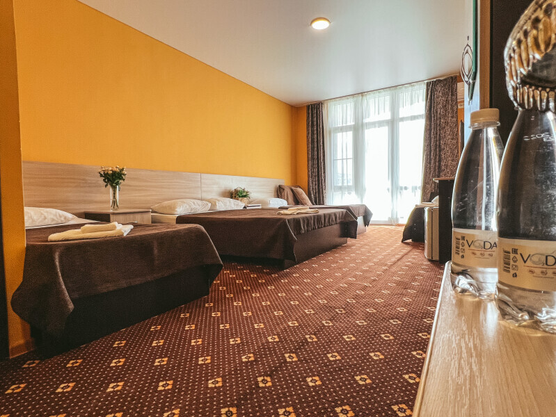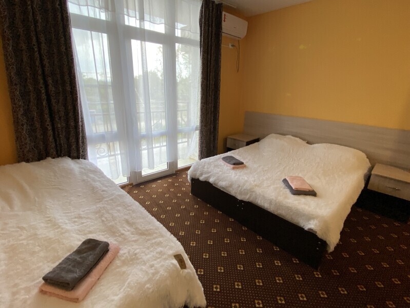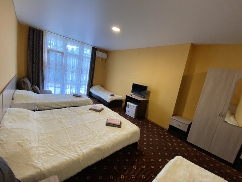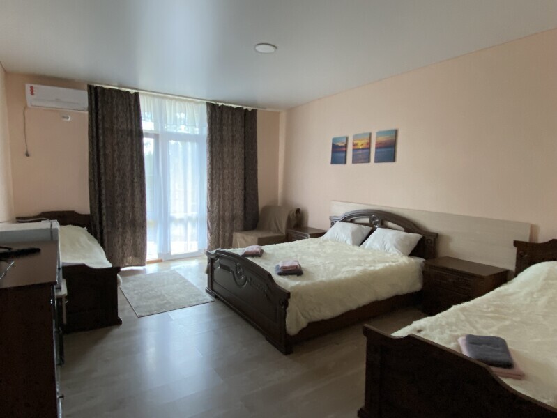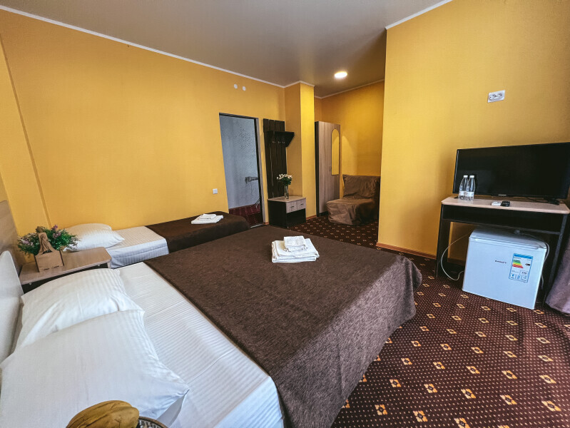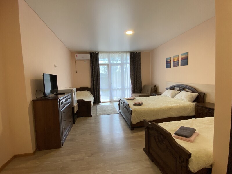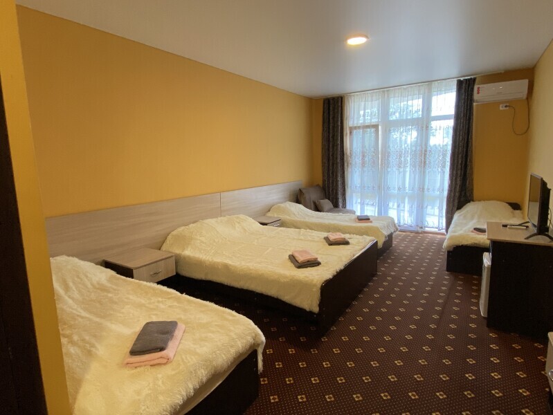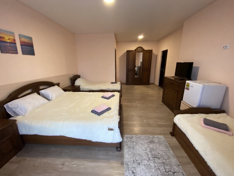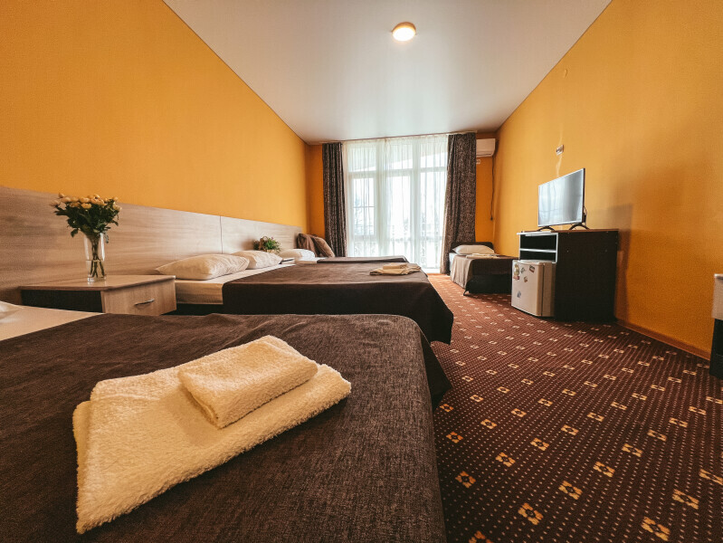 В номере: одна двуспальная и одна односпальная или три односпальные кровати, ортопедические матрацы, прикроватные тумбочки, шкаф для одежды, стол, телевизор, Wi-Fi, кондиционер, мини-холодильник, чайник, фен, набор полотенец, постельное белье, собственный с/у с душем, туалетно-косметические принадлежности, шторы блэкаут, балкон.